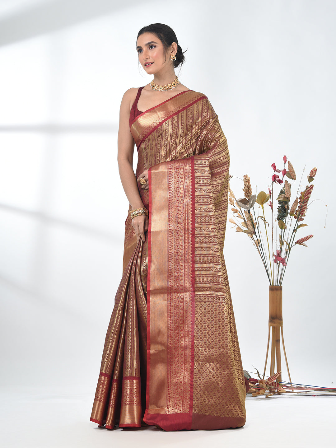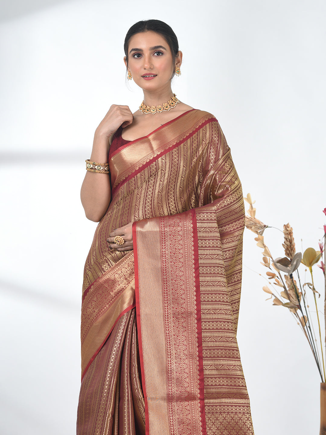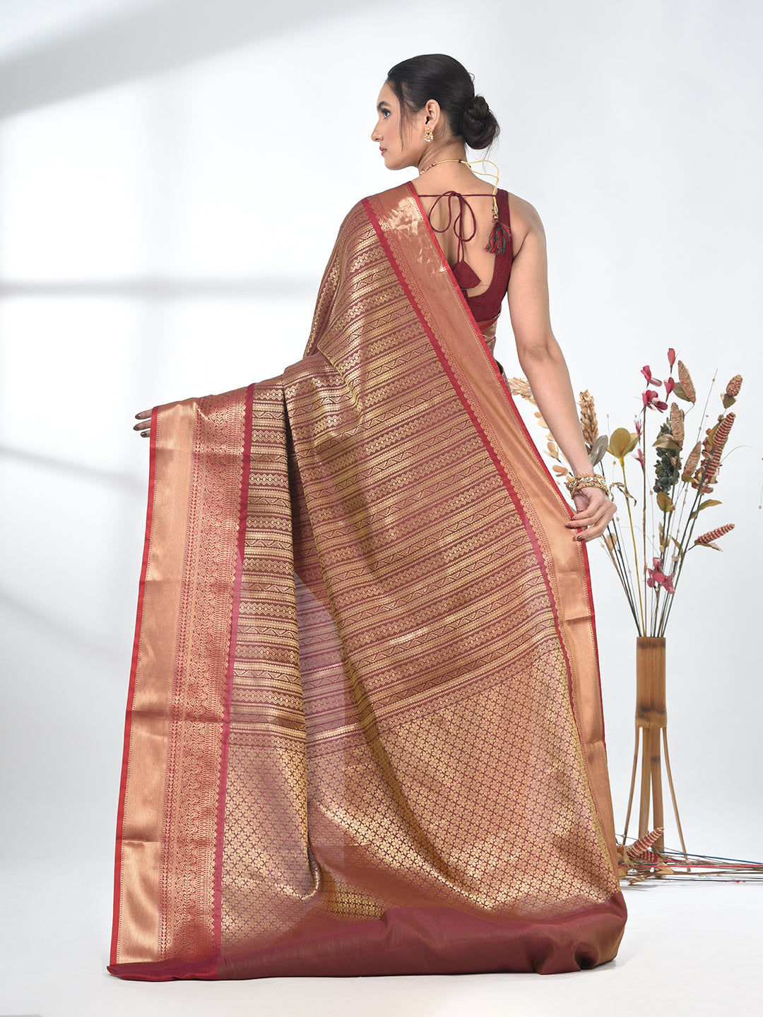 This elegant brown brocade saree is a perfect blend of traditional craftsmanship and modern elegance. Featuring intricate gold and red patterns, it is beautifully complemented by a rich brocade fabric that exudes sophistication. The saree is ideal for weddings, festivals, or any special occasion. Paired with a matching blouse, this saree makes for a timeless addition to any wardrobe.