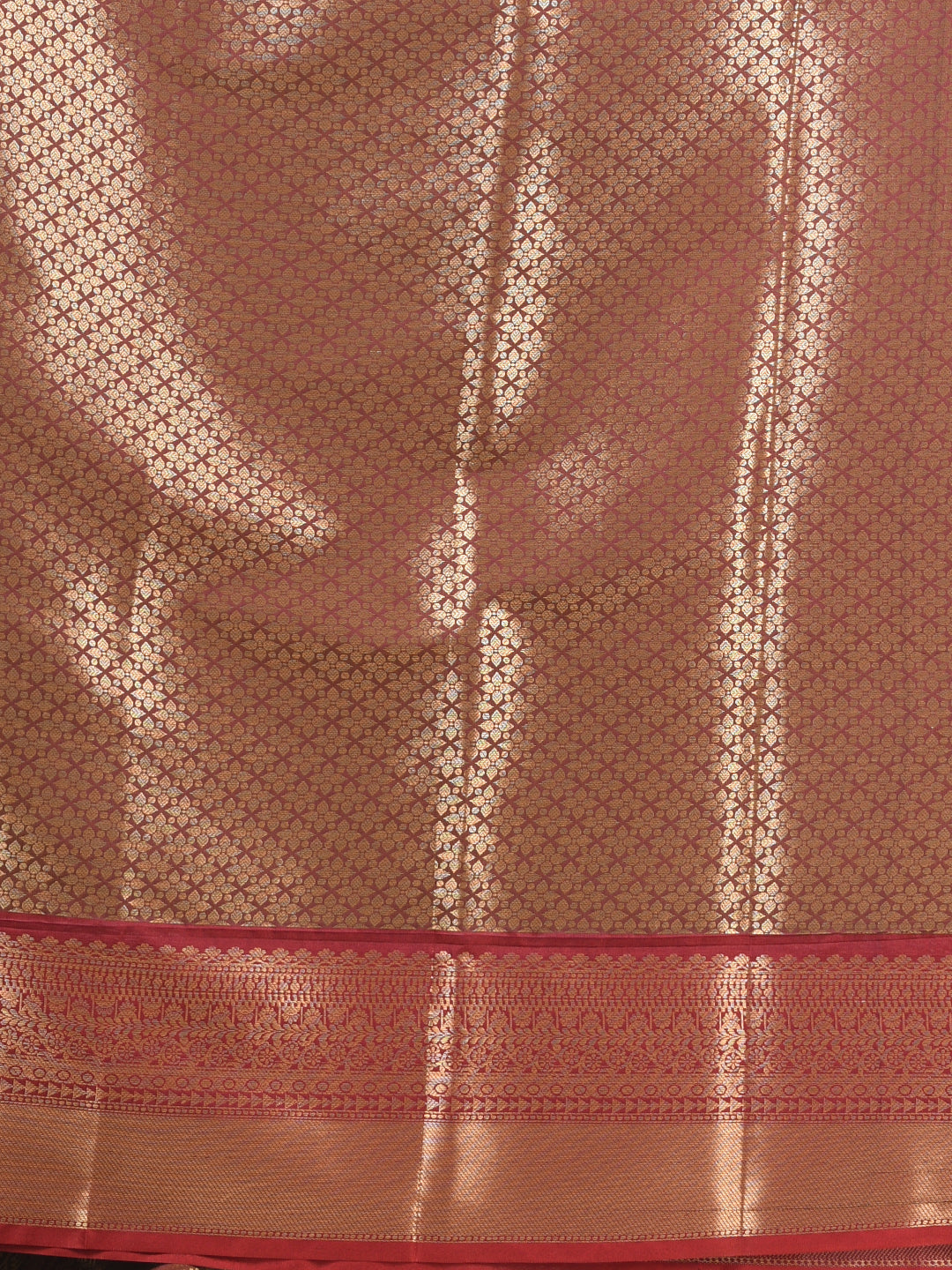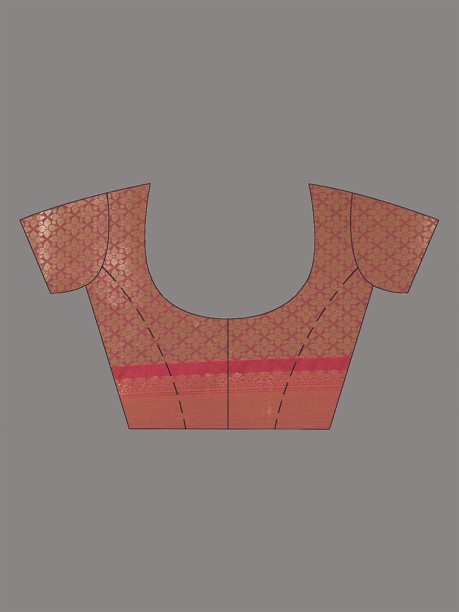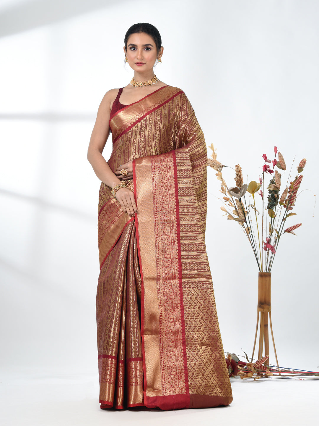 This elegant brown brocade saree is a perfect blend of traditional craftsmanship and modern elegance. Featuring intricate gold and red patterns, it is beautifully complemented by a rich brocade fabric that exudes sophistication. The saree is ideal for weddings, festivals, or any special occasion. Paired with a matching blouse, this saree makes for a timeless addition to any wardrobe.