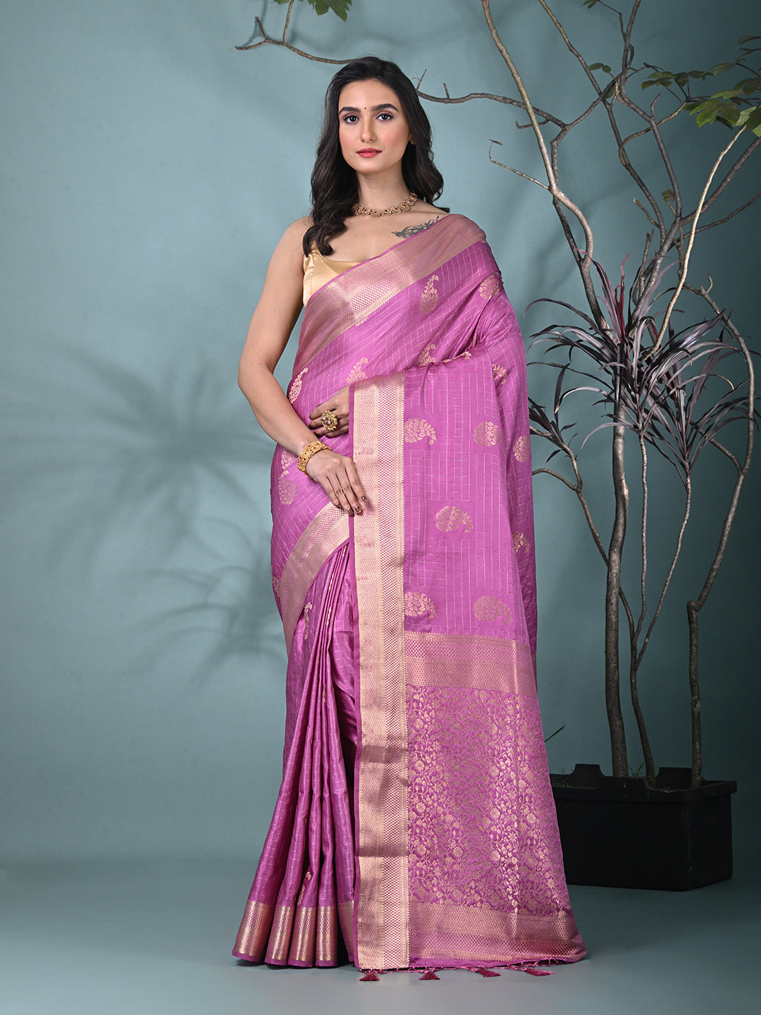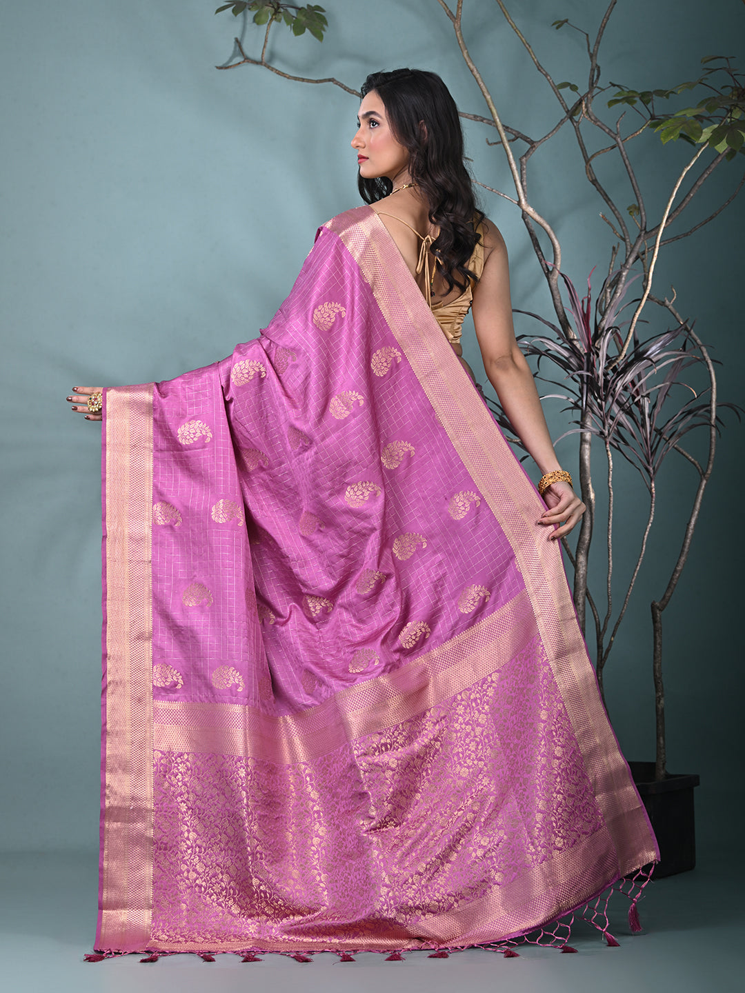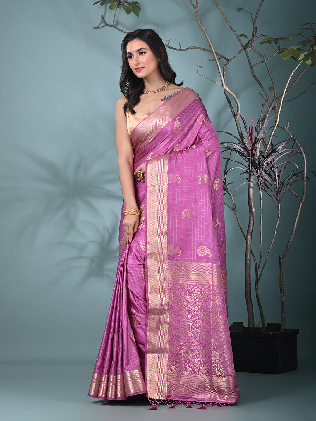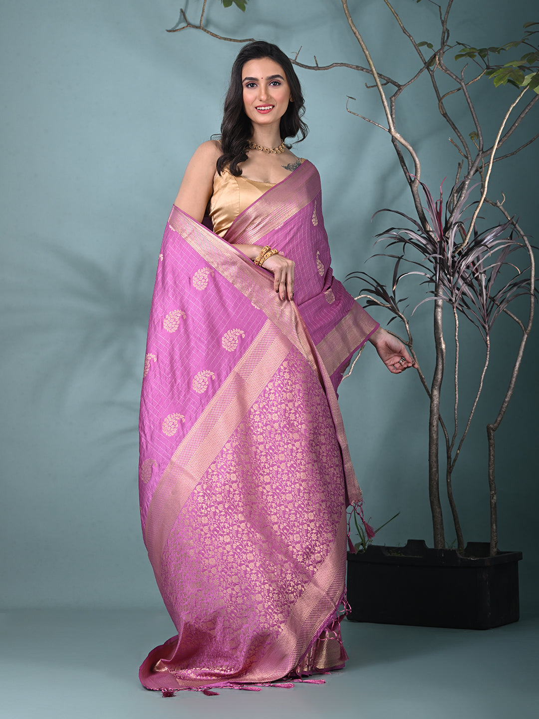Make a stunning statement with this vibrant Lilac Silk Blend Saree, crafted to offer both luxury and elegance. The rich, deep color of lilac beautifully contrasts with intricate brocade work, creating a sophisticated yet festive appeal. The silk blend fabric adds a soft and lustrous texture, ensuring comfort and a flawless drape. The saree features delicate motifs and a refined border design, which gives it a timeless appeal. Perfect for weddings, receptions, or any formal celebration, this saree guarantees to turn heads while offering a blend of tradition and contemporary style.