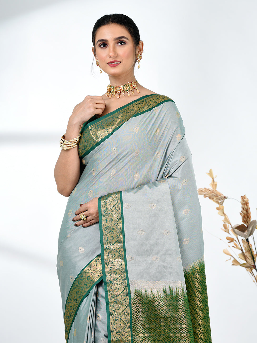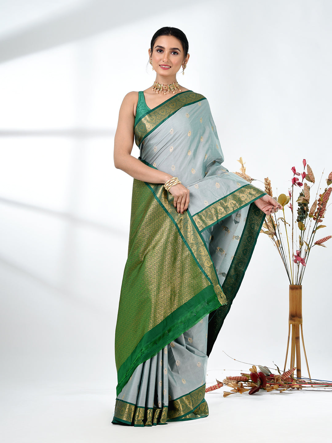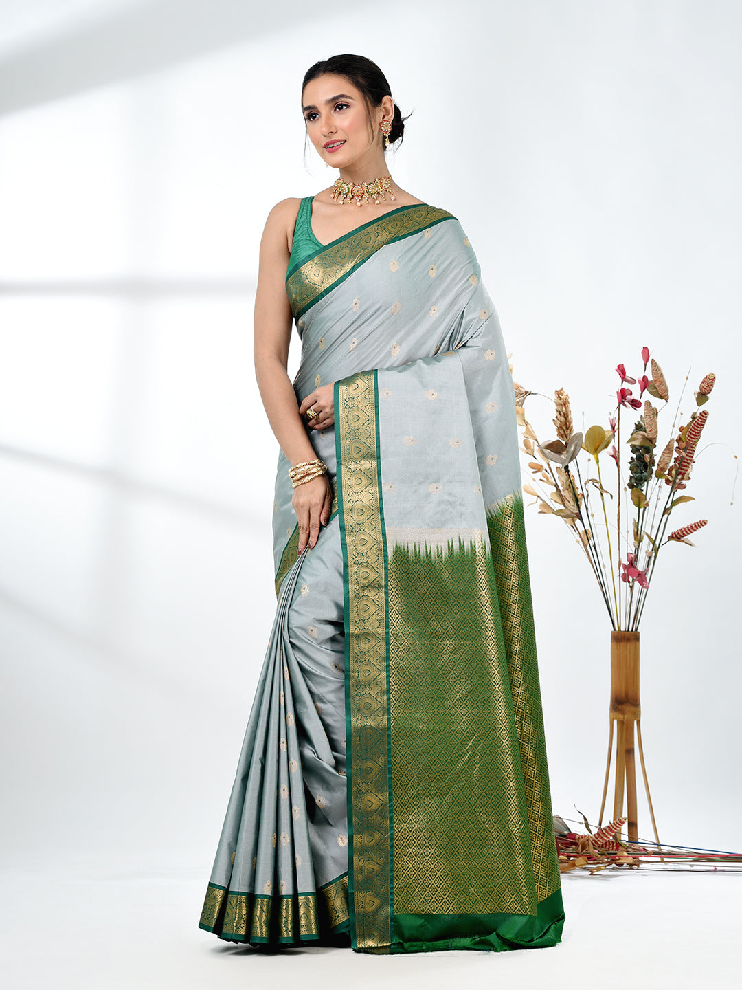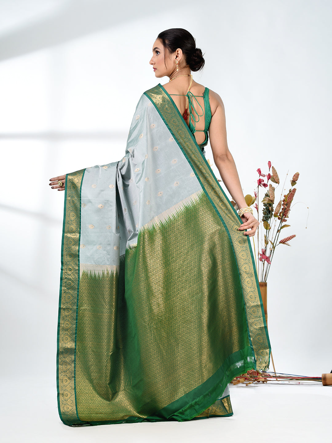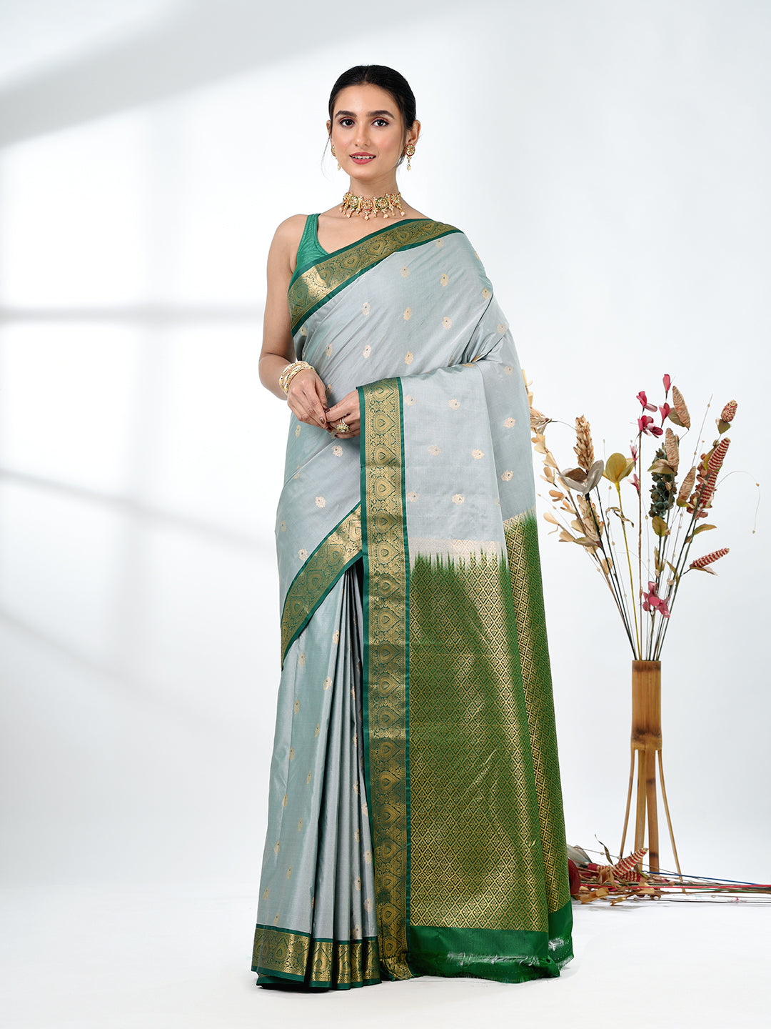This enchanting Mint Green Pure South Silk Saree exudes grace and sophistication, perfect for elegant occasions. The soft pastel green shade, complemented by a rich green and golden zari border, creates a timeless and regal look. The fine South Silk fabric ensures a luxurious feel and comfortable drape, ideal for weddings, festivals, and special celebrations. The saree is beautifully detailed with golden zari floral motifs, adding an intricate touch of tradition. The contrast of the green pallu and border adds depth and allure, making this saree a showstopper at any event.