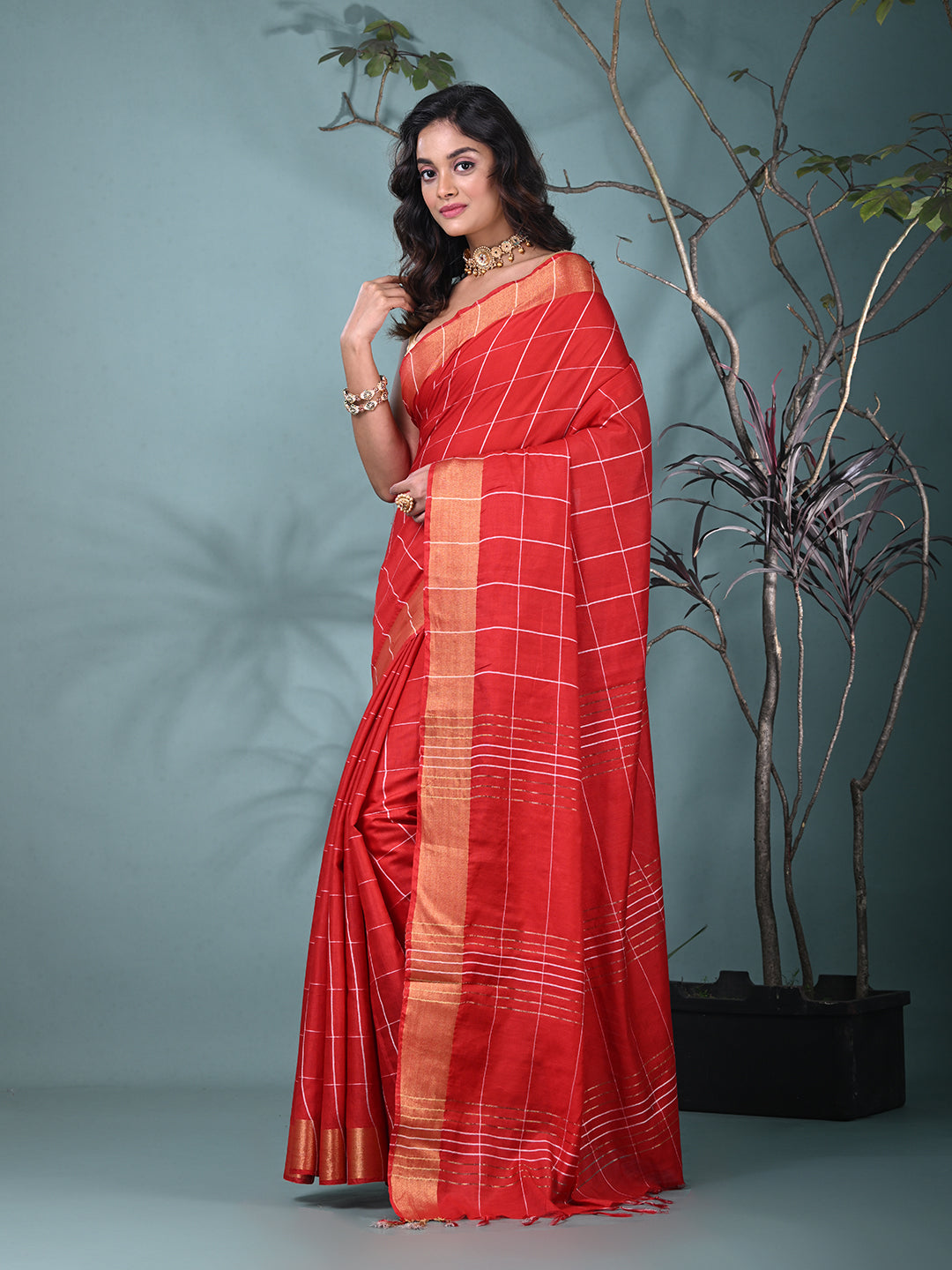 Elegant Red Art Silk Saree with Checkered Design