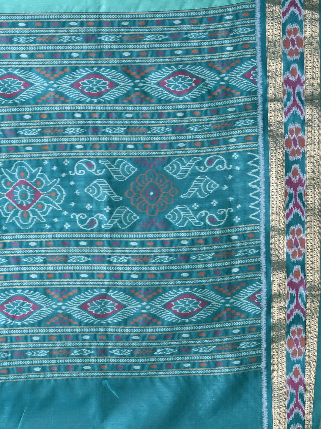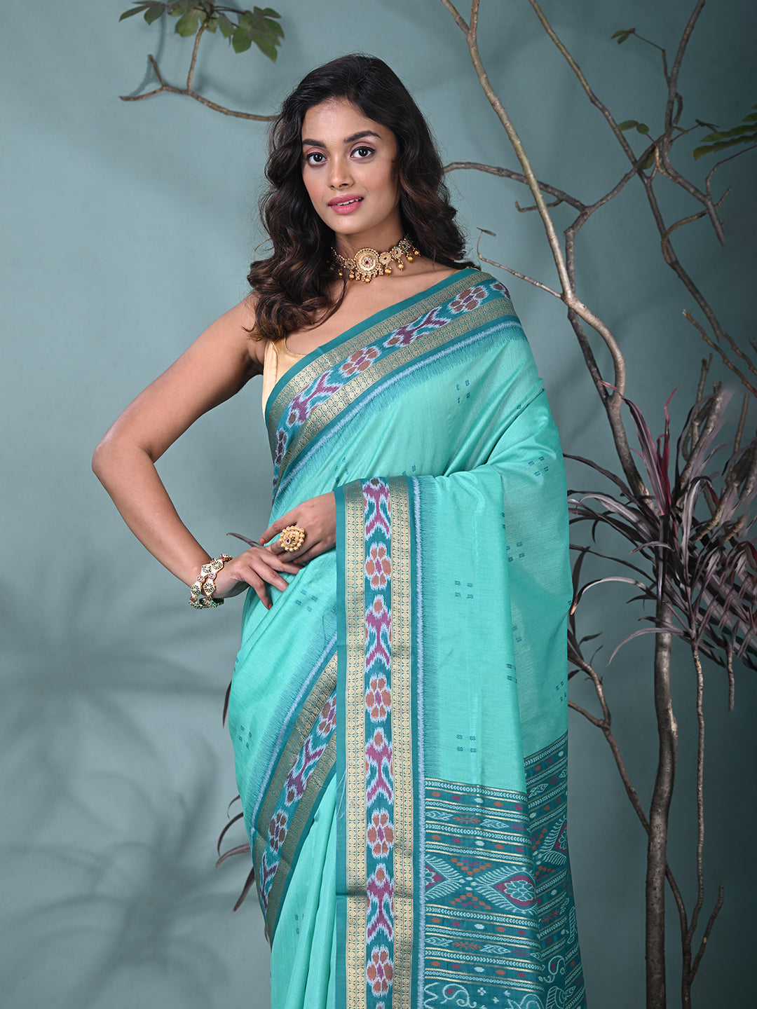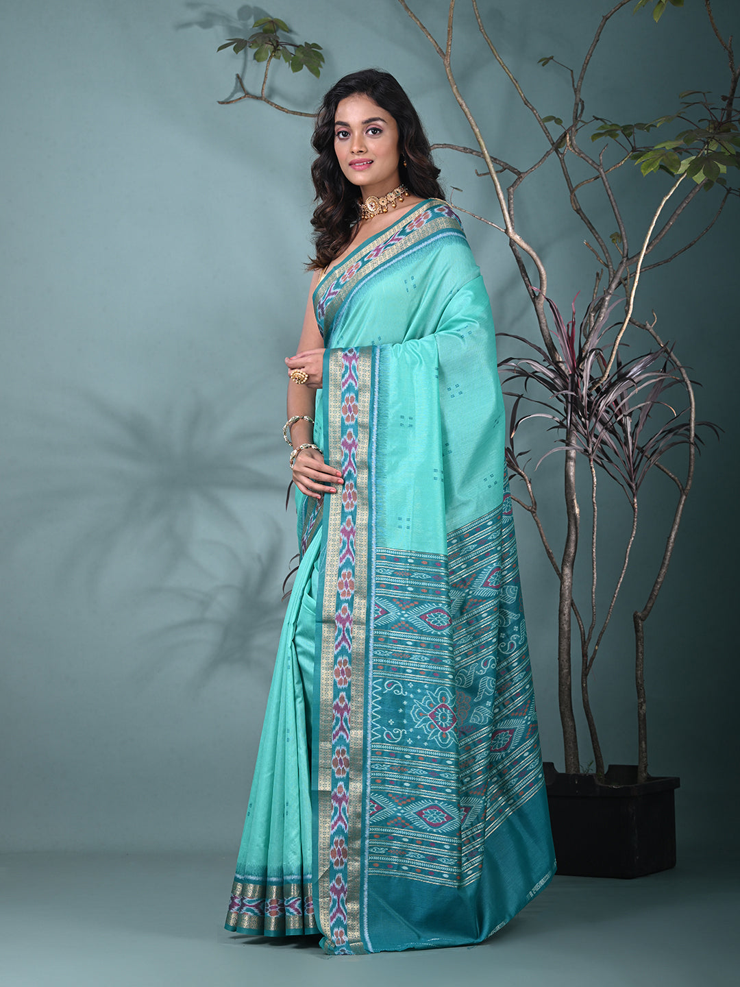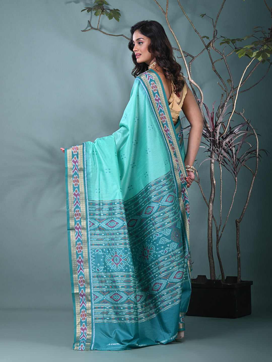 Elegant Sea Green Tussar Silk Saree with Sambhal Puri Ikat Border