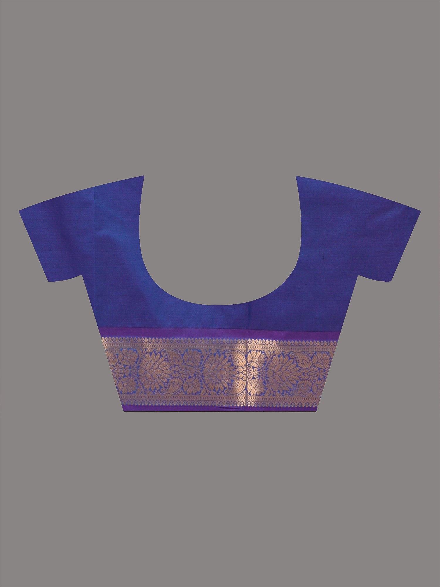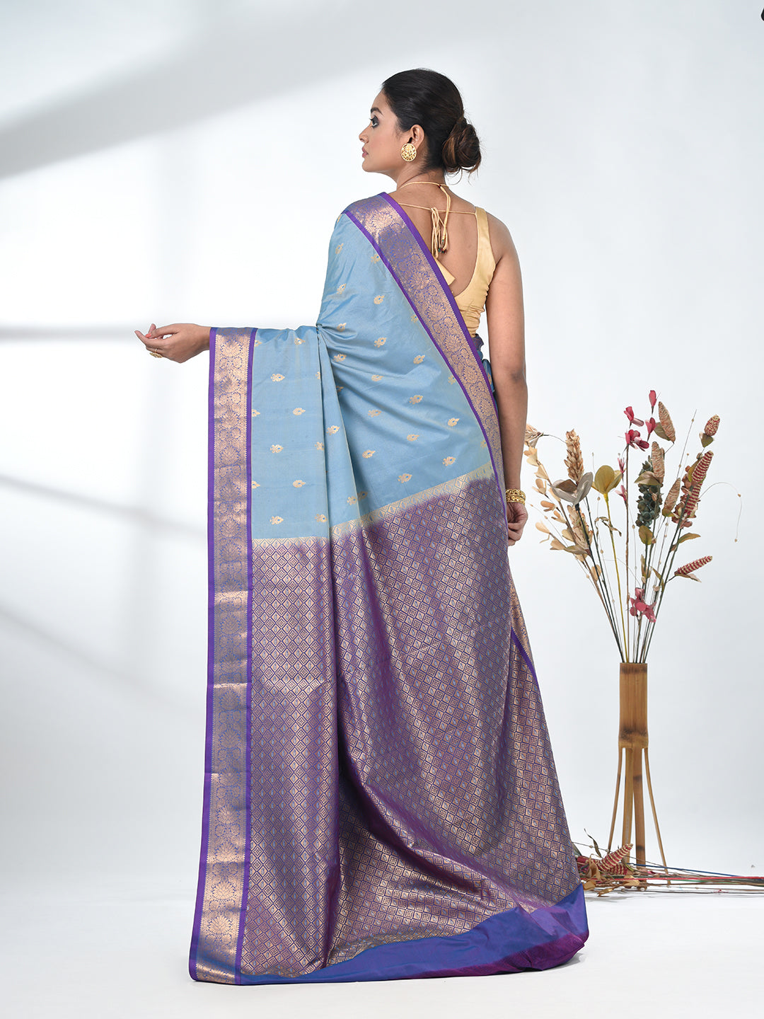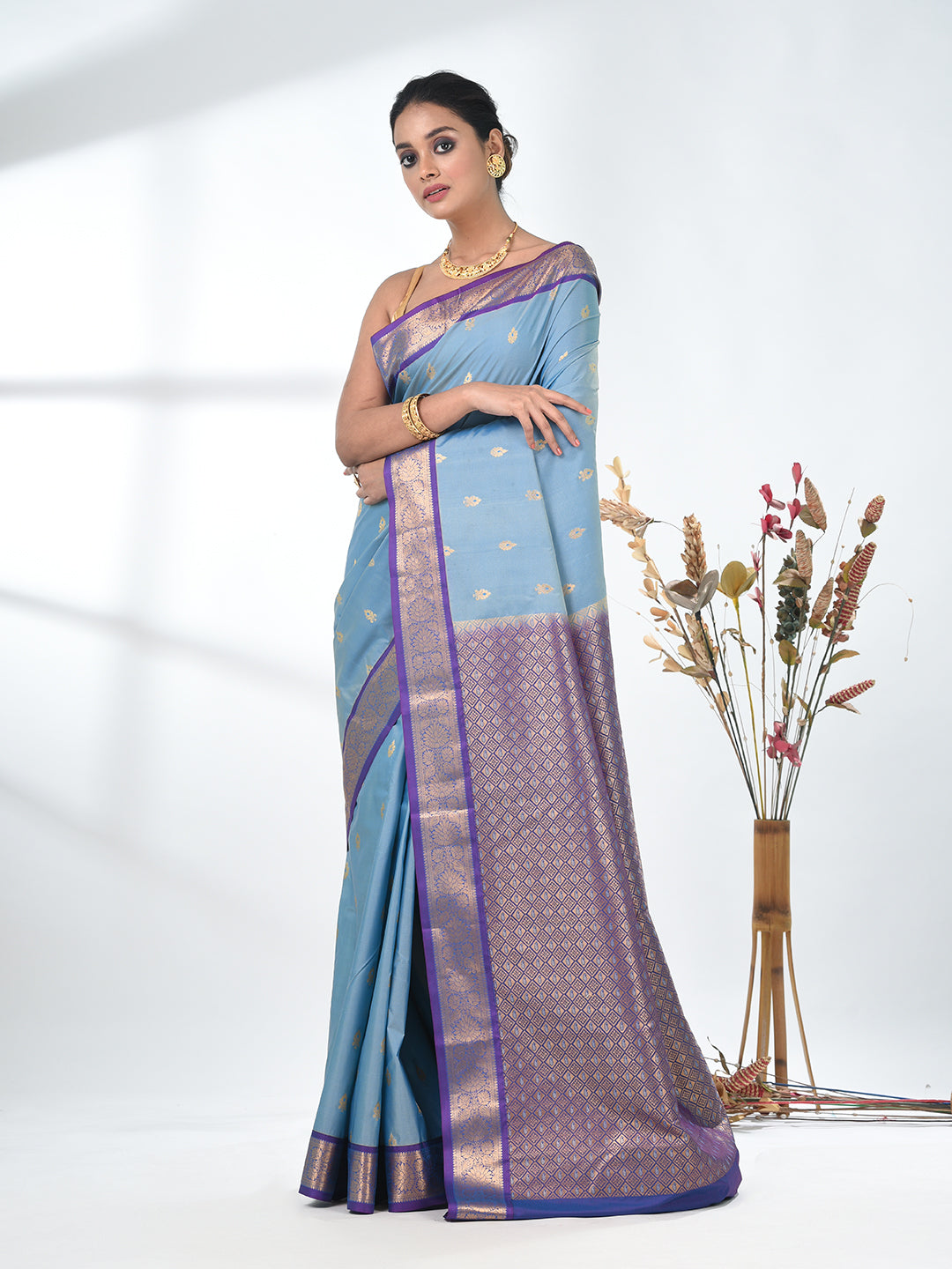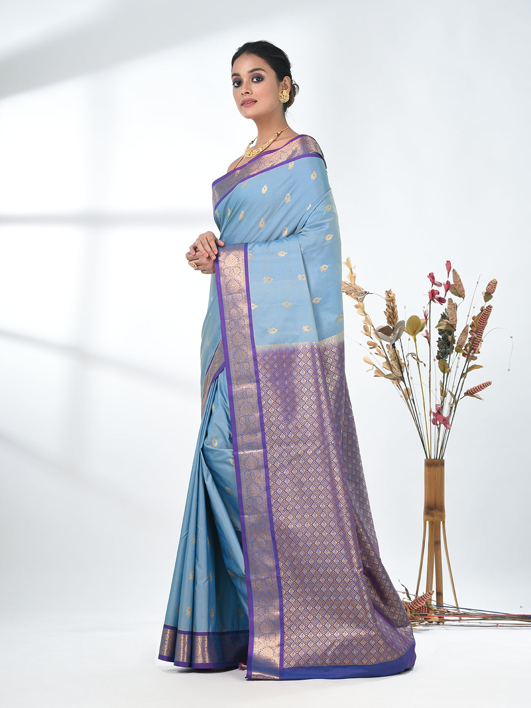 This enchanting Sky Blue Pure South Silk Saree exudes grace and sophistication, perfect for elegant occasions. The soft pastel blue shade, complemented by a rich purple and golden zari border, creates a timeless and regal look. The fine South Silk fabric ensures a luxurious feel and comfortable drape, ideal for weddings, festivals, and special celebrations. The saree is beautifully detailed with golden zari floral motifs, adding an intricate touch of tradition. The contrast of the purple pallu and border adds depth and allure, making this saree a showstopper at any event.