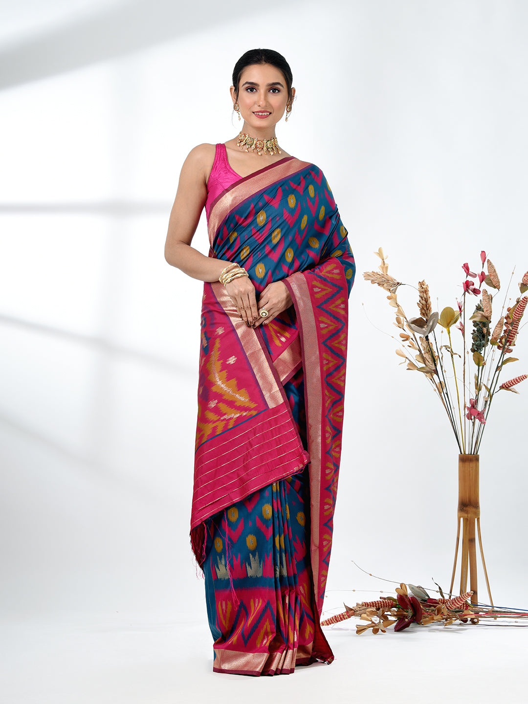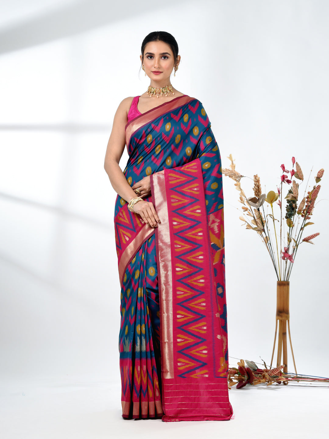 Celebrate tradition with a touch of elegance in this stunning Pochampally Silk Saree. The rich Teal hue forms a beautiful backdrop for the intricate and colorful Ikat patterns, weaving a tale of craftsmanship and heritage. The saree features bold geometric motifs in different shades of colors, creating a modern yet timeless appeal. Crafted from premium Pochampally silk, this saree offers a luxurious drape, perfect for weddings, festive occasions, or special celebrations. The golden zari border adds a regal touch, enhancing its overall charm. Pair it with matching jewelry and a statement blouse to complete your festive look.