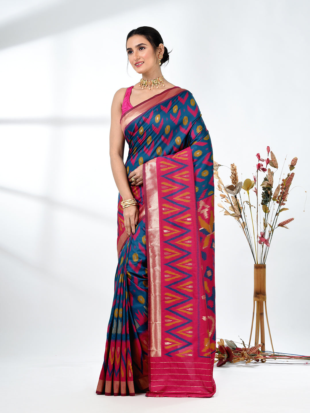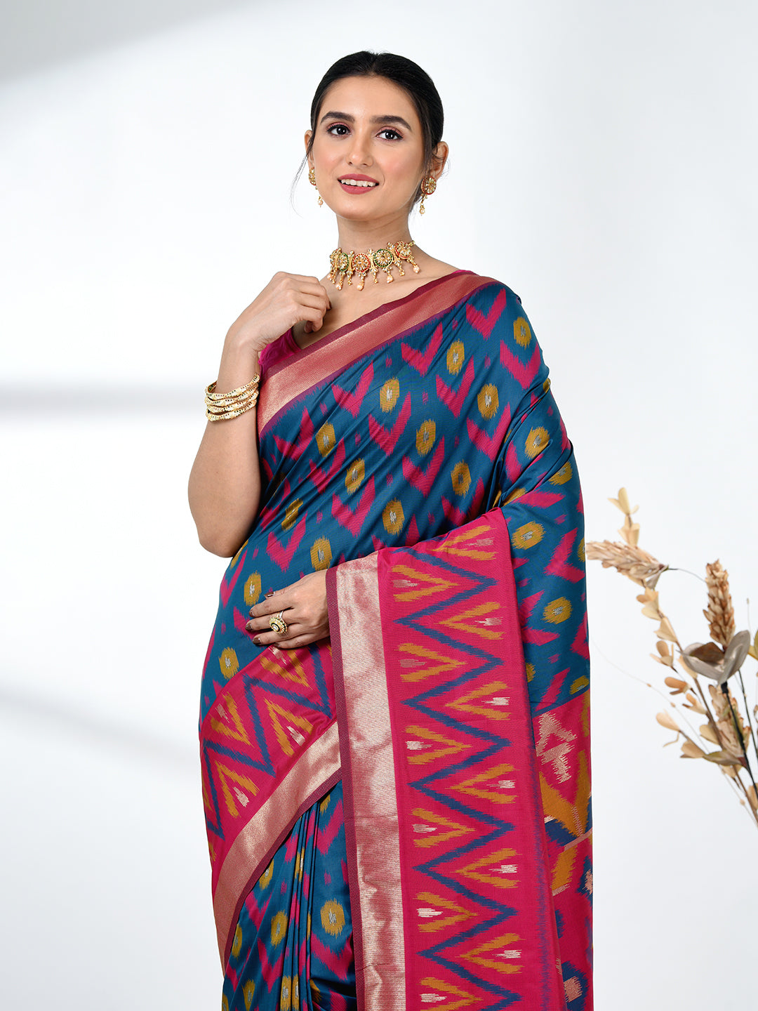Exquisite Teal Pochampally Silk Saree with Vibrant Ikat Pattern