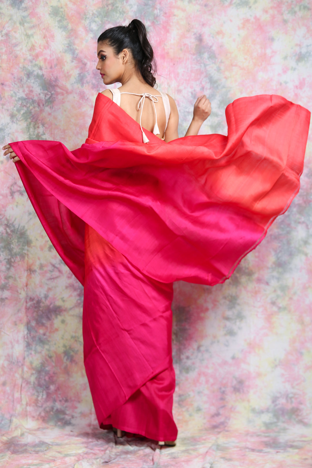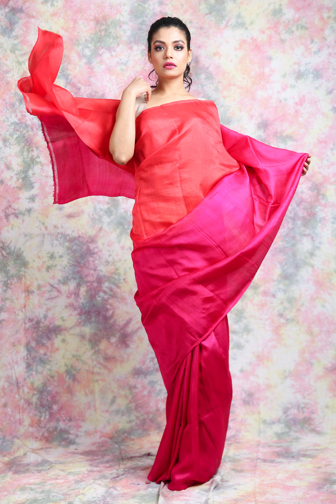 Elevate your ethnic wardrobe with this stunning pure silk saree, beautifully crafted in an enchanting dual-tone of red and pink. The rich silk fabric exudes natural sheen and smooth drape, making it an elegant choice for festive occasions, weddings, or parties. Its vibrant hues add a youthful charm while the simplicity of design ensures timeless sophistication. Pair it with statement jewelry to create a graceful and classy look.