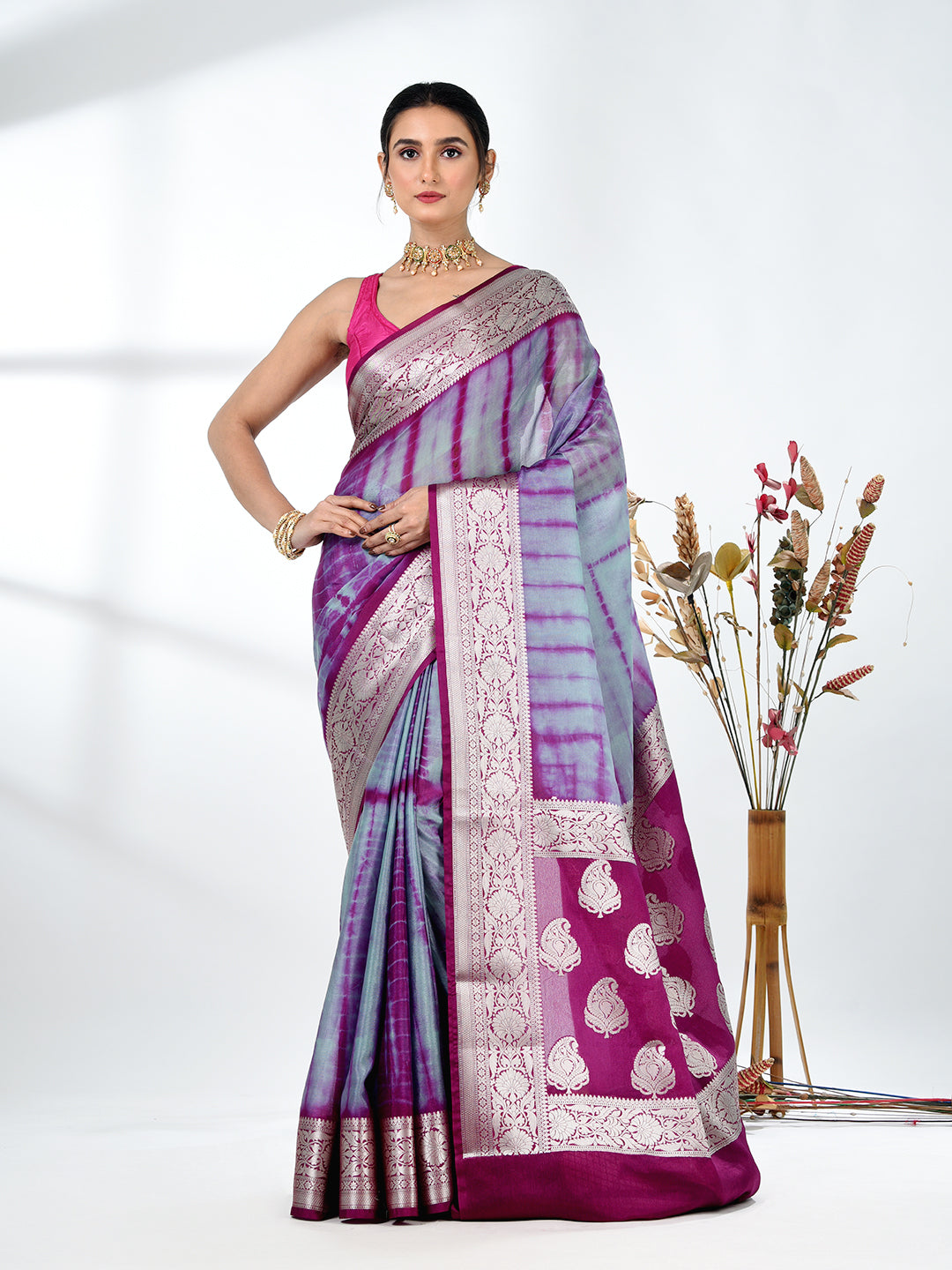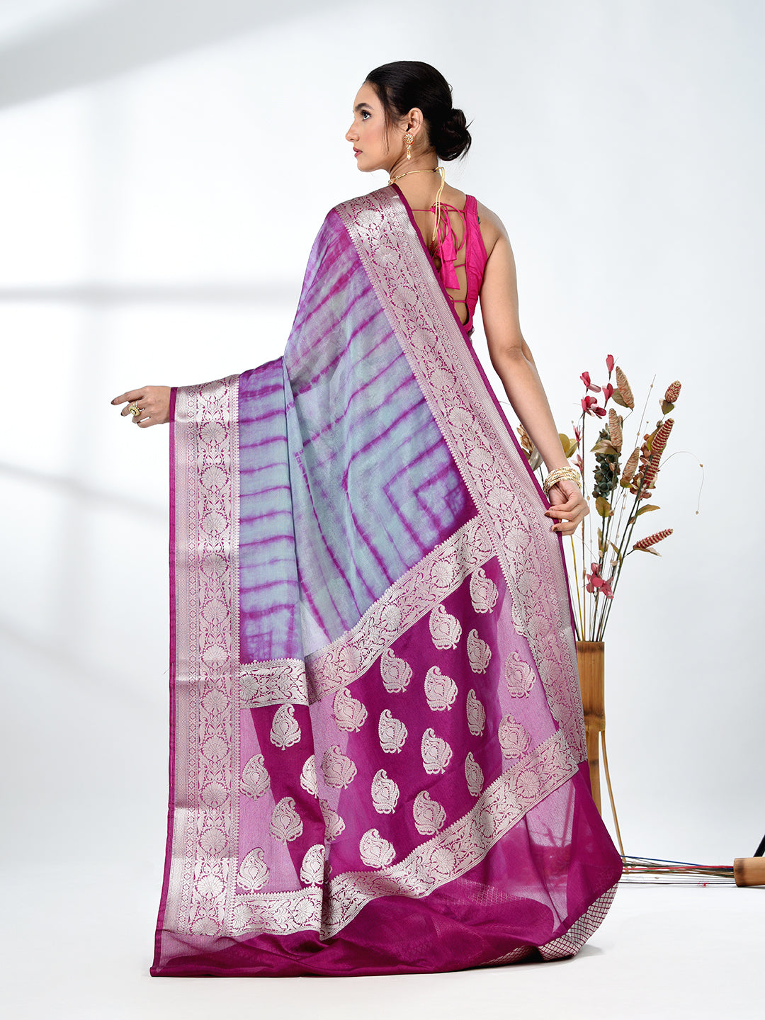 Grey & Magenta Silk Tie & Dye Saree with Intricate Border