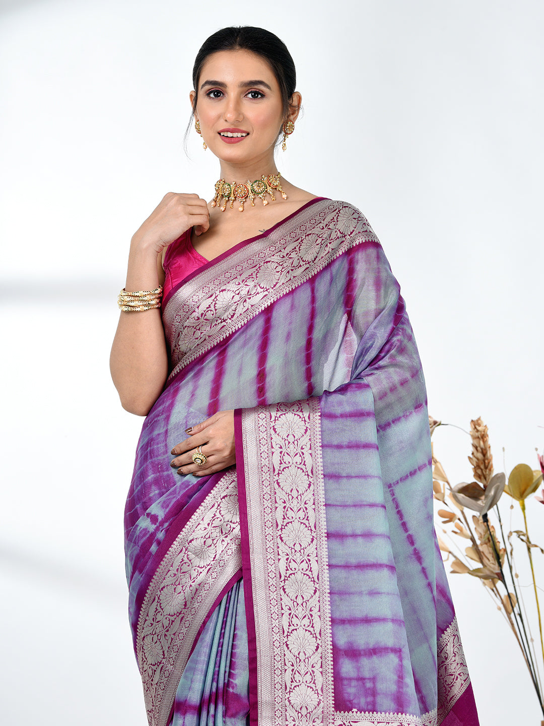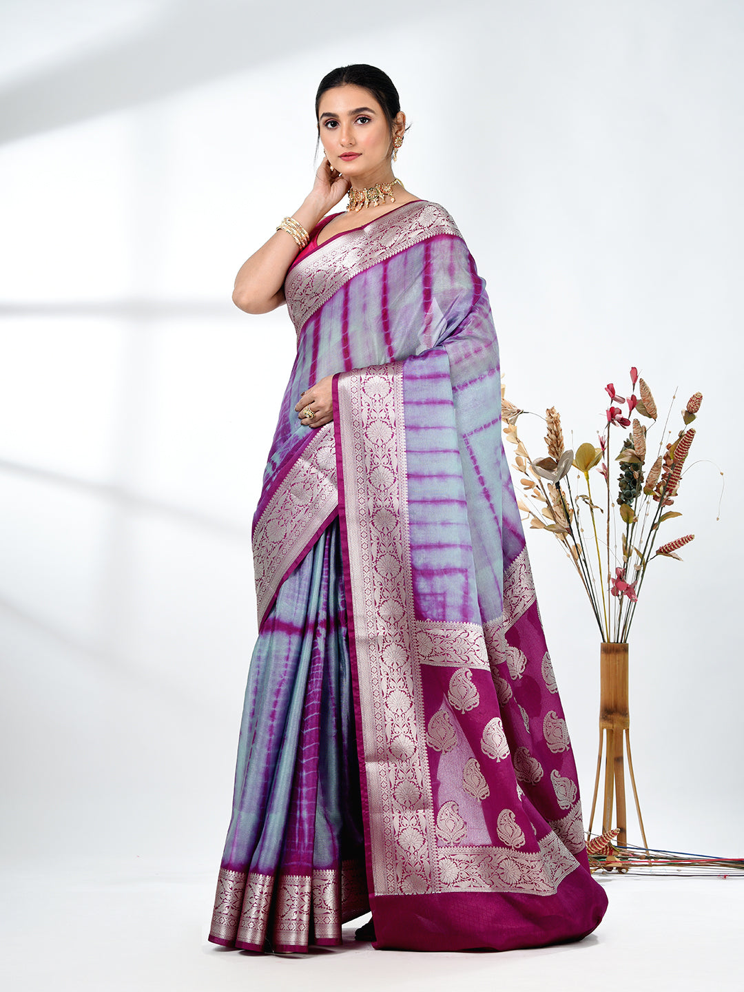 Add a touch of elegance to your wardrobe with this stunning Grey & Magenta Silk Blend Saree. Featuring a beautiful tie & dye pattern, the saree gracefully transitions from soft grey to magenta, creating a mesmerizing and sophisticated look. The rich silk blend fabric ensures comfort and a luxurious feel, making it perfect for both festive and formal events. The saree is enhanced by an intricately designed border, adding an exquisite traditional touch. Pair it with your favorite jewelry and accessories for a complete ensemble that radiates grace and beauty.