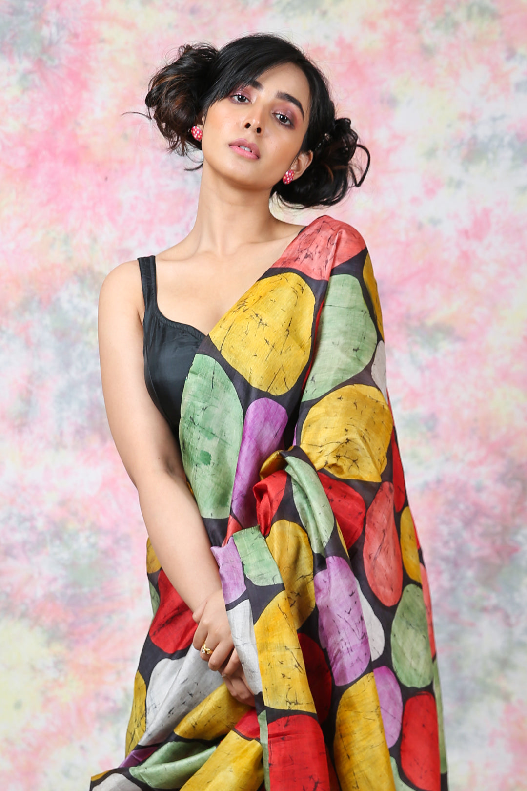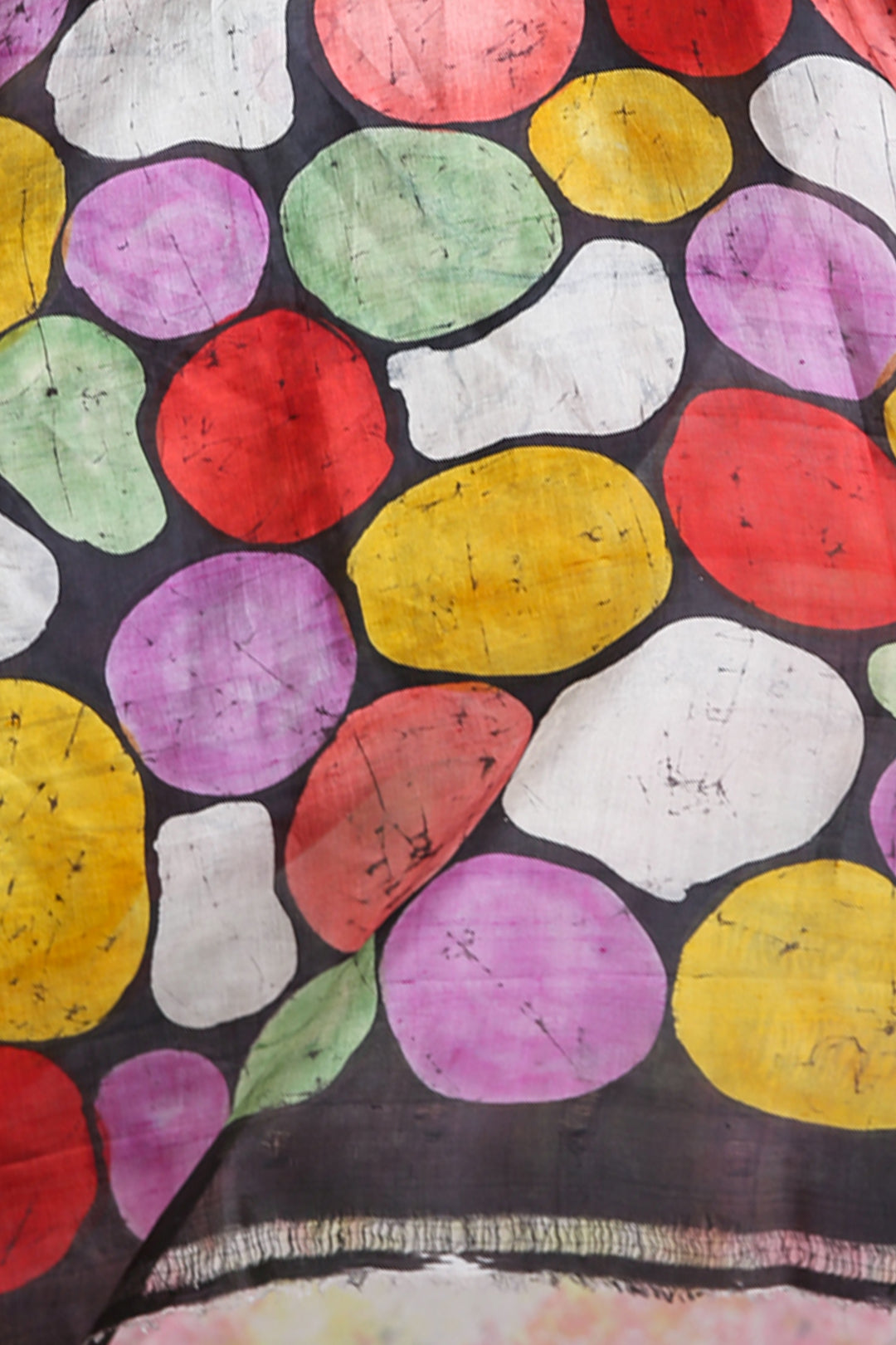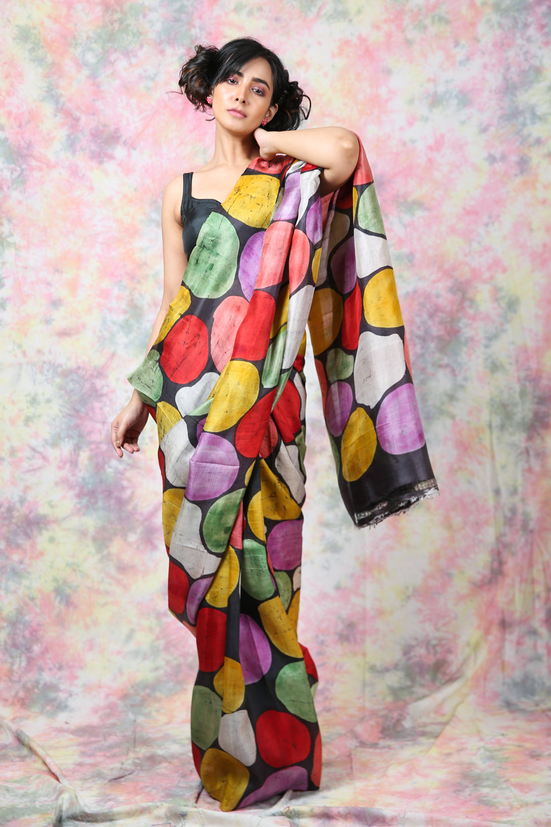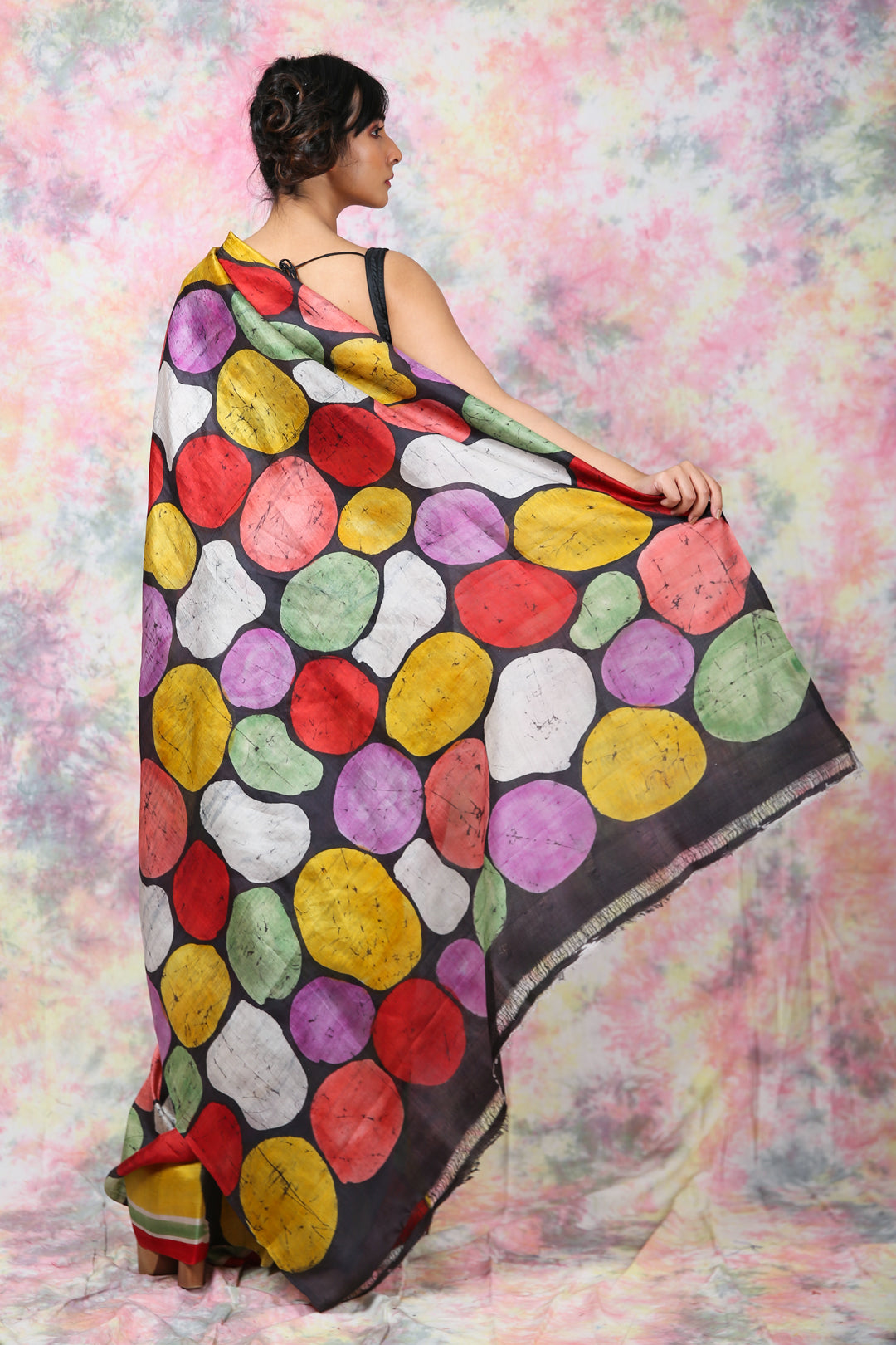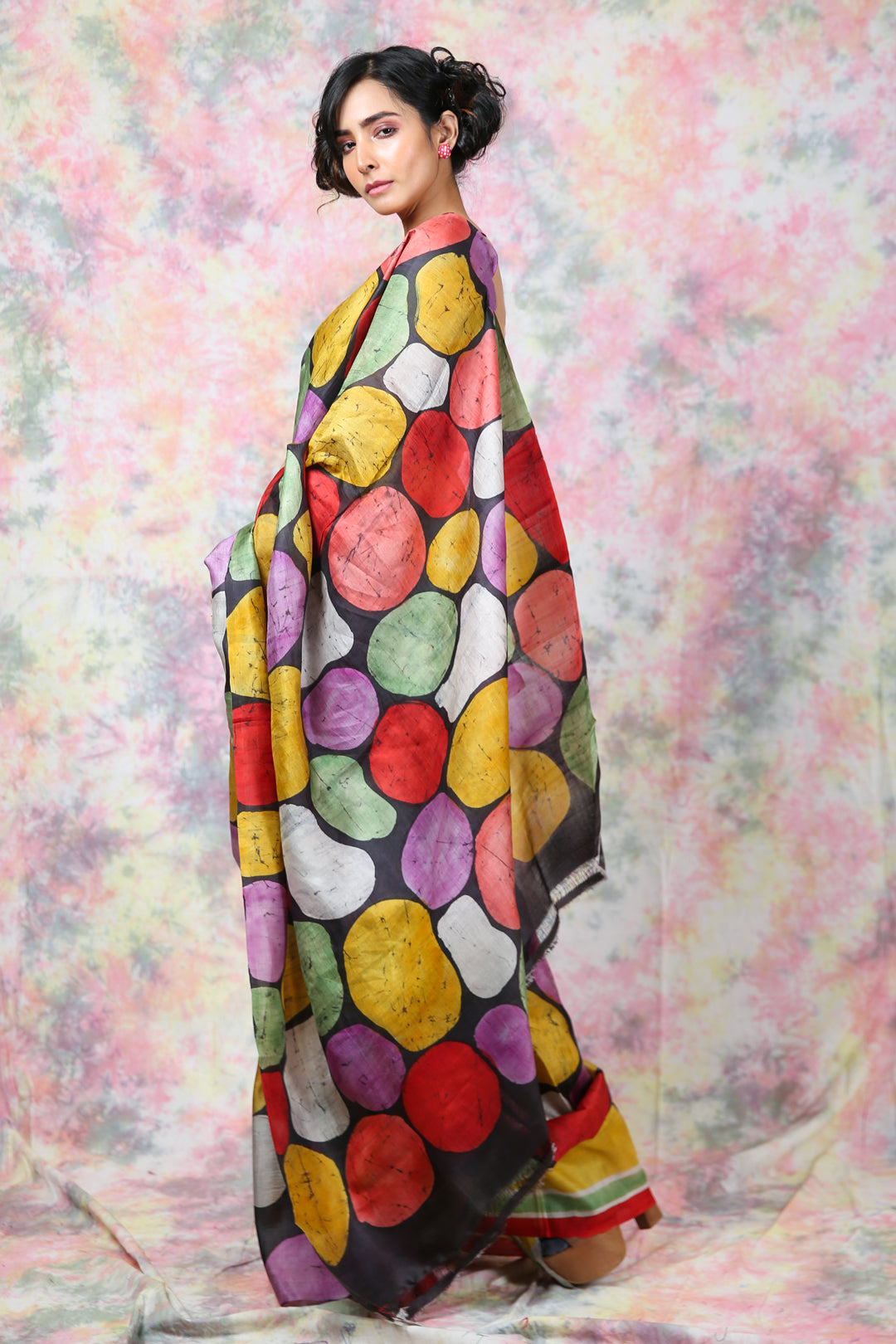 Add a splash of vibrance to your wardrobe with this exquisite pure silk saree, designed with bold multicolor circular patterns on a striking black base. The luxurious silk fabric drapes effortlessly, offering a perfect blend of comfort and elegance. Its playful yet sophisticated design makes it a standout choice for parties, festive gatherings, and contemporary celebrations. Pair it with a simple blouse and minimal jewelry to let the saree’s artistry shine.