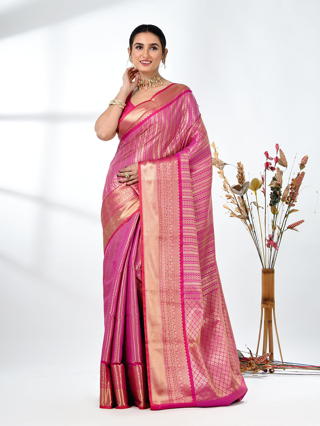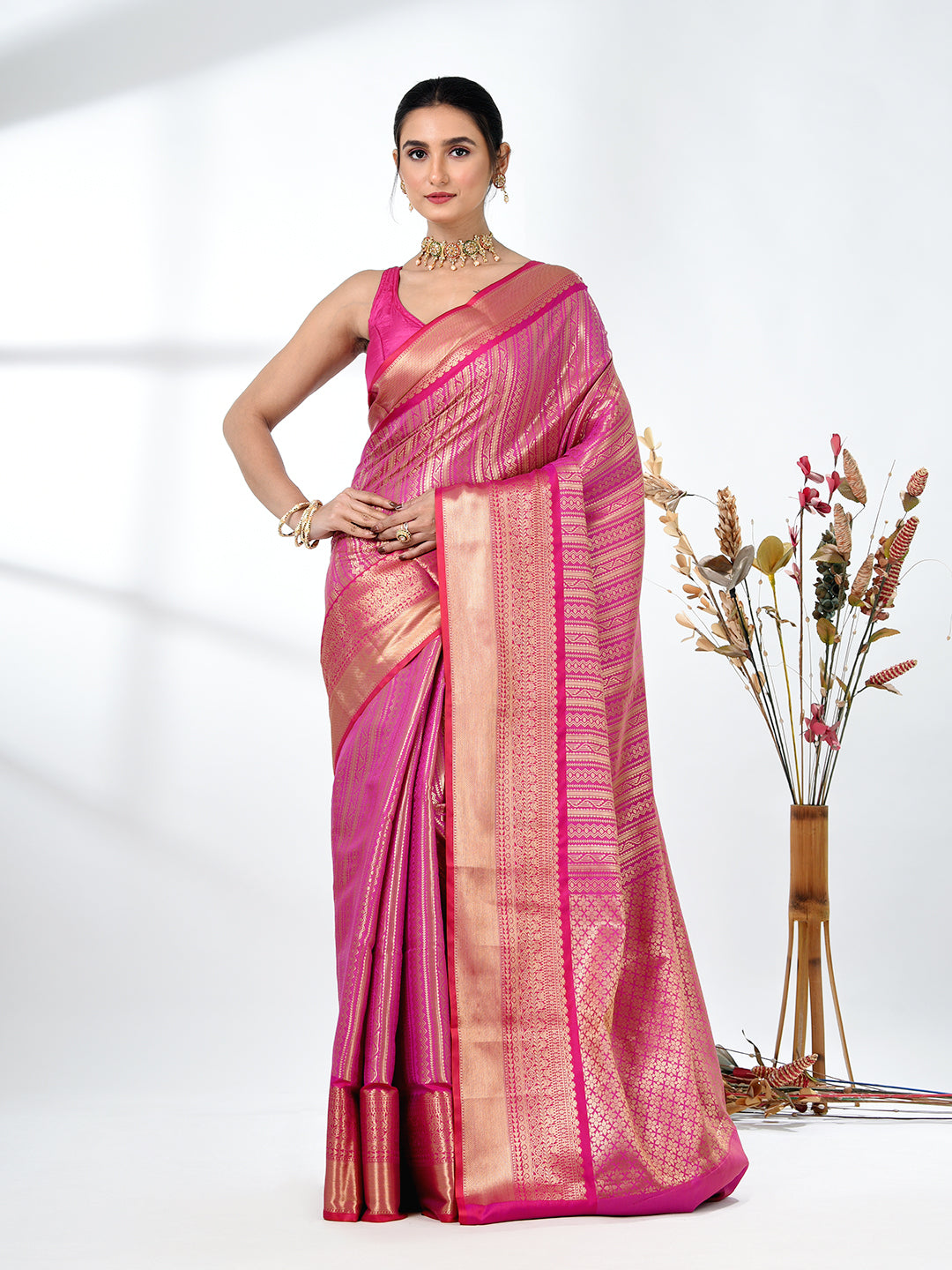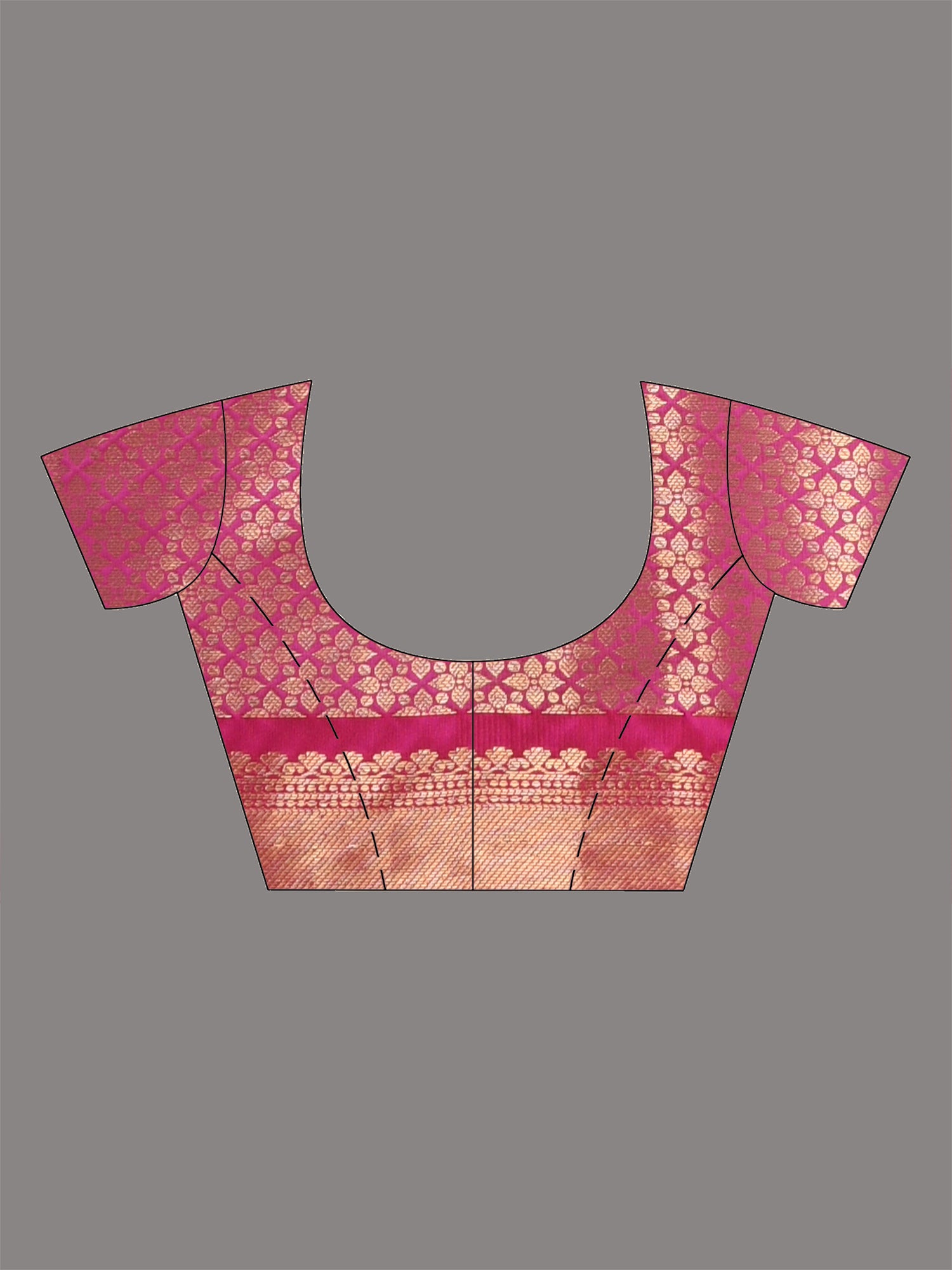 This elegant purple brocade saree is a perfect blend of traditional craftsmanship and modern elegance. Featuring intricate gold patterns, it is beautifully complemented by a rich brocade fabric that exudes sophistication. The saree is ideal for weddings, festivals, or any special occasion. Paired with a matching blouse, this saree makes for a timeless addition to any wardrobe.