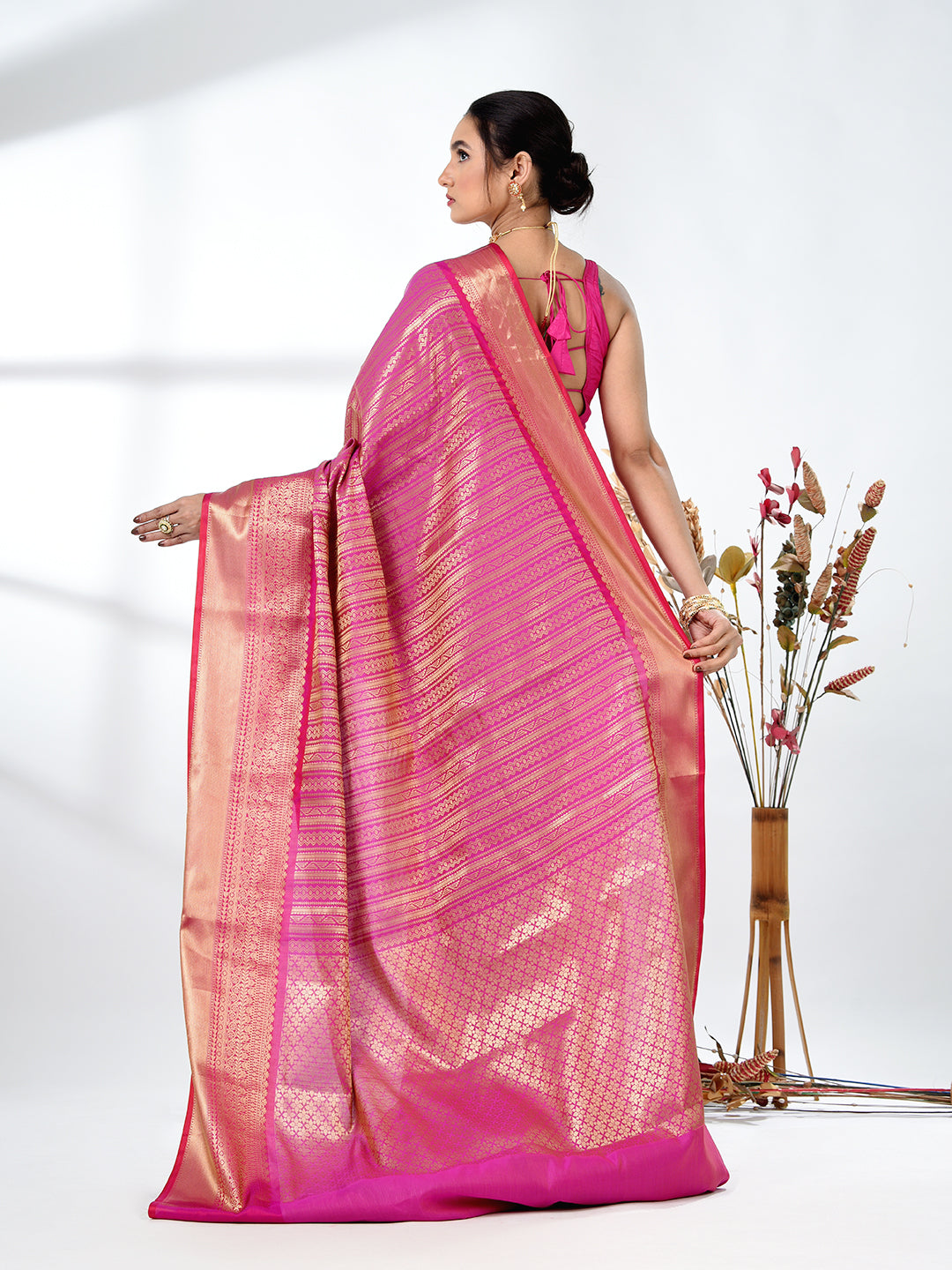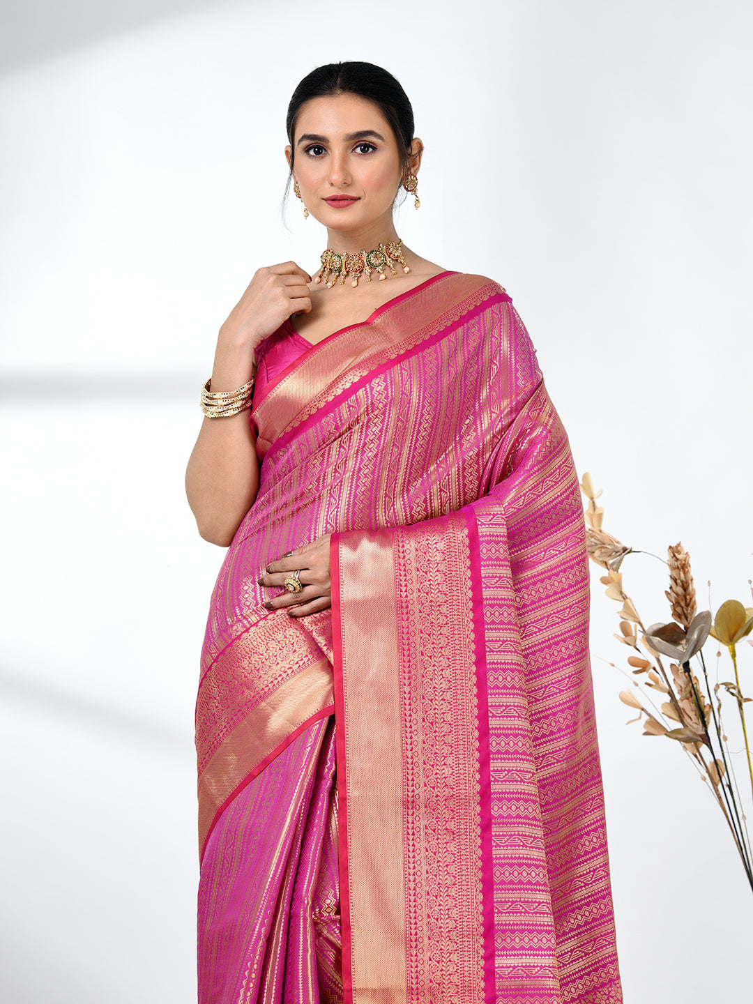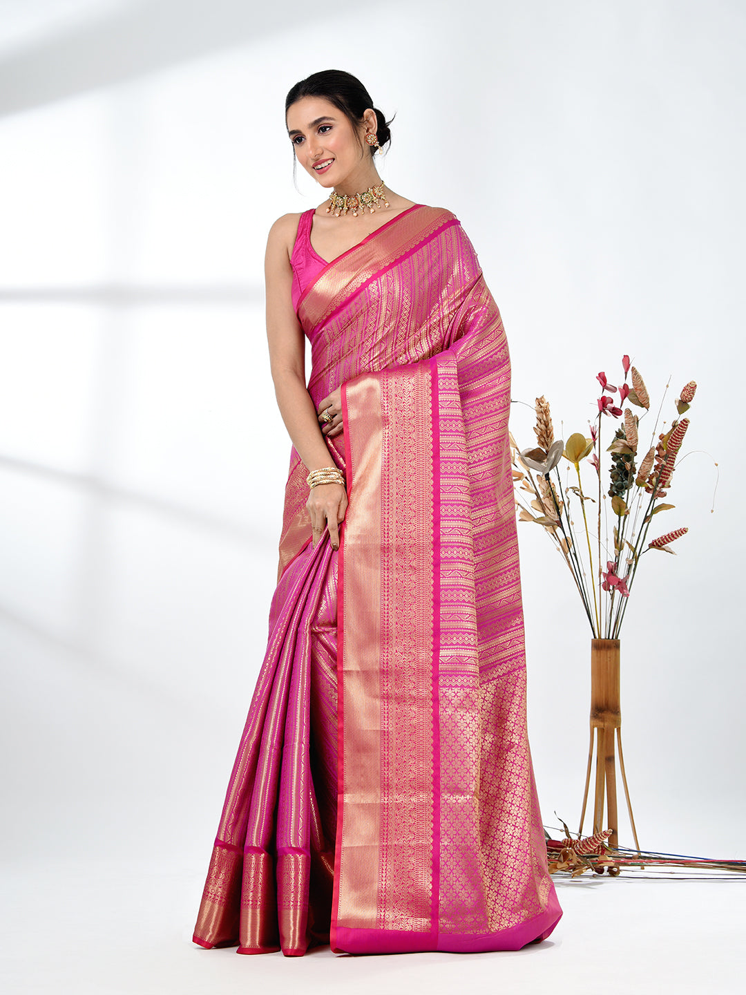 This elegant purple brocade saree is a perfect blend of traditional craftsmanship and modern elegance. Featuring intricate gold patterns, it is beautifully complemented by a rich brocade fabric that exudes sophistication. The saree is ideal for weddings, festivals, or any special occasion. Paired with a matching blouse, this saree makes for a timeless addition to any wardrobe.