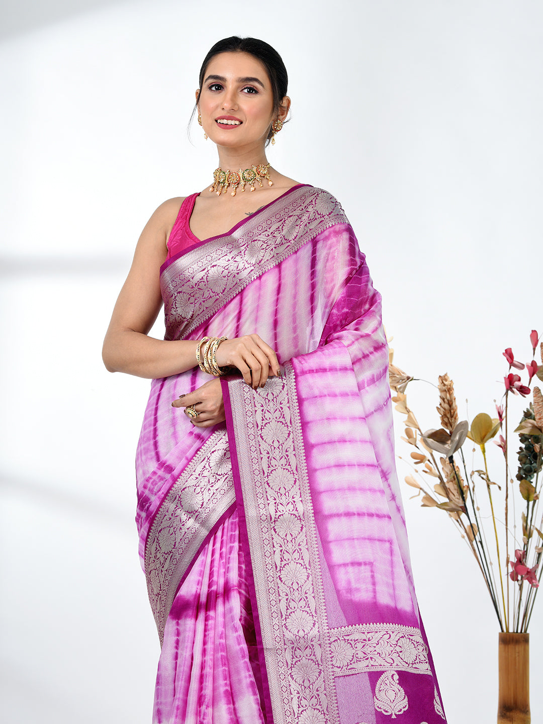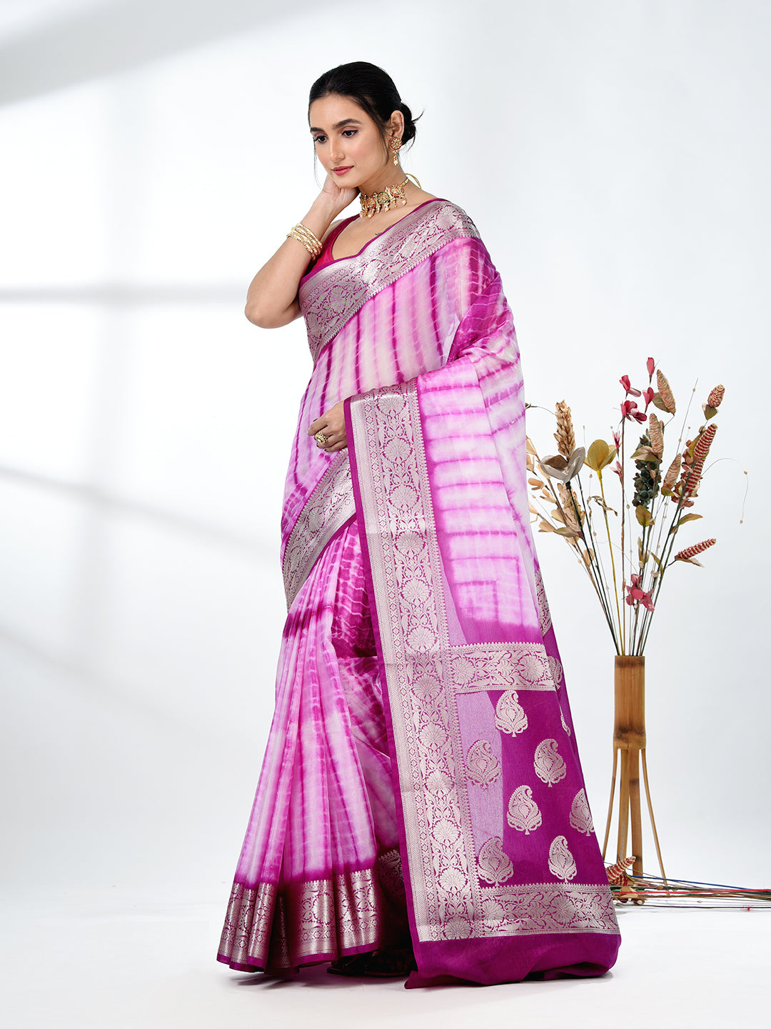 Add a touch of elegance to your wardrobe with this stunning Purple & White Silk Blend Saree. Featuring a beautiful tie & dye pattern, the saree gracefully transitions from soft purple to white, creating a mesmerizing and sophisticated look. The rich silk blend fabric ensures comfort and a luxurious feel, making it perfect for both festive and formal events. The saree is enhanced by an intricately designed border, adding an exquisite traditional touch. Pair it with your favorite jewelry and accessories for a complete ensemble that radiates grace and beauty.