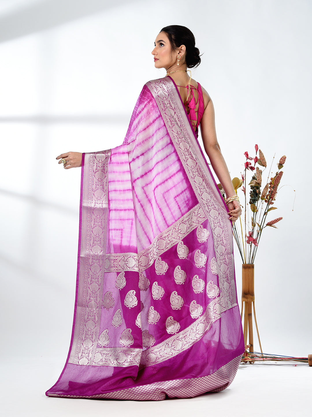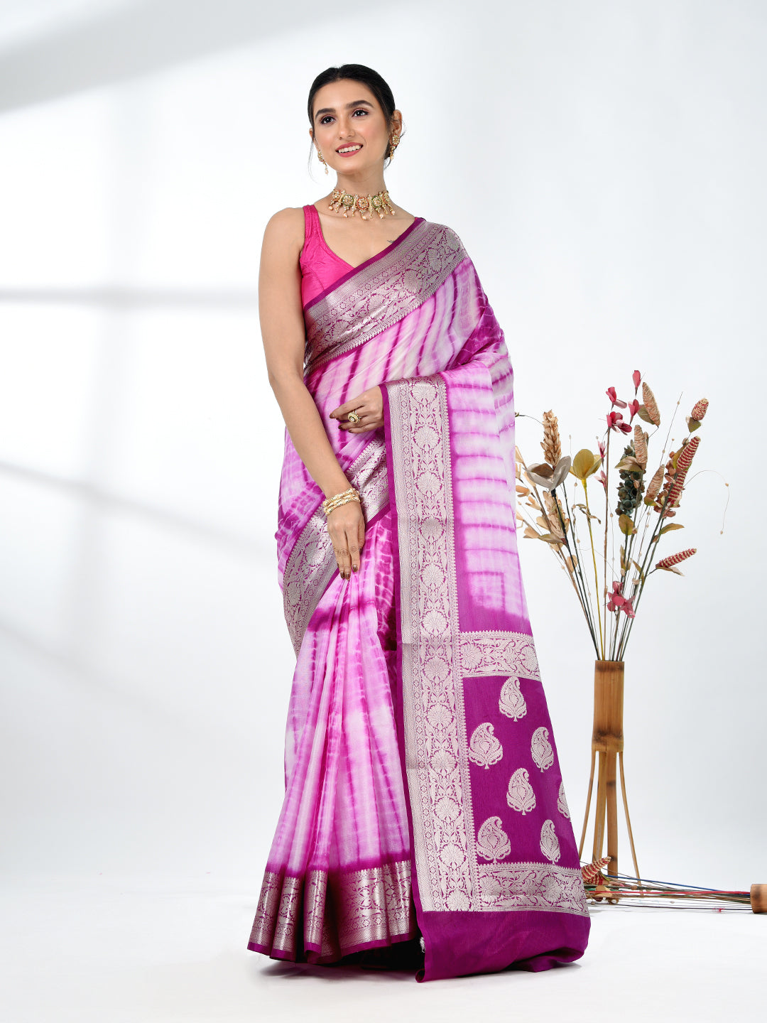 Purple & White Silk Tie & Dye Saree with Intricate Border