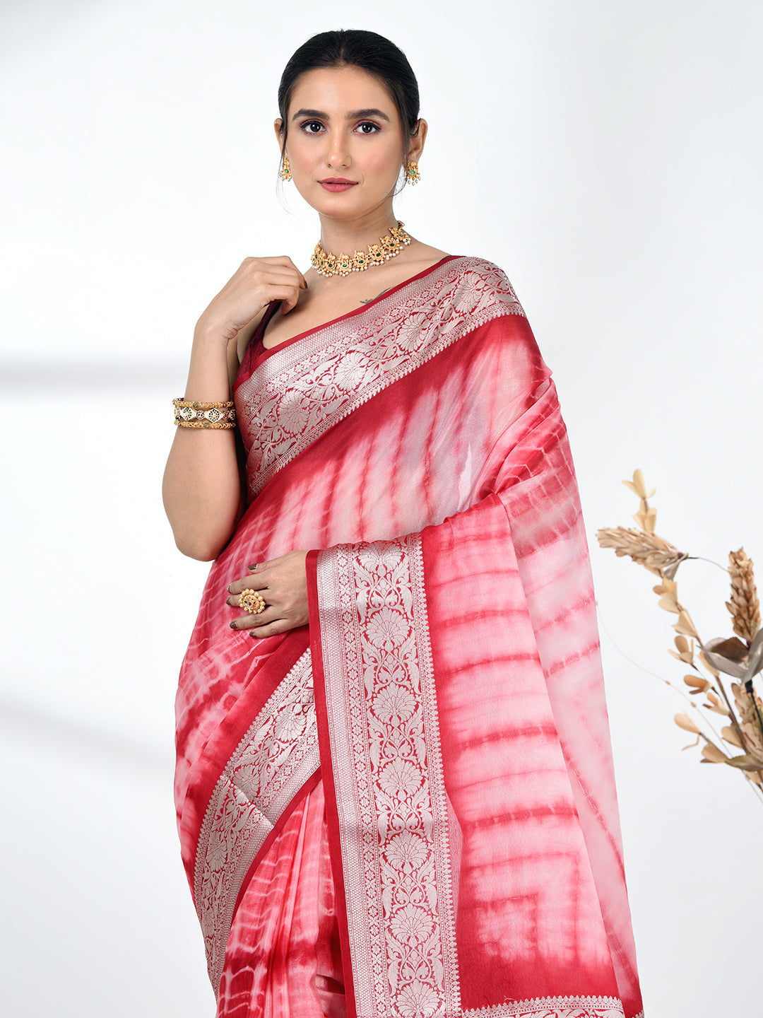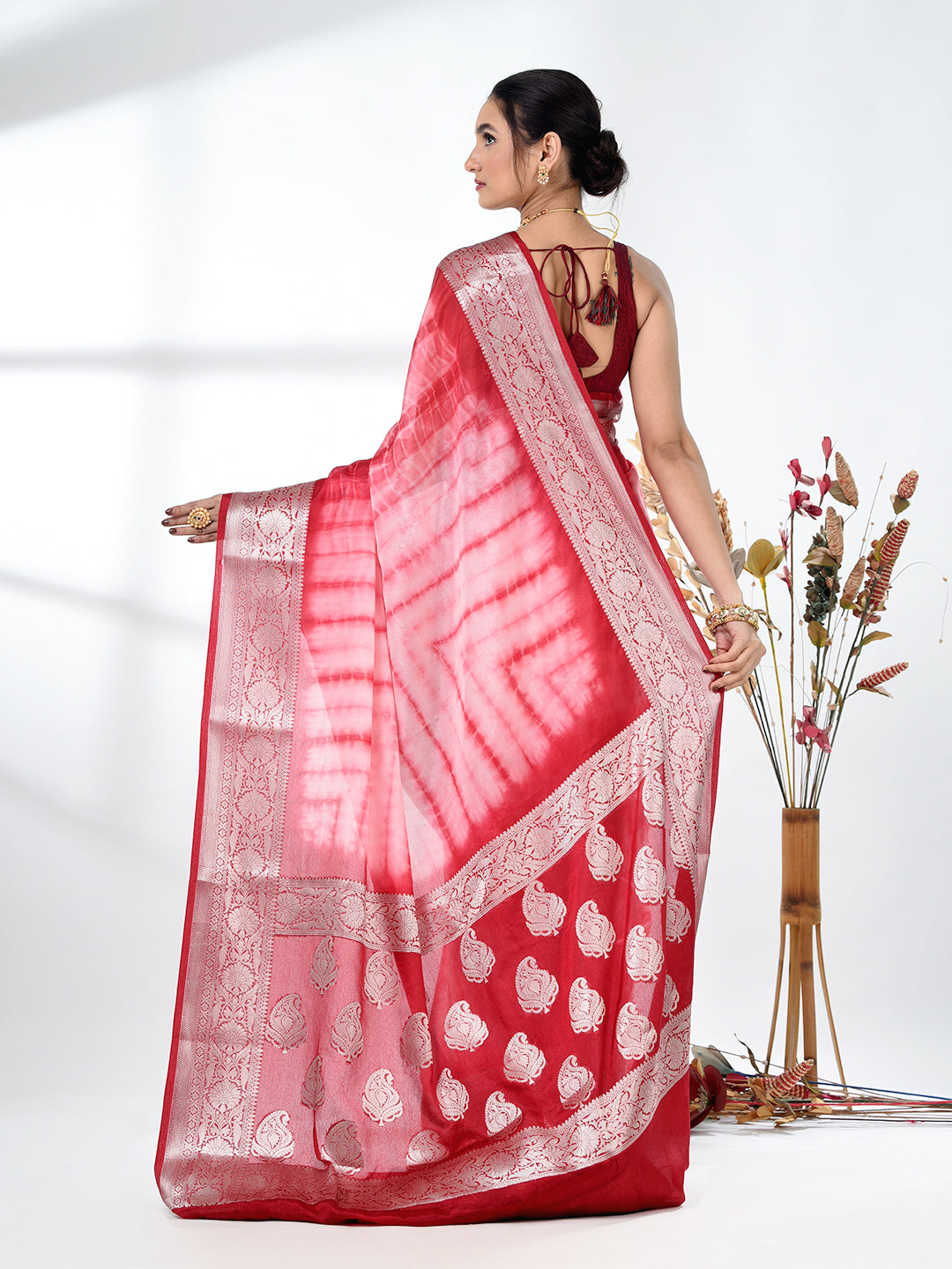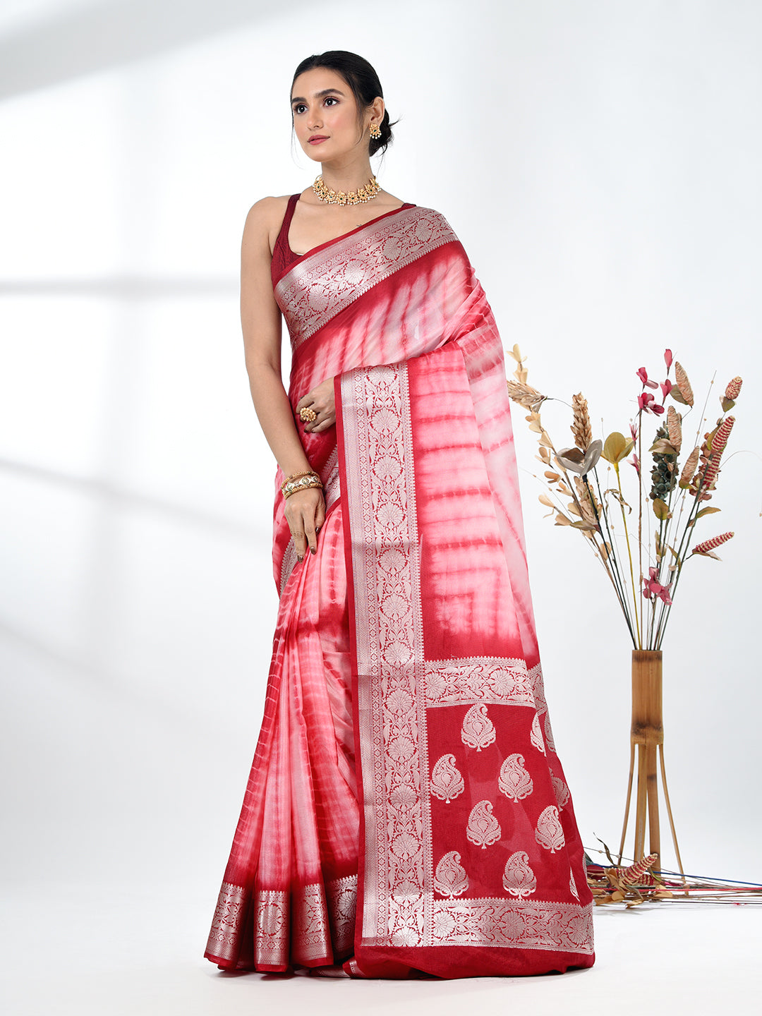 Add a touch of elegance to your wardrobe with this stunning Red & White Silk Blend Saree. Featuring a beautiful tie & dye pattern, the saree gracefully transitions from soft red to white, creating a mesmerizing and sophisticated look. The rich silk blend fabric ensures comfort and a luxurious feel, making it perfect for both festive and formal events. The saree is enhanced by an intricately designed border, adding an exquisite traditional touch. Pair it with your favorite jewelry and accessories for a complete ensemble that radiates grace and beauty.
