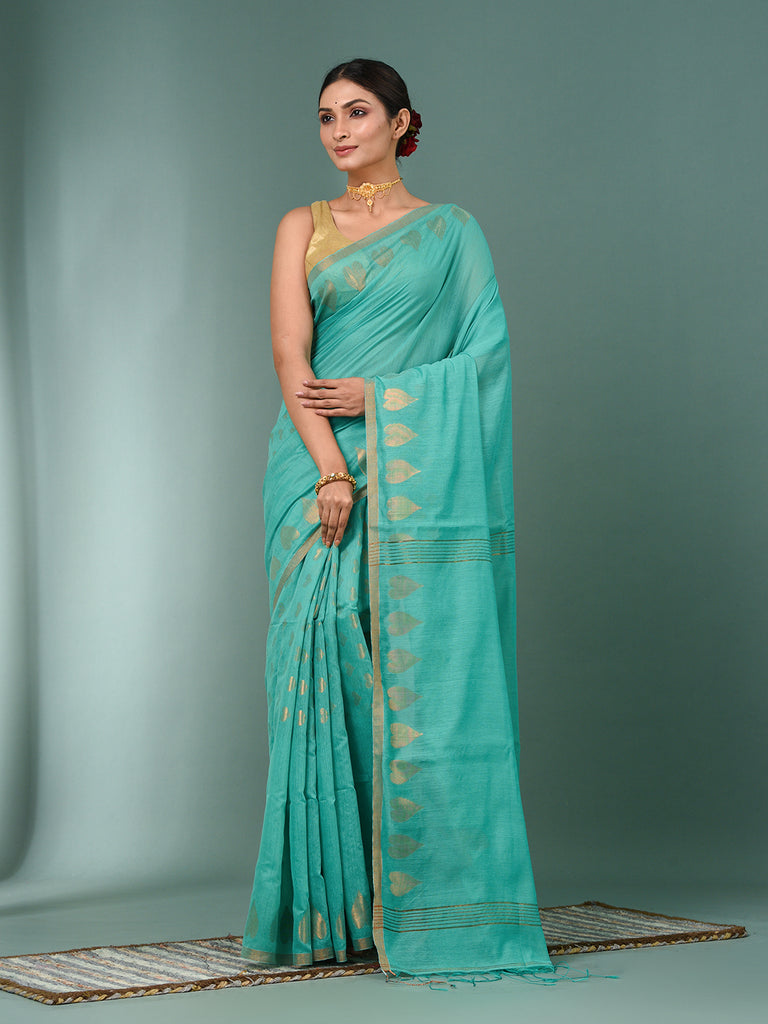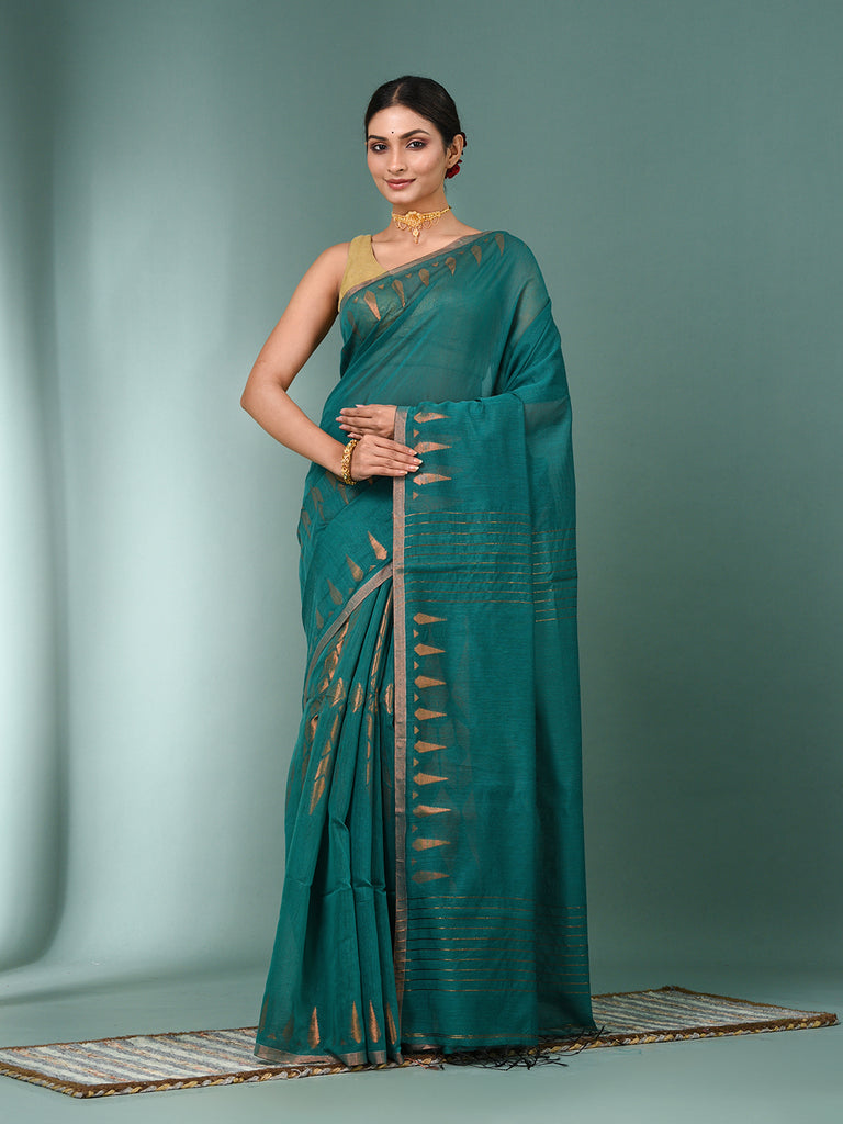 Teal Geometric Motifs Cotton Handspun Soft Saree