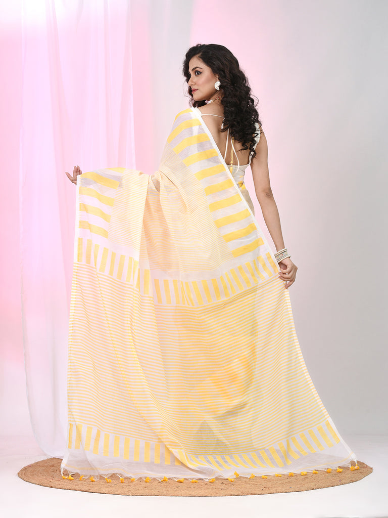 Elegant White And Yellow Striped Cotton Handspun Saree with Pom Pom Border