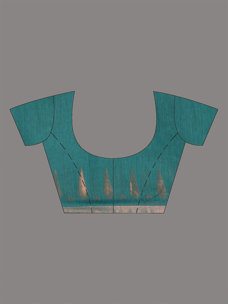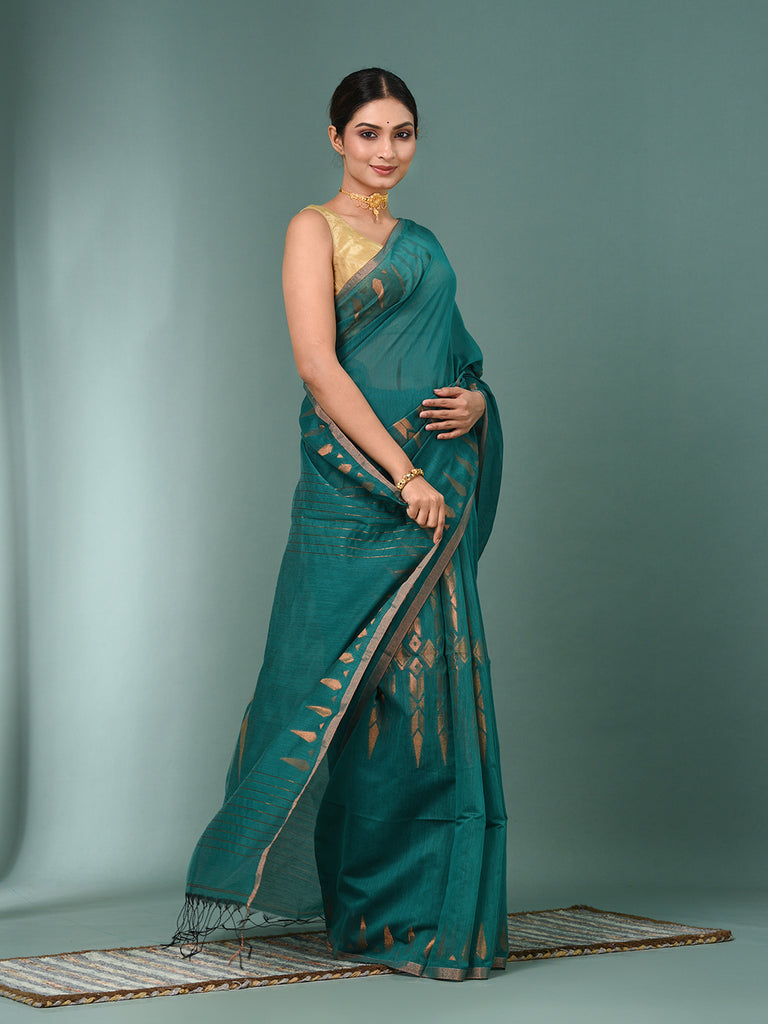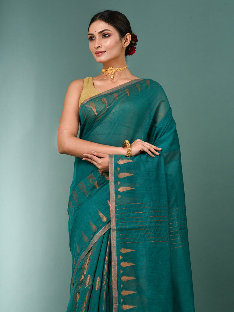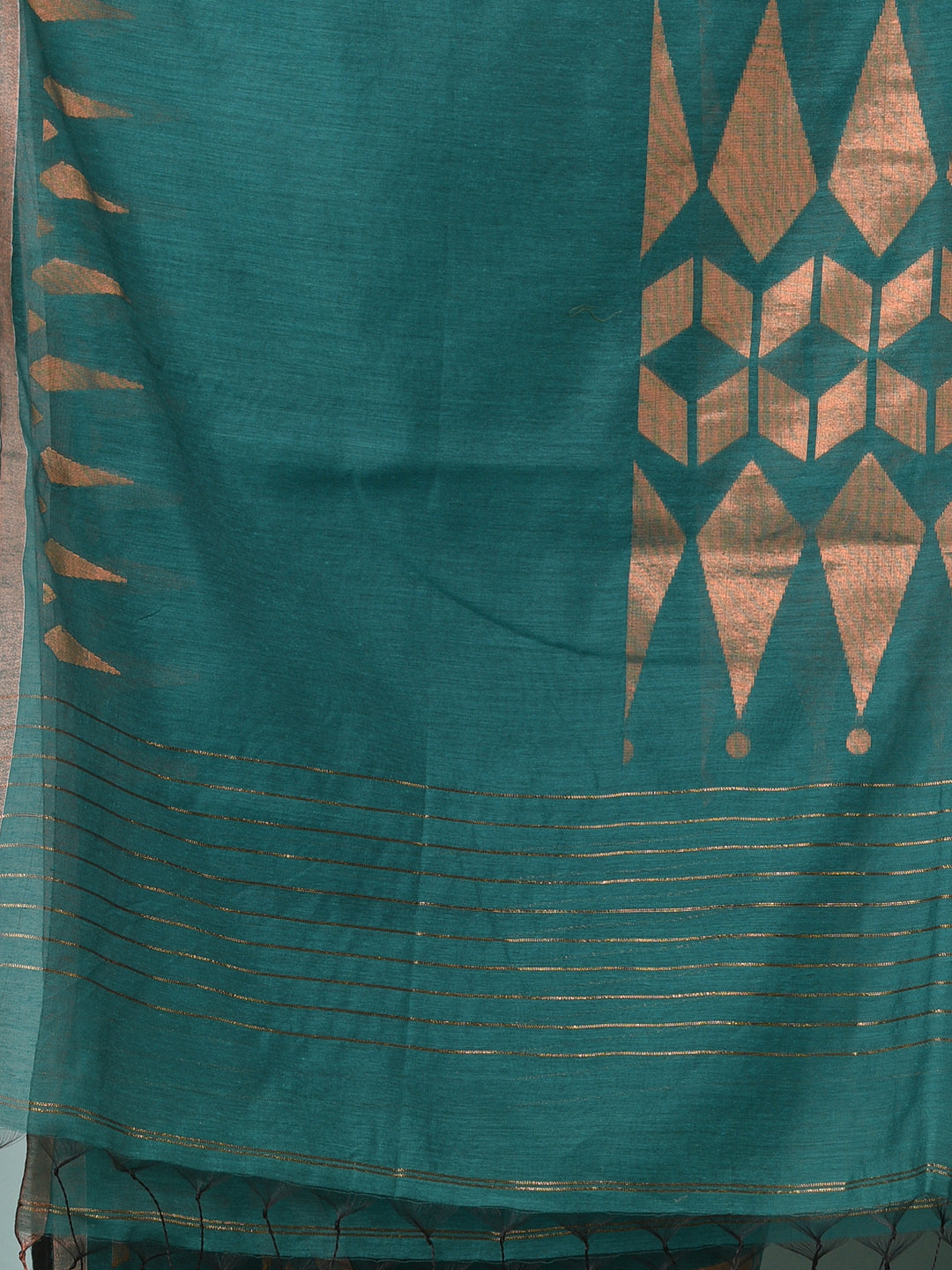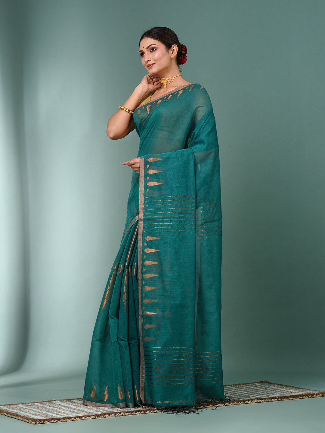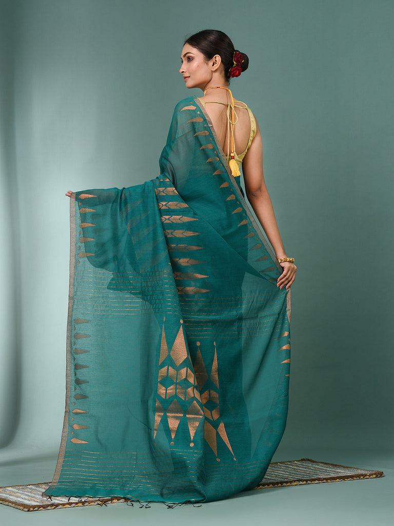 Teal Geometric Motifs Cotton Handspun Soft Saree