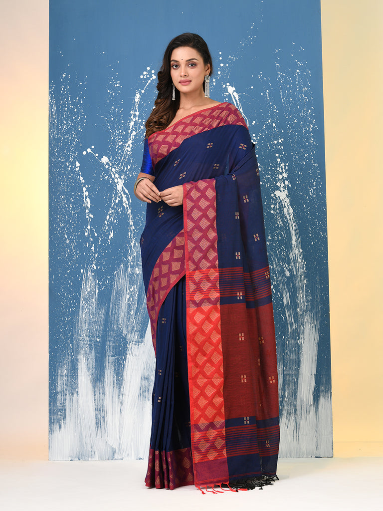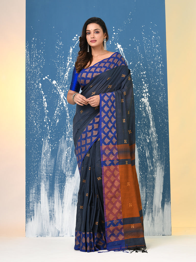 Navy Blue Geometric Motifs Cotton Handspun Soft Saree