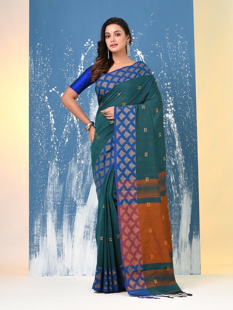 Teal Geometric Motifs Cotton Handspun Soft Saree