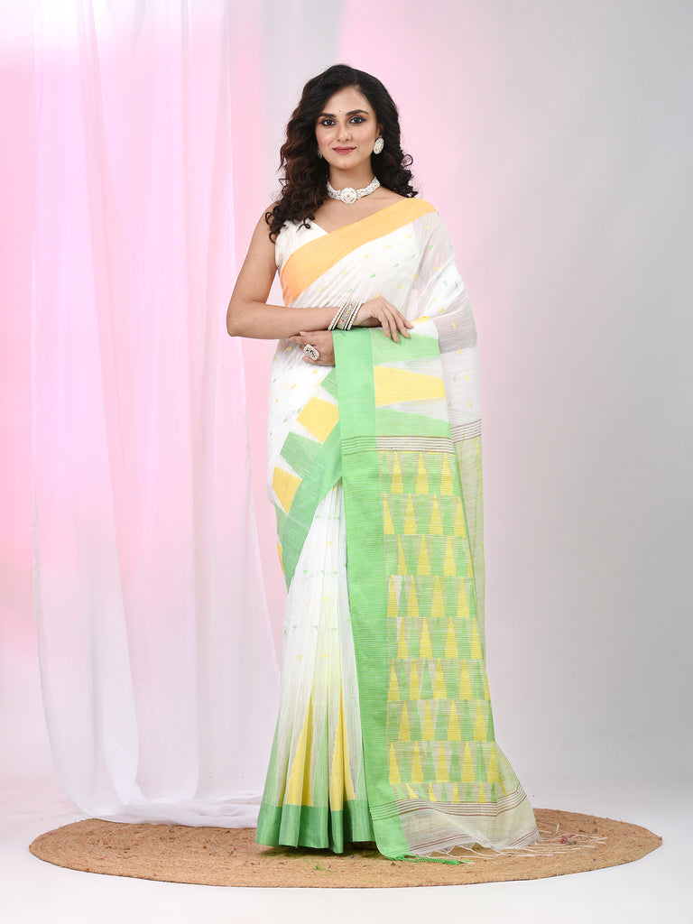 White Handspun Cotton Saree with Geometric Motif and Bright Hues