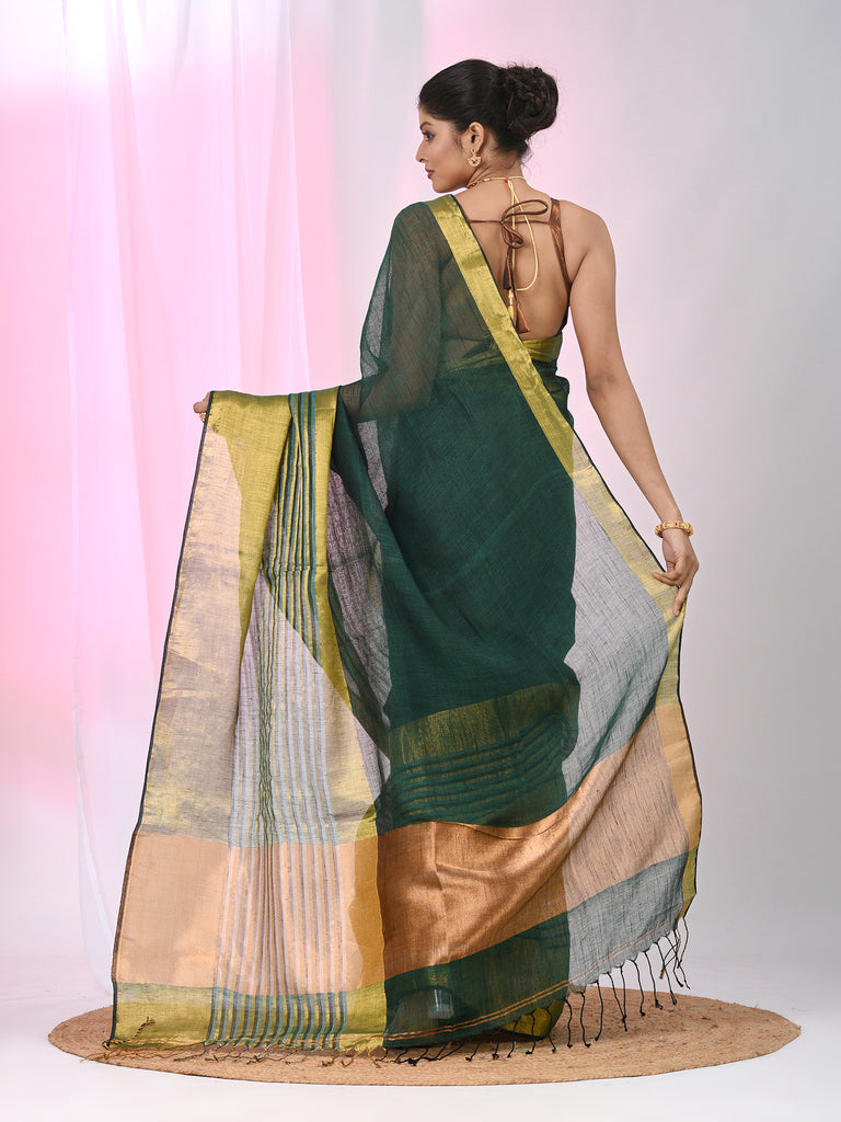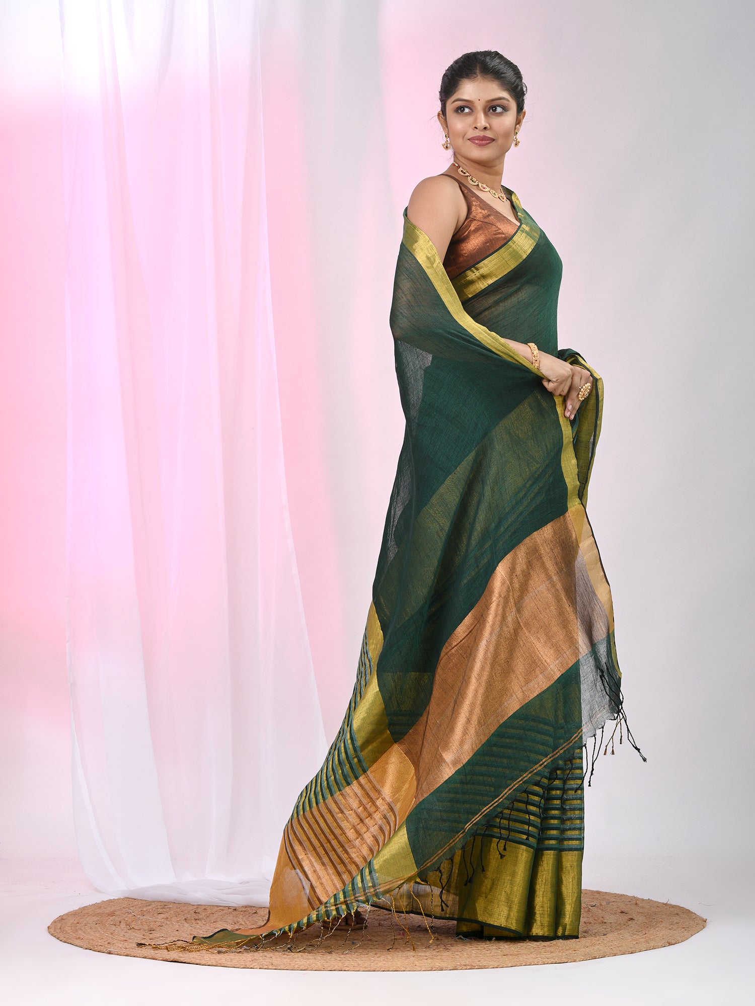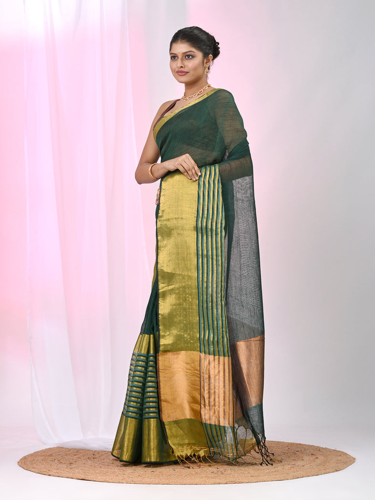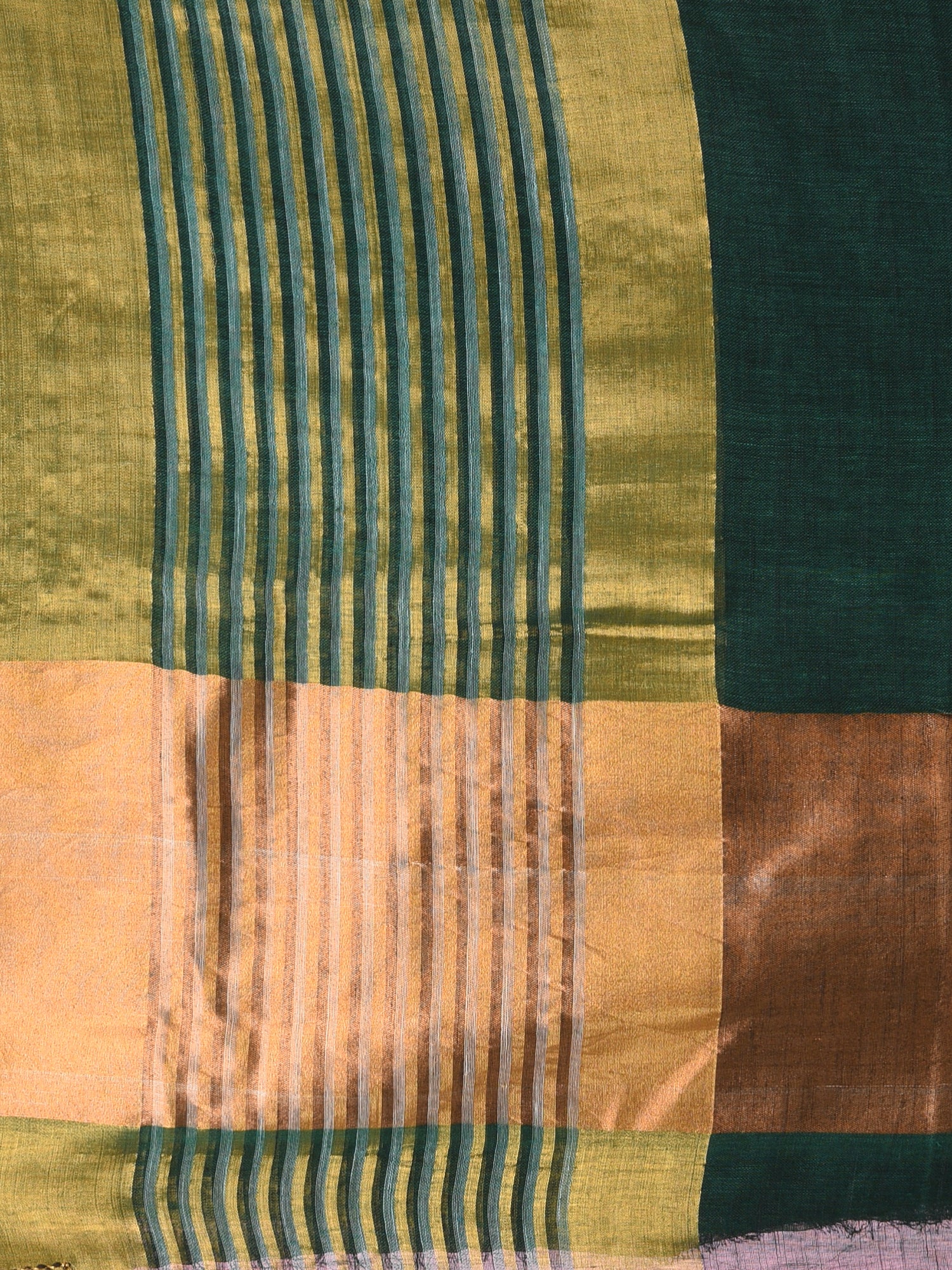 Add a touch of timeless elegance to your wardrobe with this exquisite green and gold linen saree. The saree features a sophisticated blend of vibrant green and shimmering gold hues, creating a luxurious and rich look. The subtle striped borders enhance its appeal, offering a perfect balance of tradition and contemporary style. Crafted from high-quality linen, it ensures comfort and breathability, making it ideal for both day and evening occasions. This saree is perfect for weddings, festive events, and special celebrations, providing an effortlessly graceful and refined look. Pair it with a contrasting blouse to elevate your ensemble!