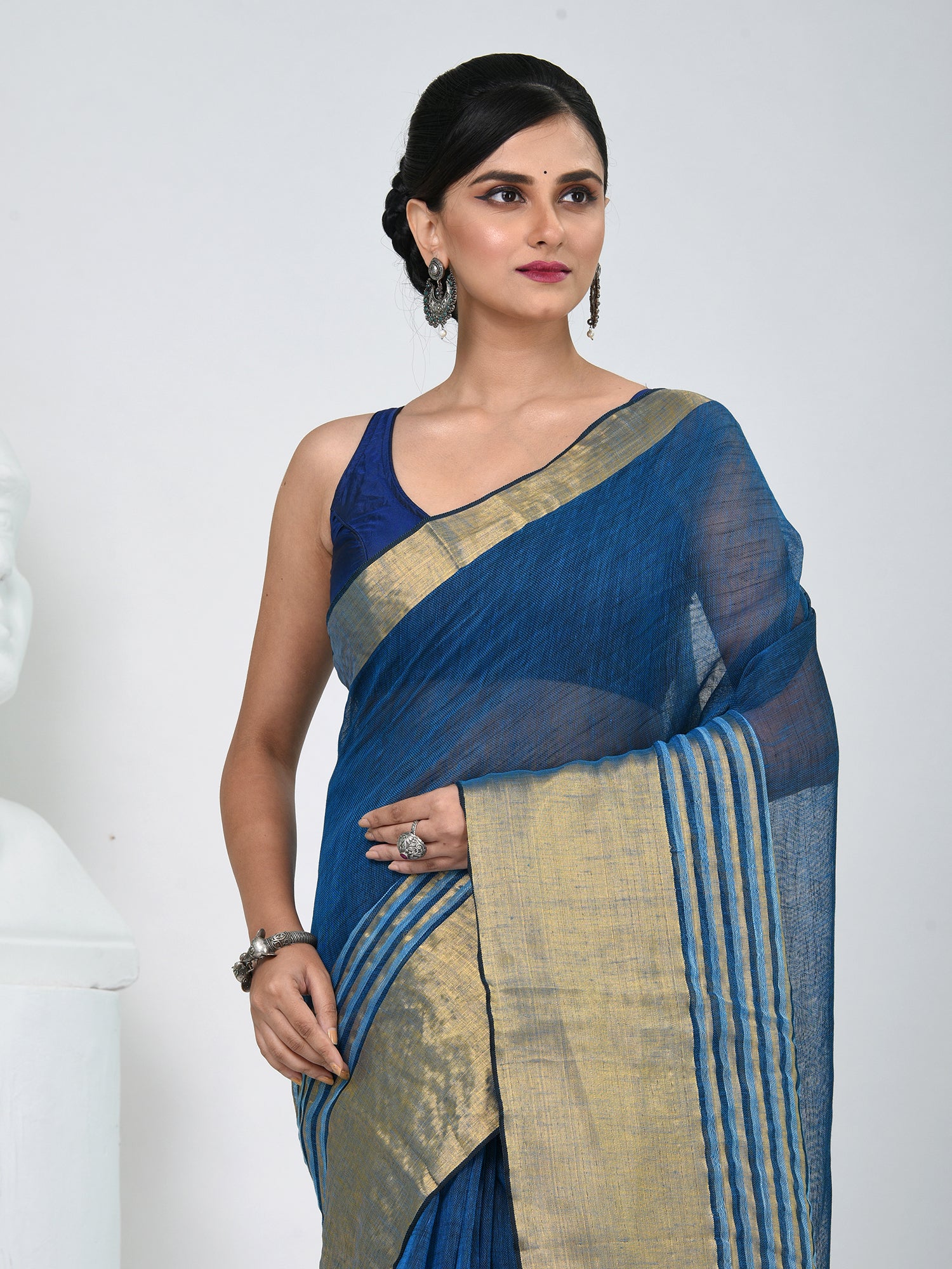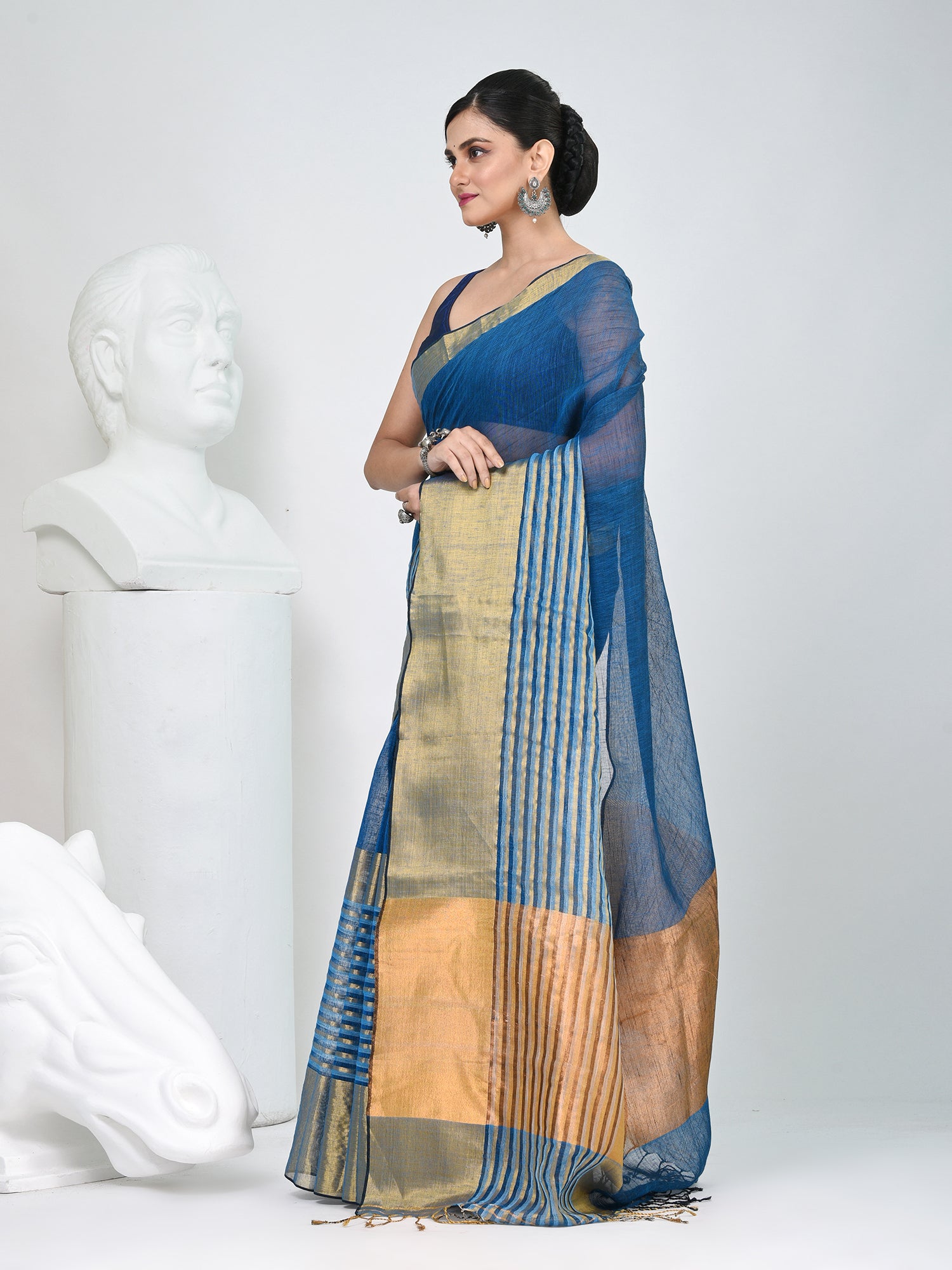 Add a touch of timeless elegance to your wardrobe with this exquisite sapphire blue and gold linen saree. The saree features a sophisticated blend of vibrant sapphire blue and shimmering gold hues, creating a luxurious and rich look. The subtle striped borders enhance its appeal, offering a perfect balance of tradition and contemporary style. Crafted from high-quality linen, it ensures comfort and breathability, making it ideal for both day and evening occasions. This saree is perfect for weddings, festive events, and special celebrations, providing an effortlessly graceful and refined look. Pair it with a contrasting blouse to elevate your ensemble!