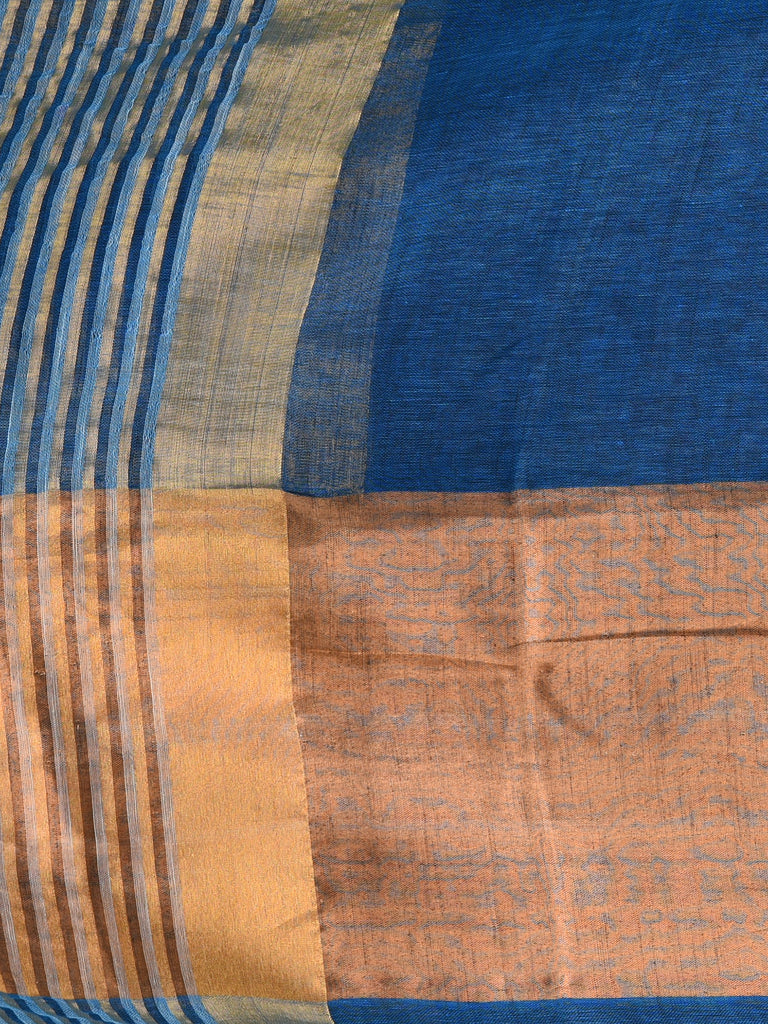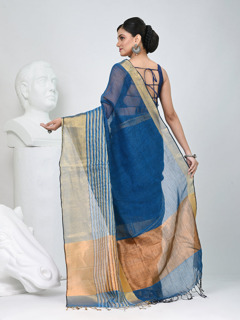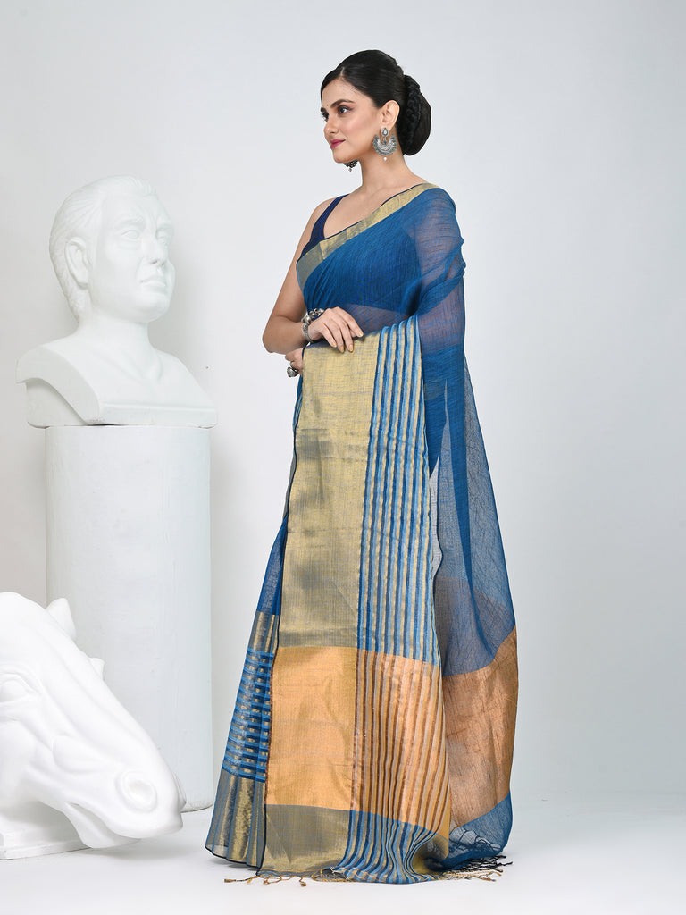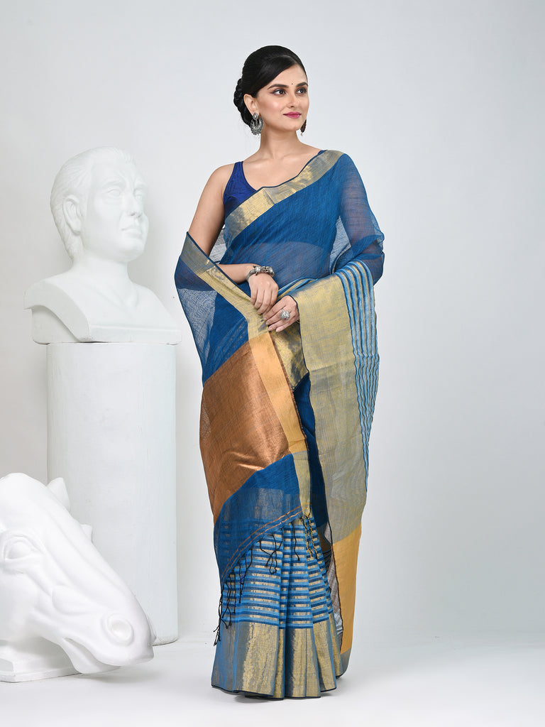 Elegant Sapphire Blue And Gold Linen Saree with Striped Borders