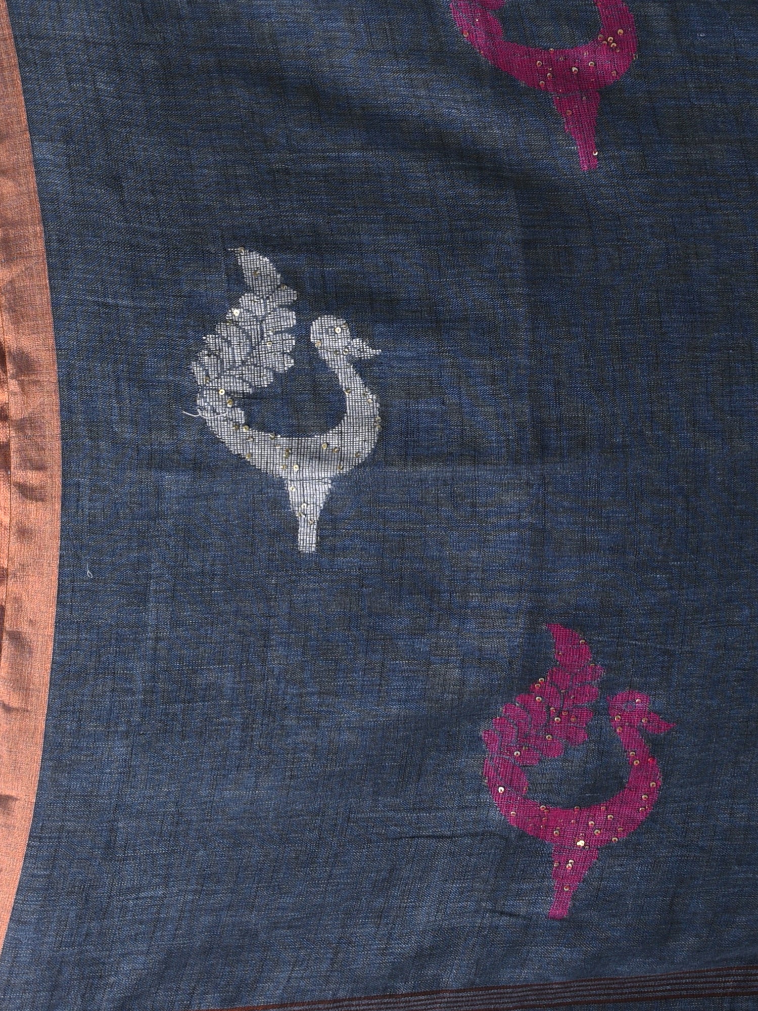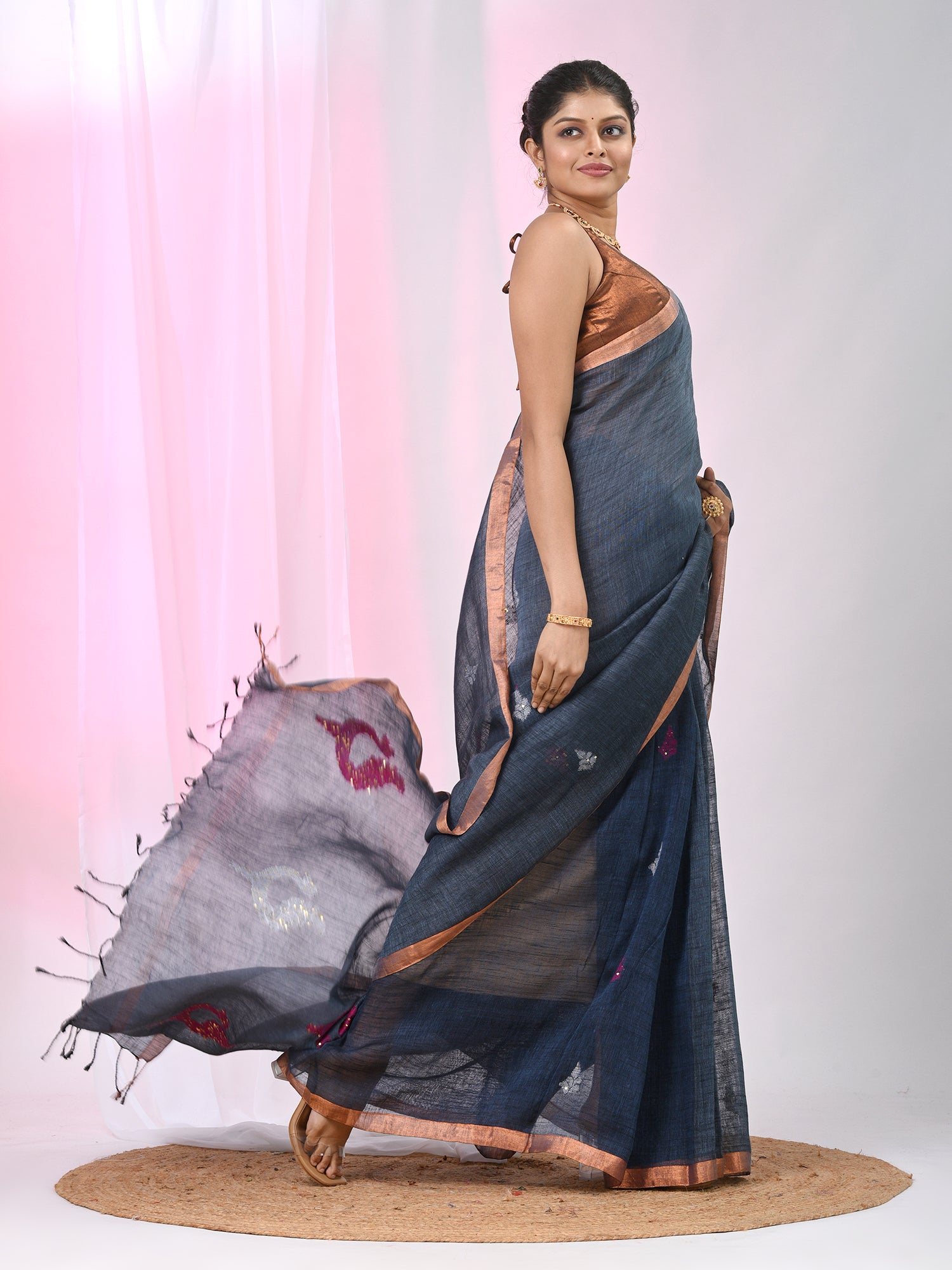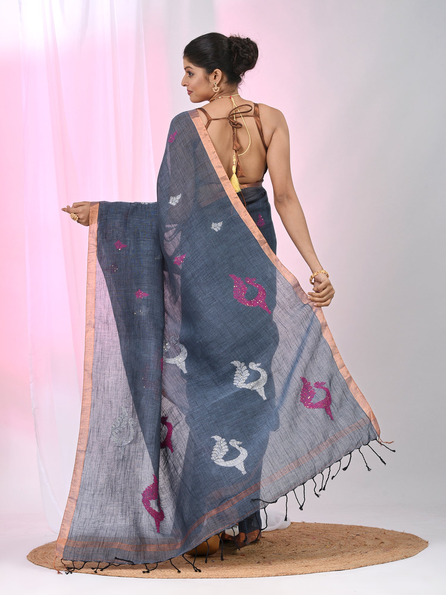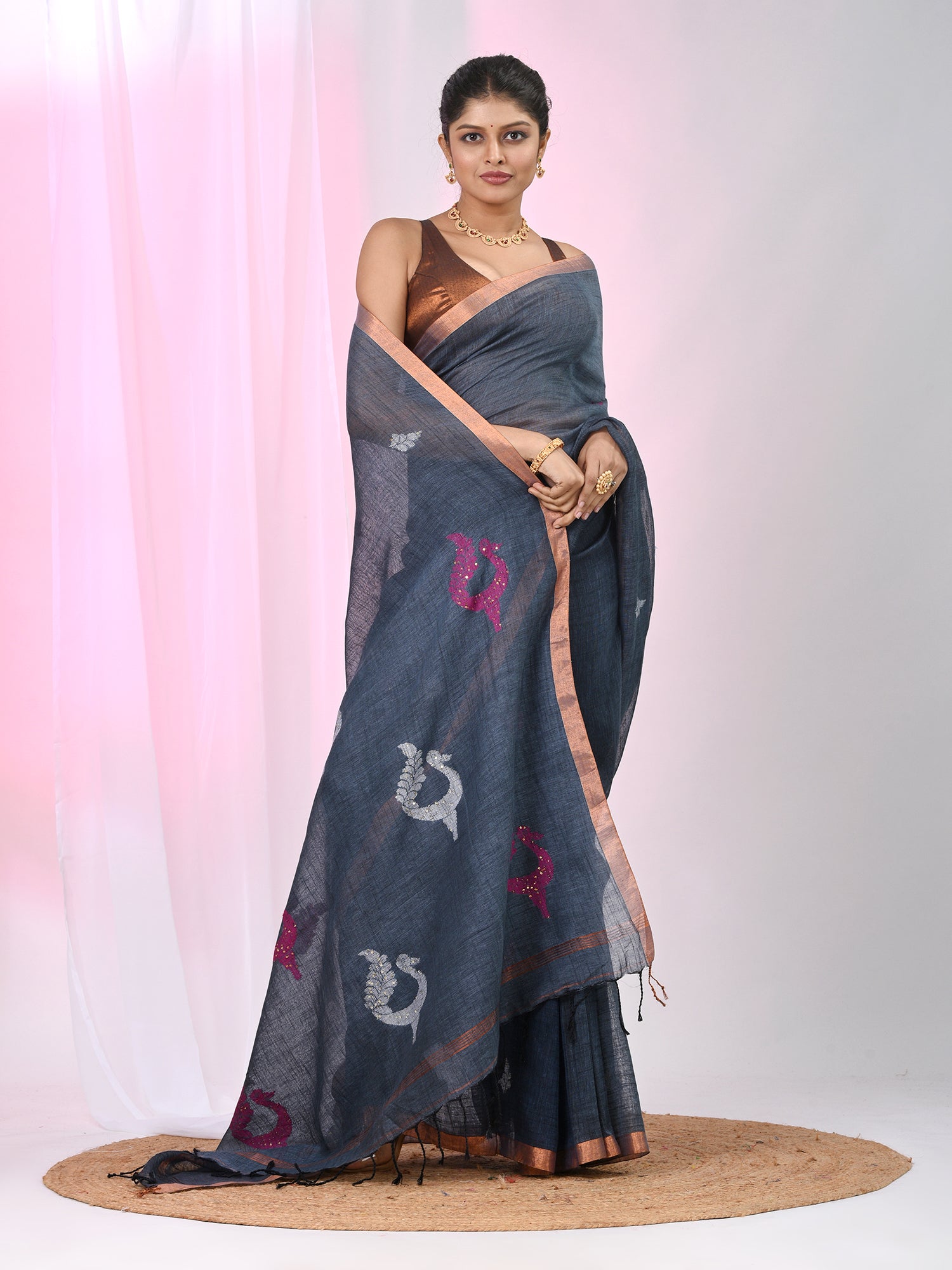 This elegant grey linen saree is the epitome of grace and simplicity, featuring beautiful pink and white bird & texture motifs delicately embroidered throughout the fabric. The soft, breathable linen ensures comfort while the serene grey base allows the vibrant pink motifs to stand out beautifully. The saree is finished with a subtle zari border, adding a touch of warmth and sophistication. Ideal for day events, casual gatherings, or festive occasions, this saree blends modern charm with traditional appeal, offering a timeless and chic look. Pair it with a matching blouse to complete your graceful ensemble!