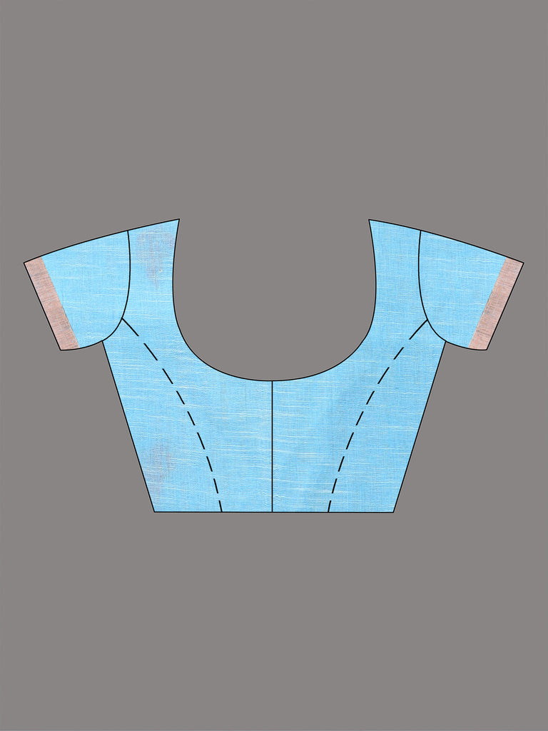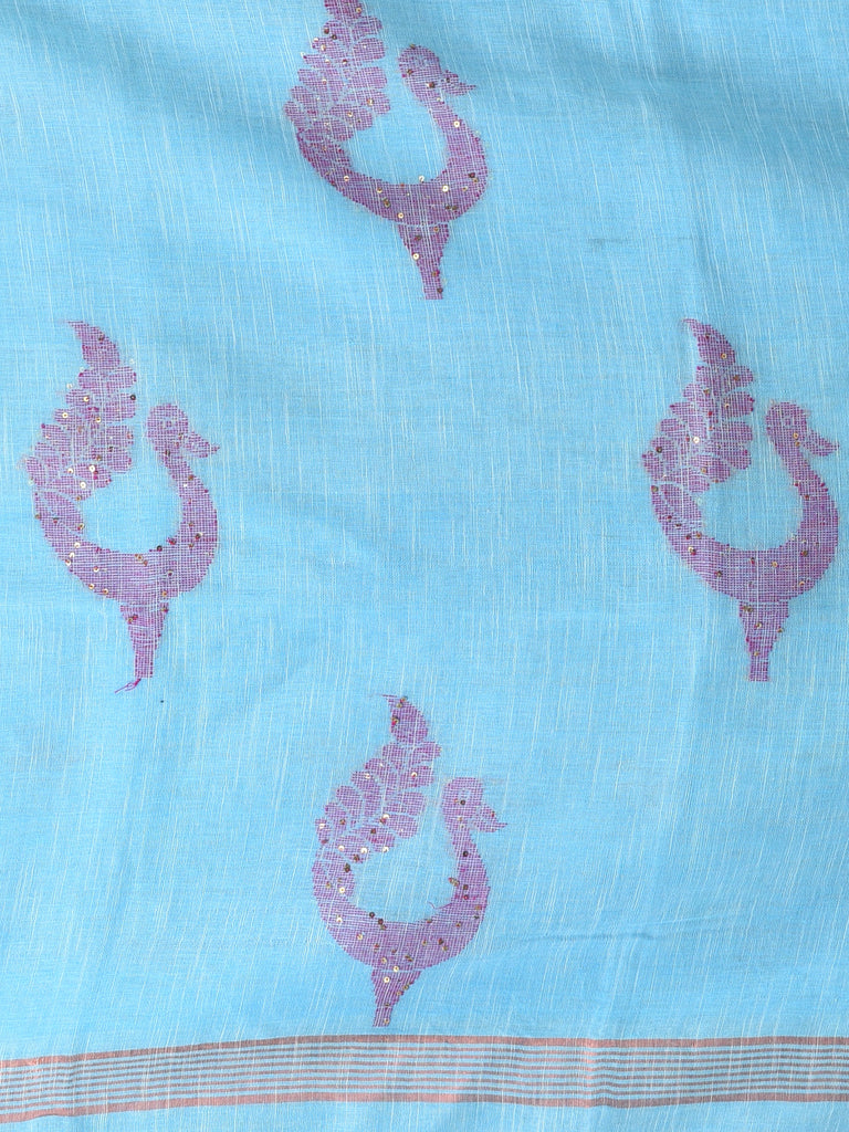 Sky Blue Linen Saree with Pink Bird & Texture Motifs and Zari Borders