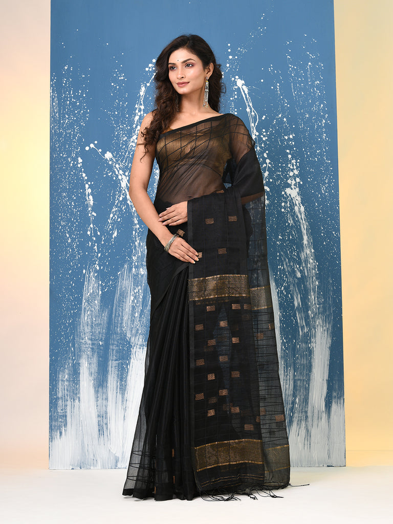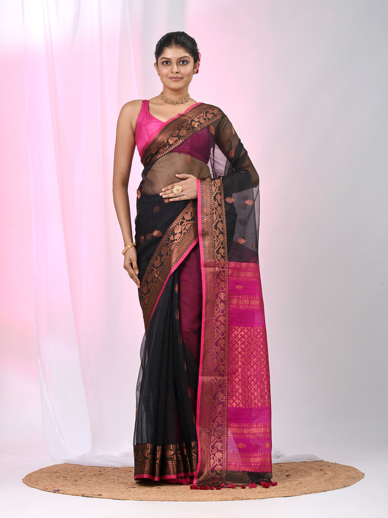 PEACH BLENDED MUSLIN SAREE WITH BLACK PALLU