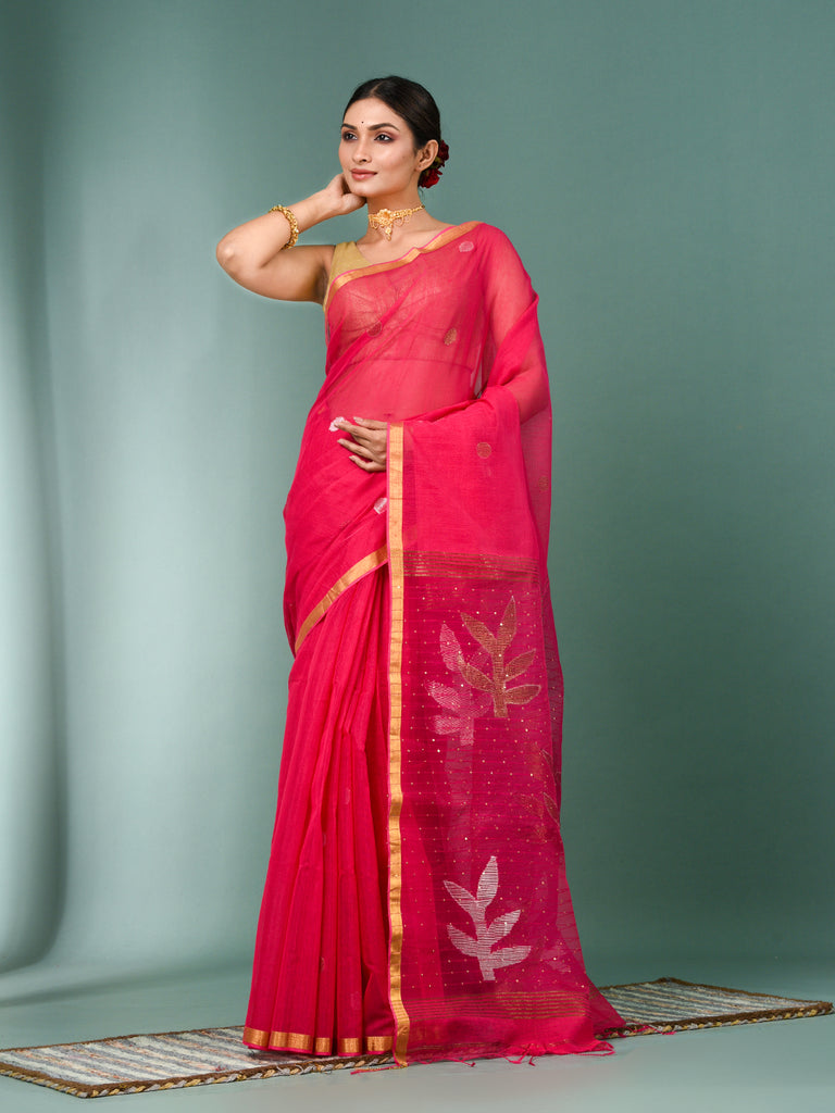Pink Muslin Silk Handwoven Saree With Zari Border