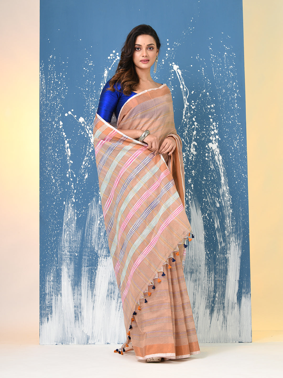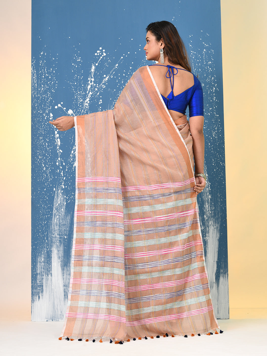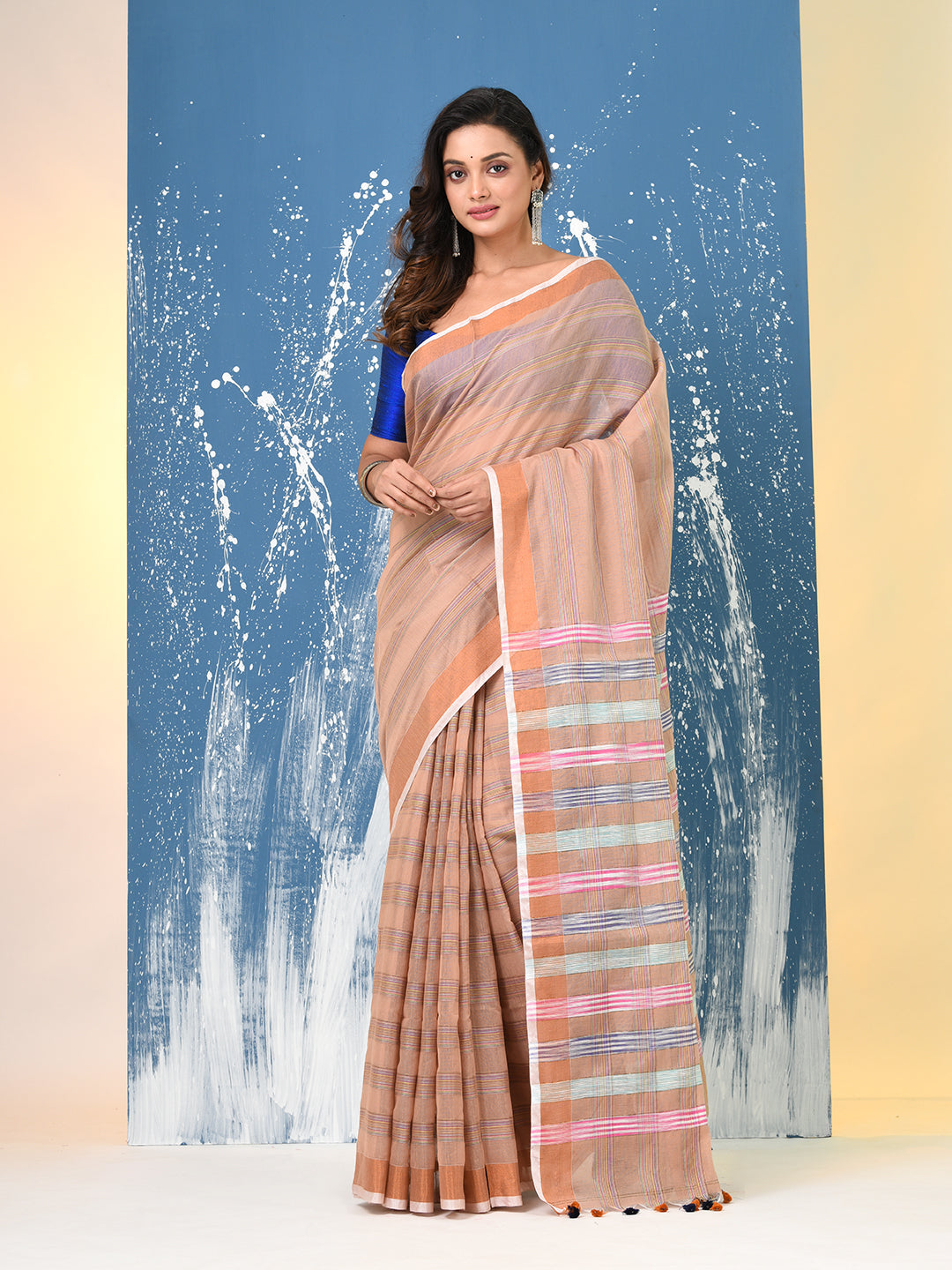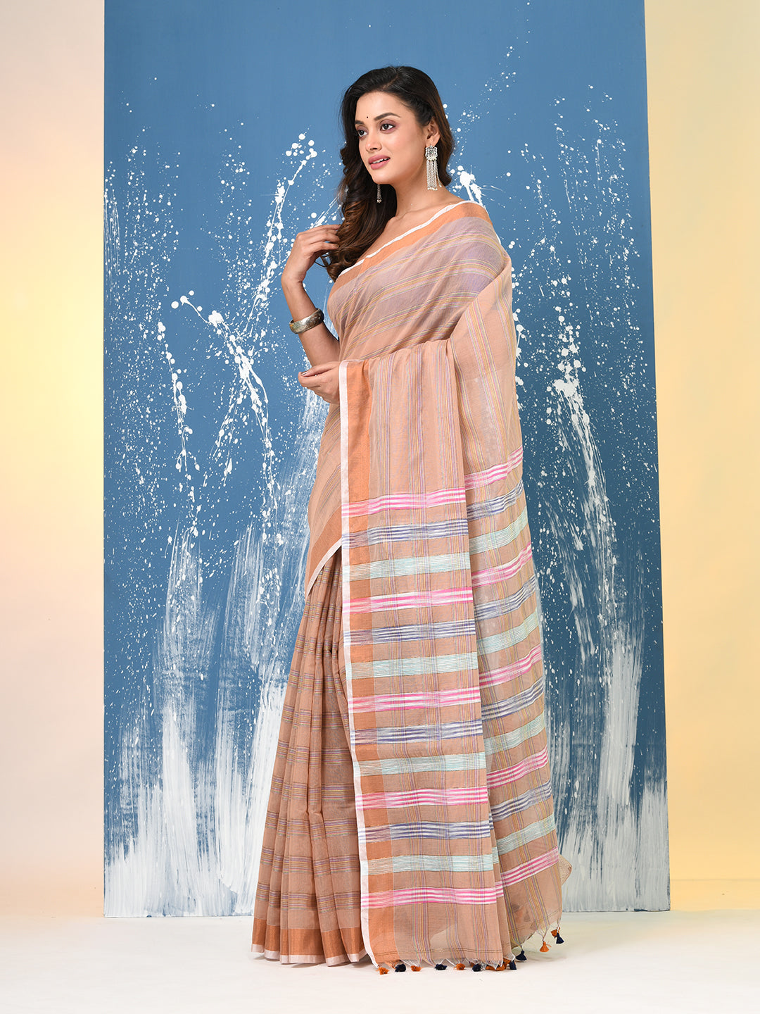 Beige Stripes Cotton Handspun Soft Saree