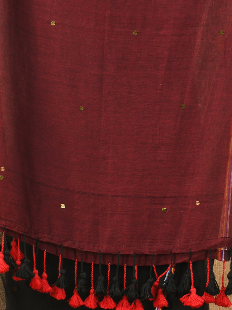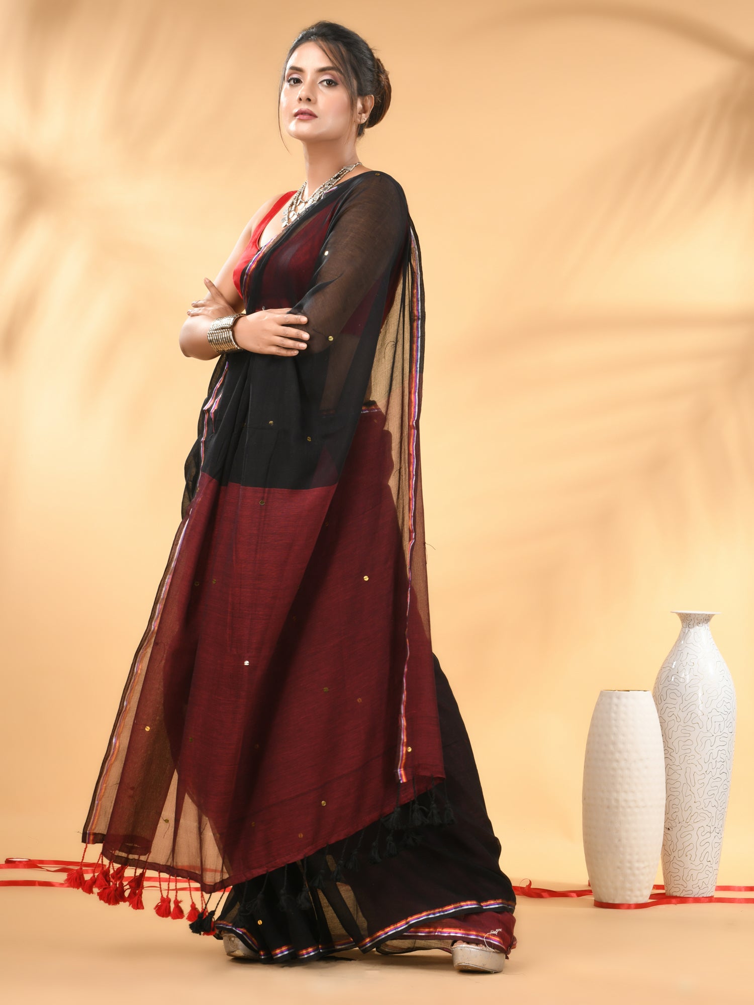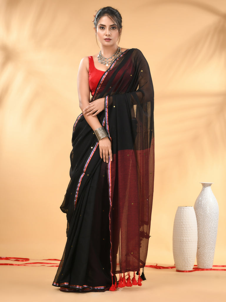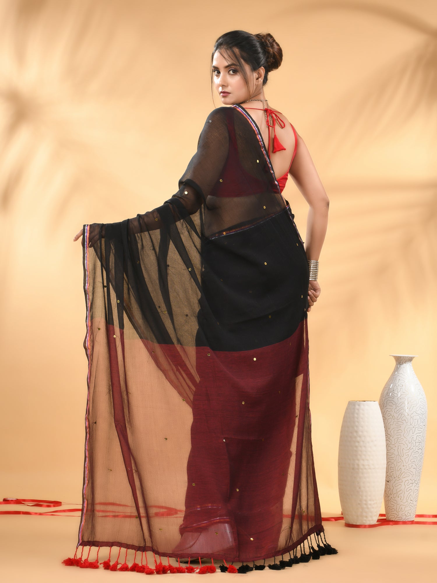 Turn heads with the timeless elegance of the Black And Red Sequin Mulmul Saree. Crafted from feather-light mulmul cotton, this saree features a striking deep red base with a sheer black overlay, adorned with delicate gold sequins that sparkle with every step. The pallu is accentuated with bold red and black tassels, adding a playful charm to its graceful drape. Ideal for evening soirées, festive gatherings, or elegant dinners, this saree is a statement in subtle glamour and comfort.