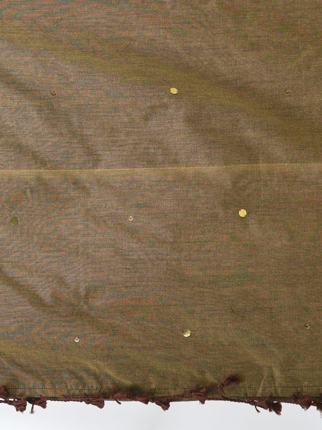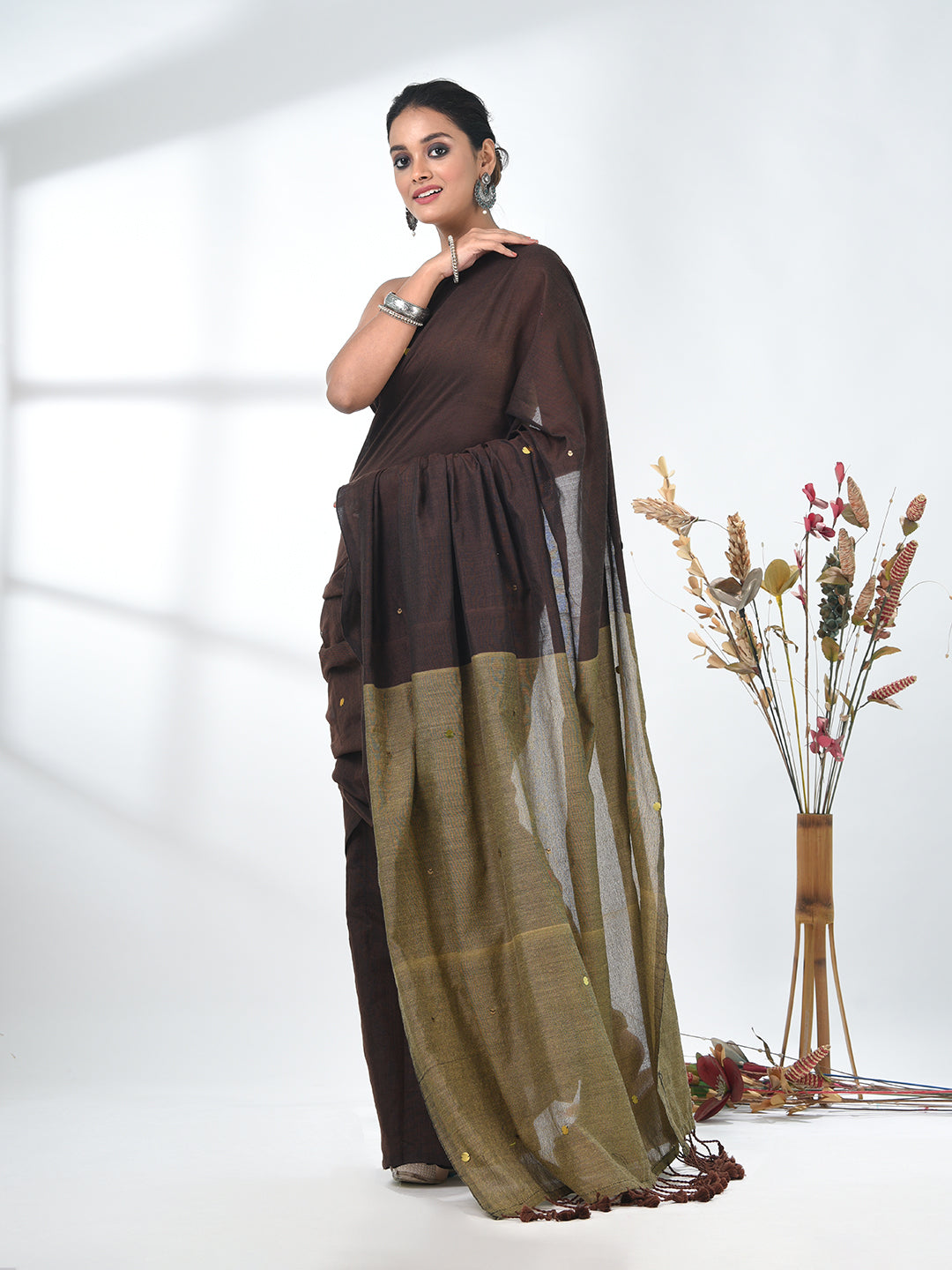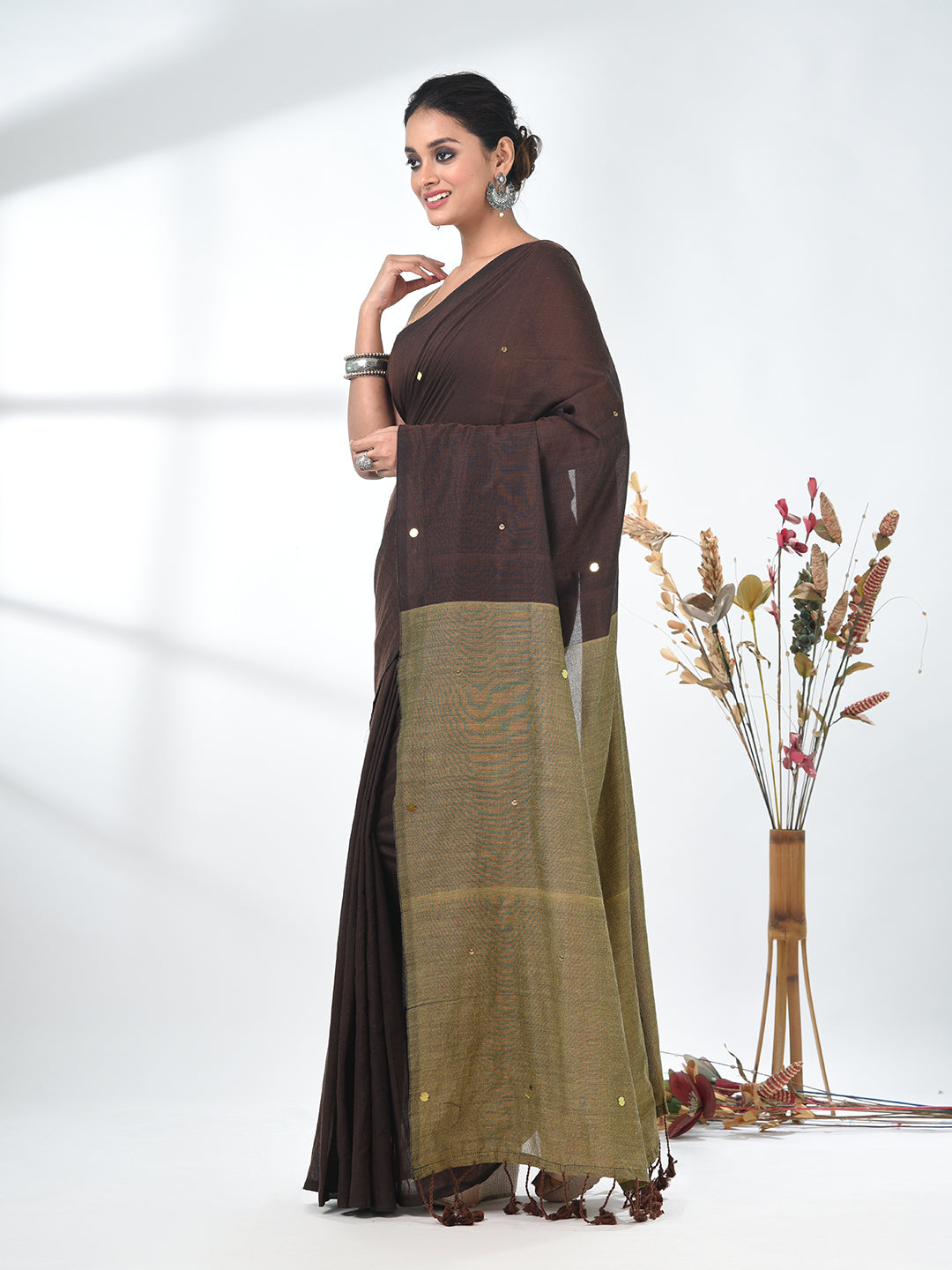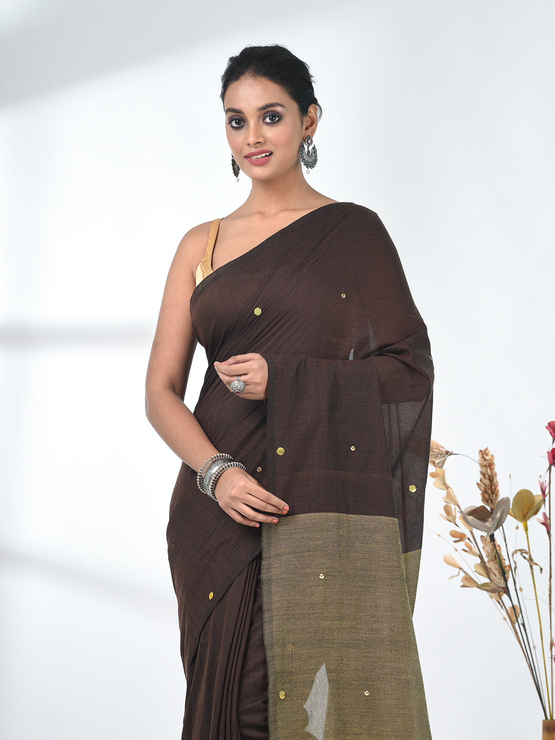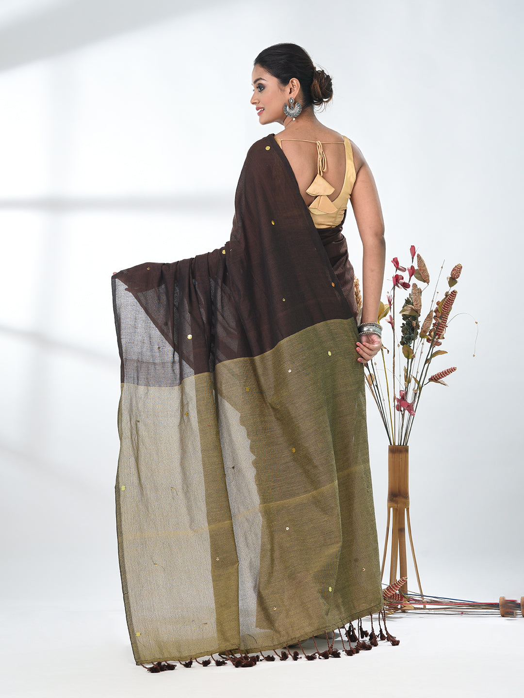 Brown Sequin-Detail Plain Saree with Beige Pallu