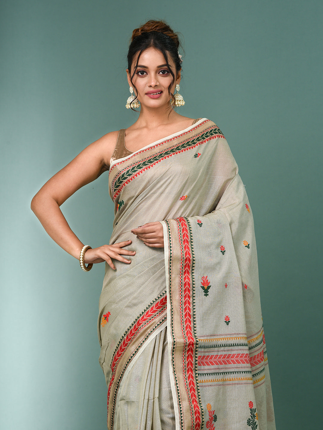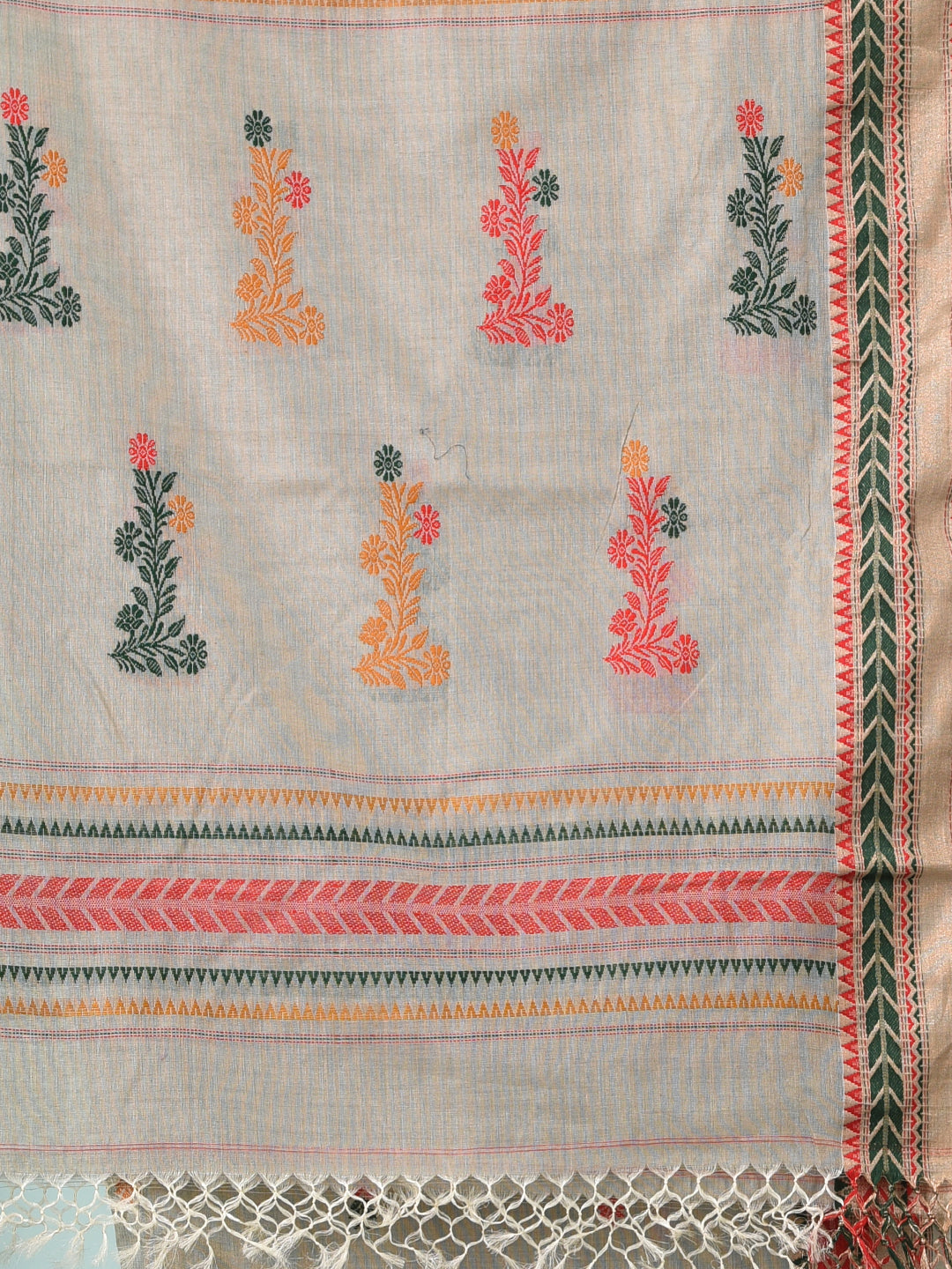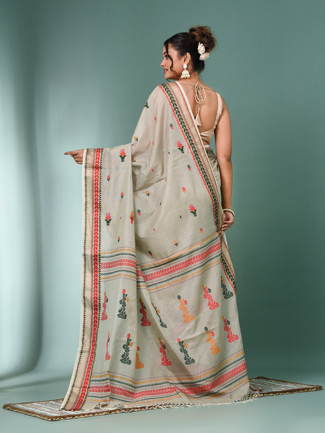 Ecru Floral Motifs Tussar Silk Soft Handloom Saree