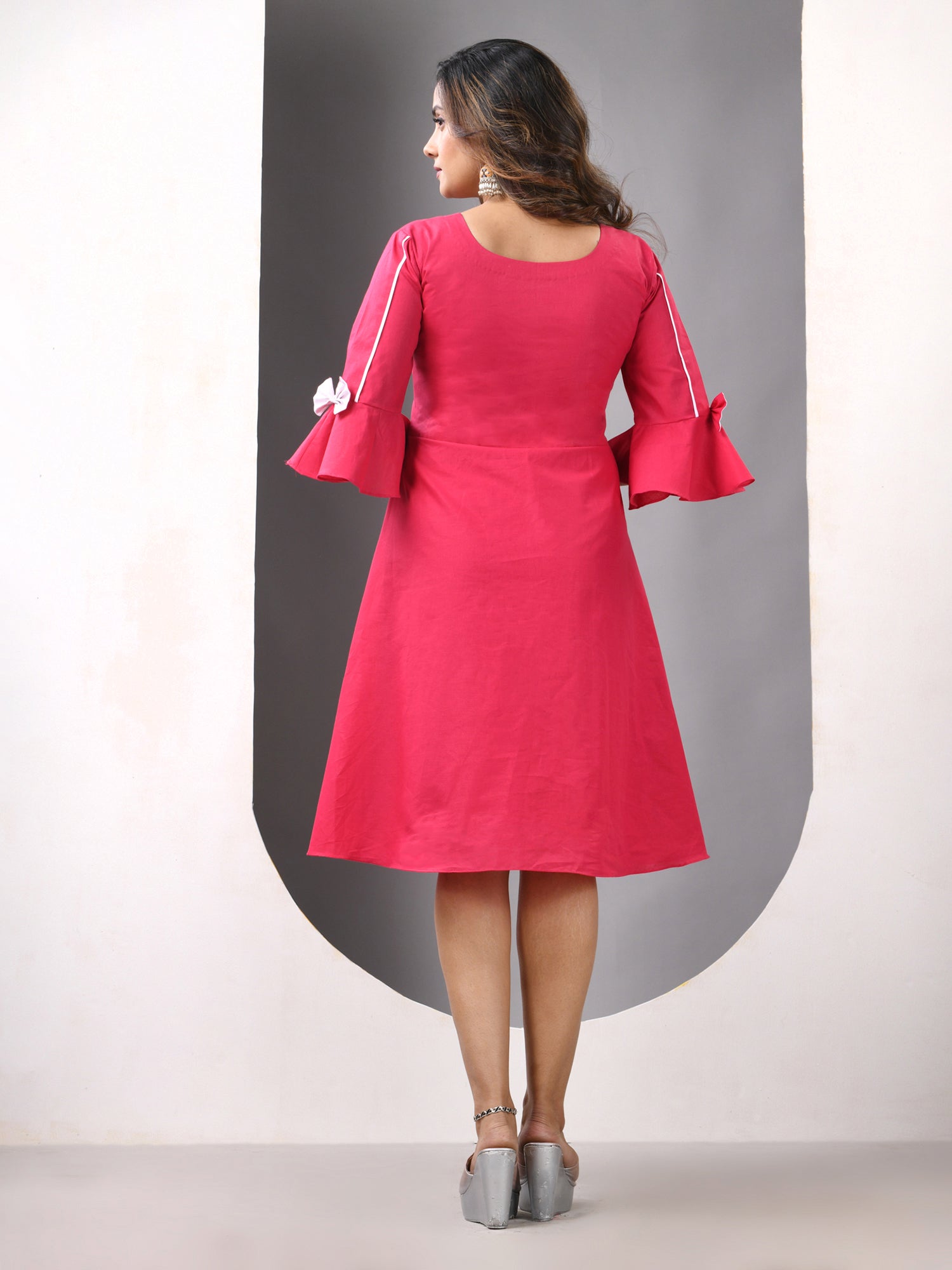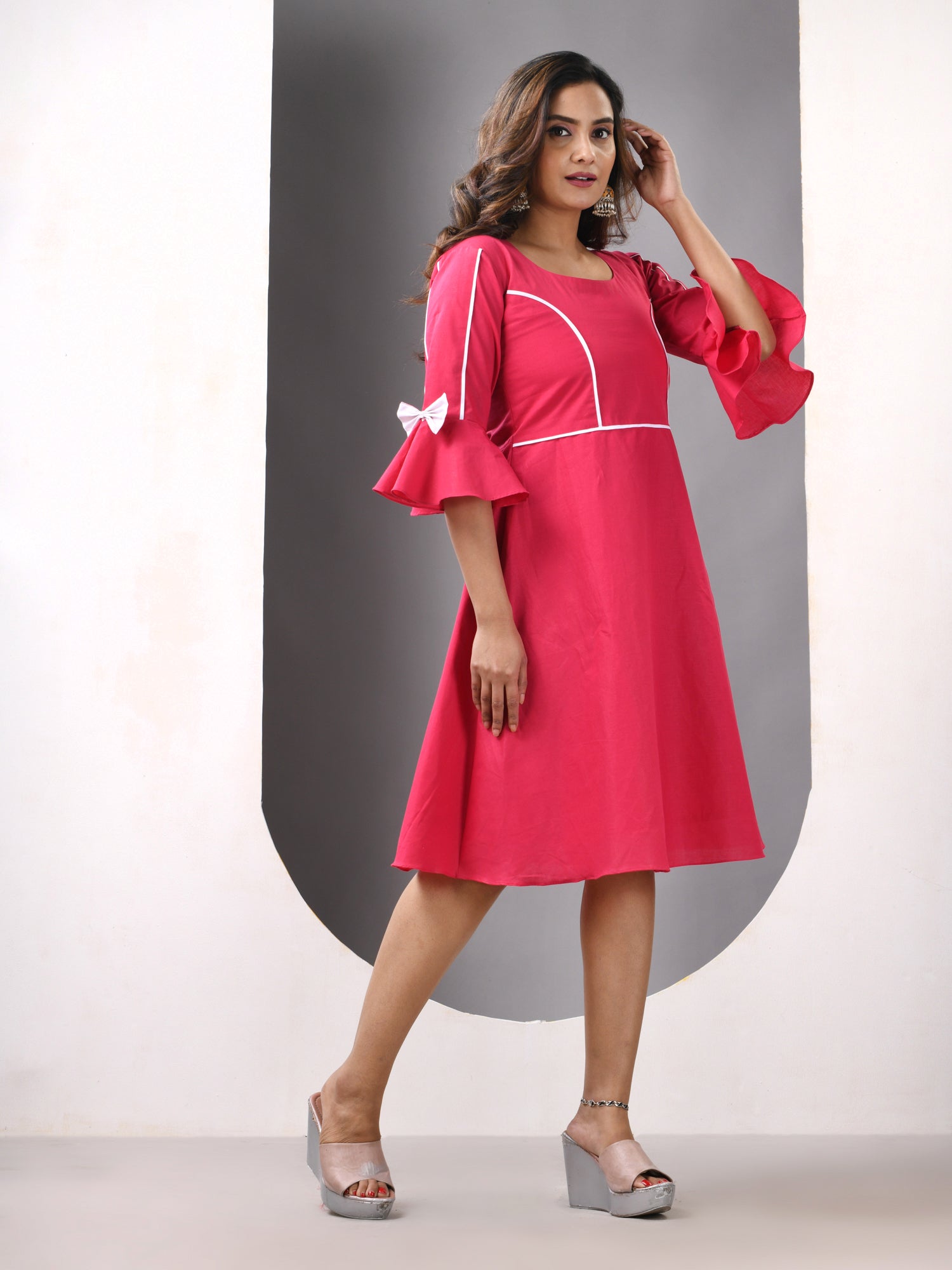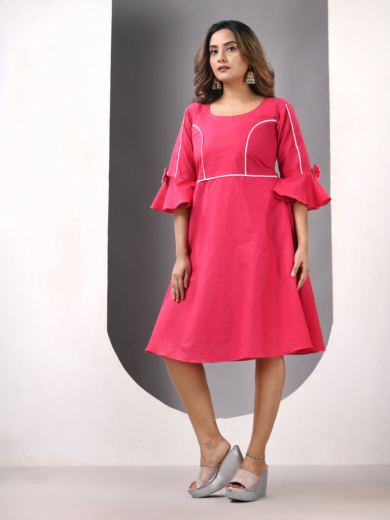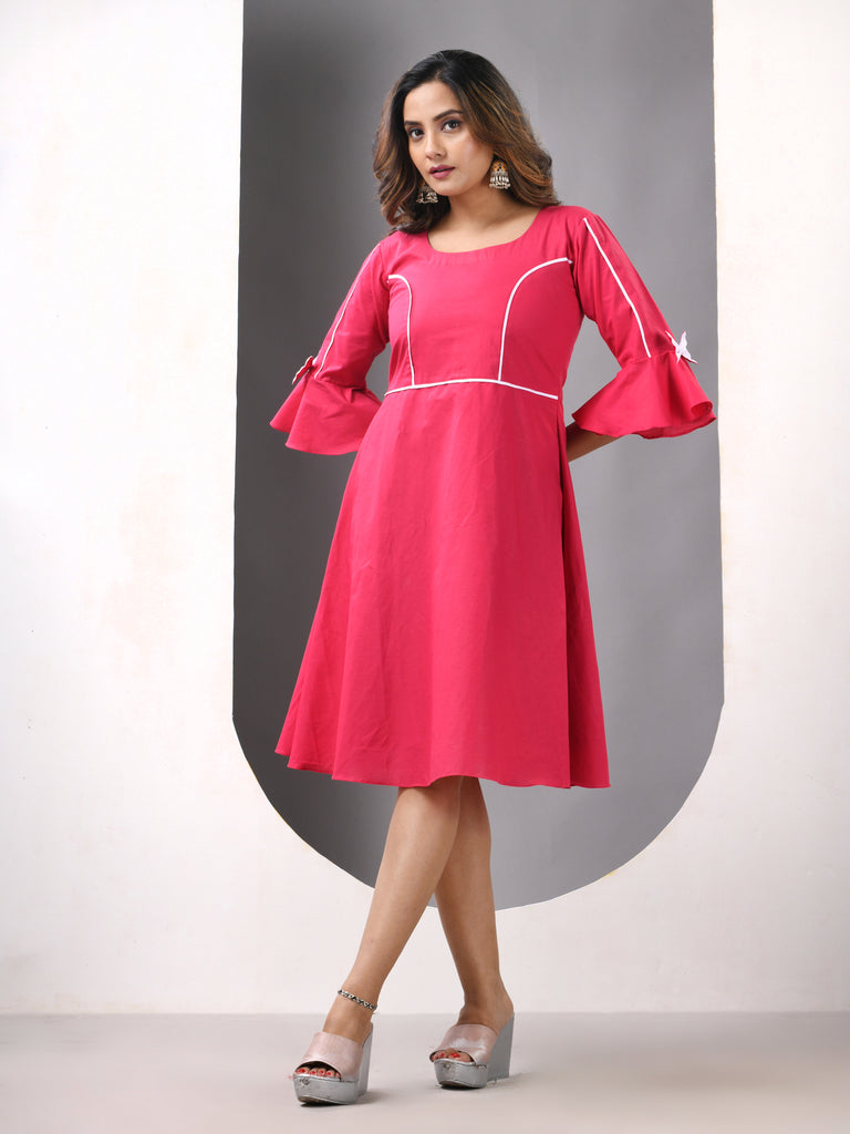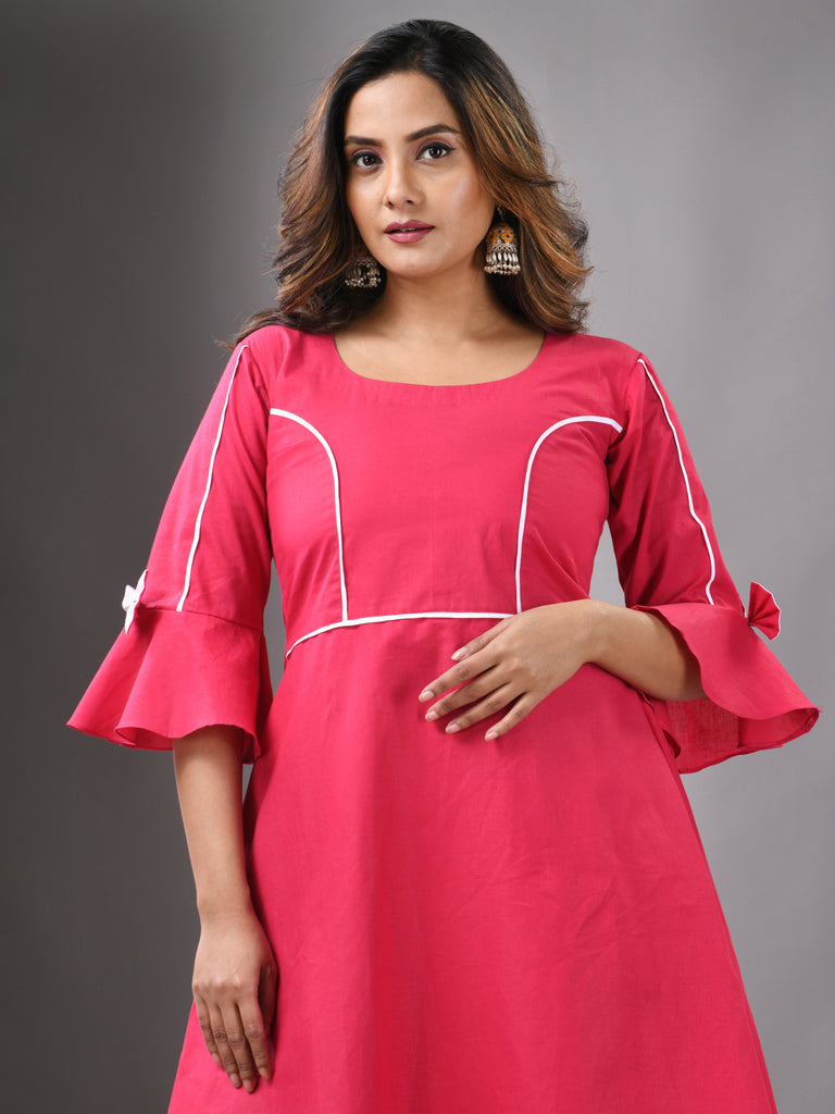 This fuchsia cotton ethnic dress with solid pattern is an elegant pick for any sophisticated occasion. Featuring an eye-catching round neckline and three quarter bell sleeves, this ethnic dress reflects modern charm. The flared skirt lends a touch of whimsy. Made from comfortable cotton fabric, this knee-length ethnic dress is perfect for a casual yet fashionable look that will make you stand out with style and grace.