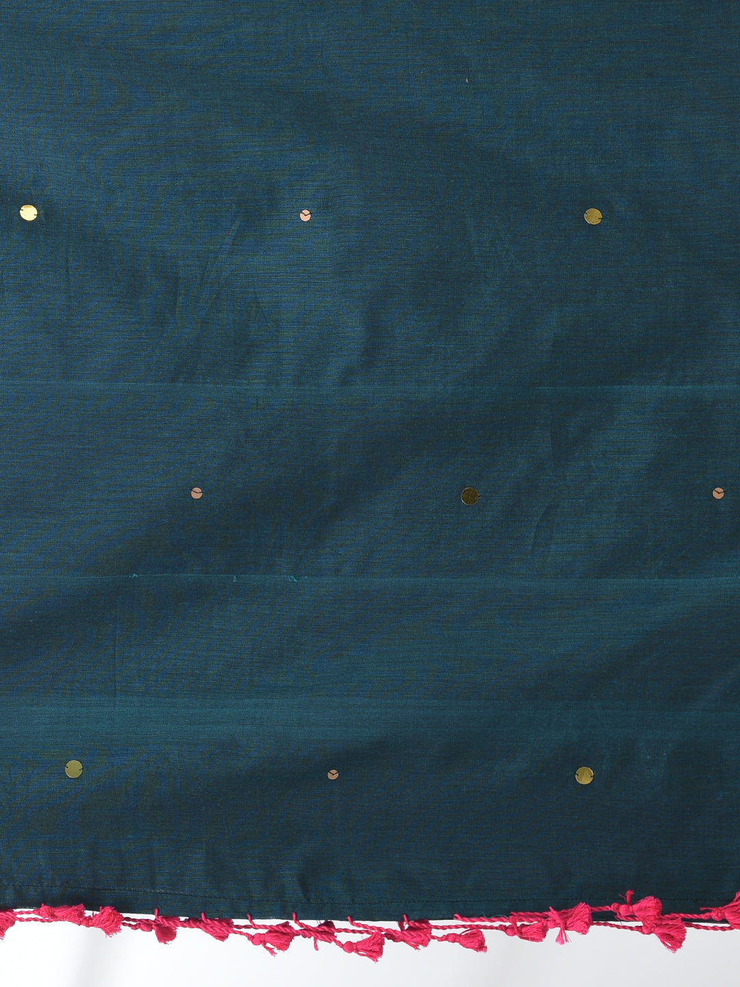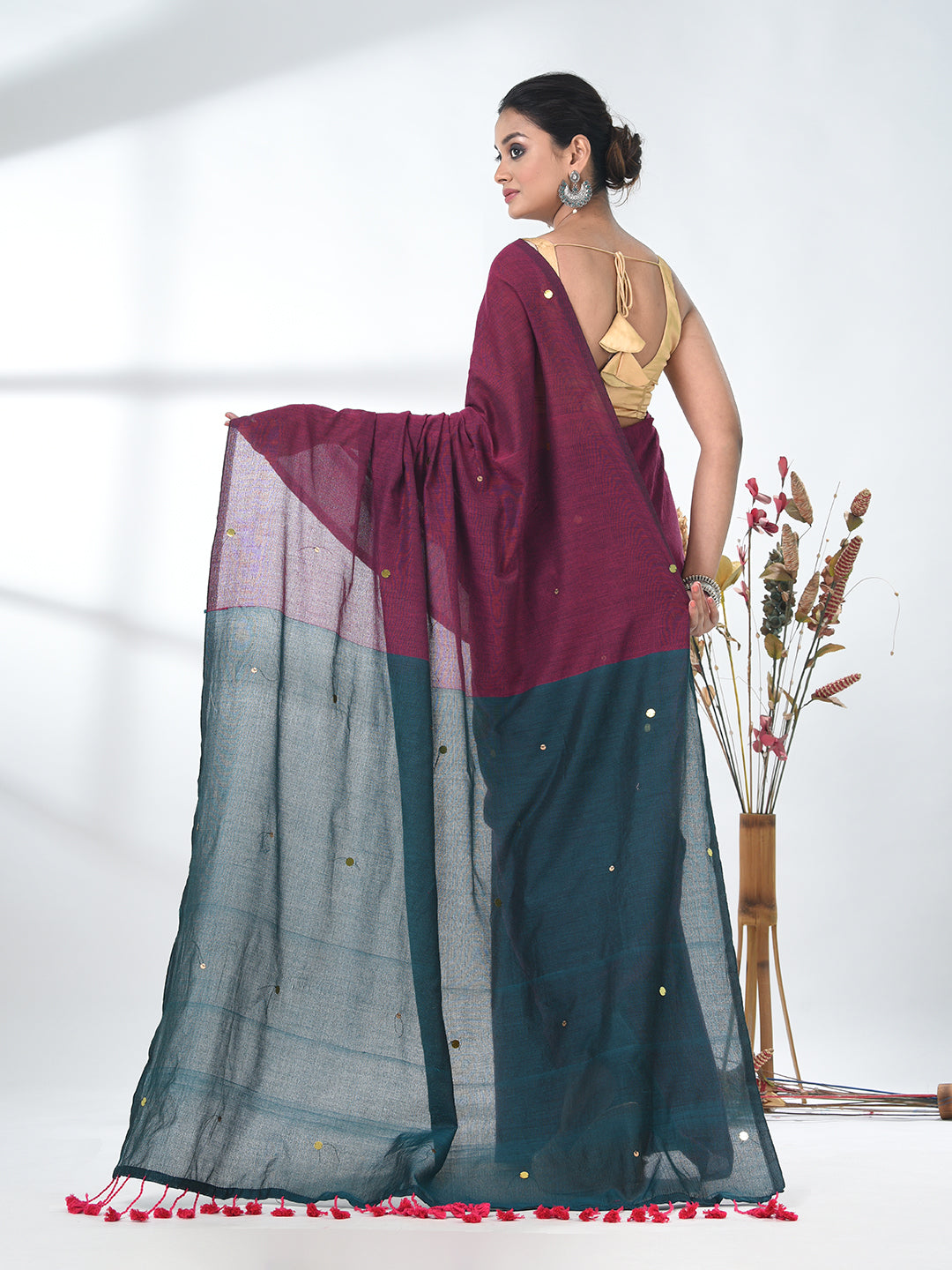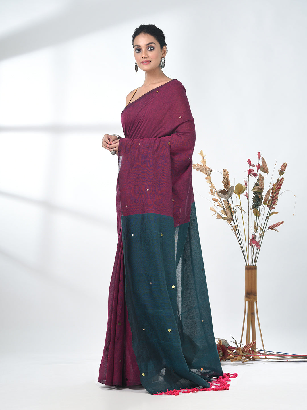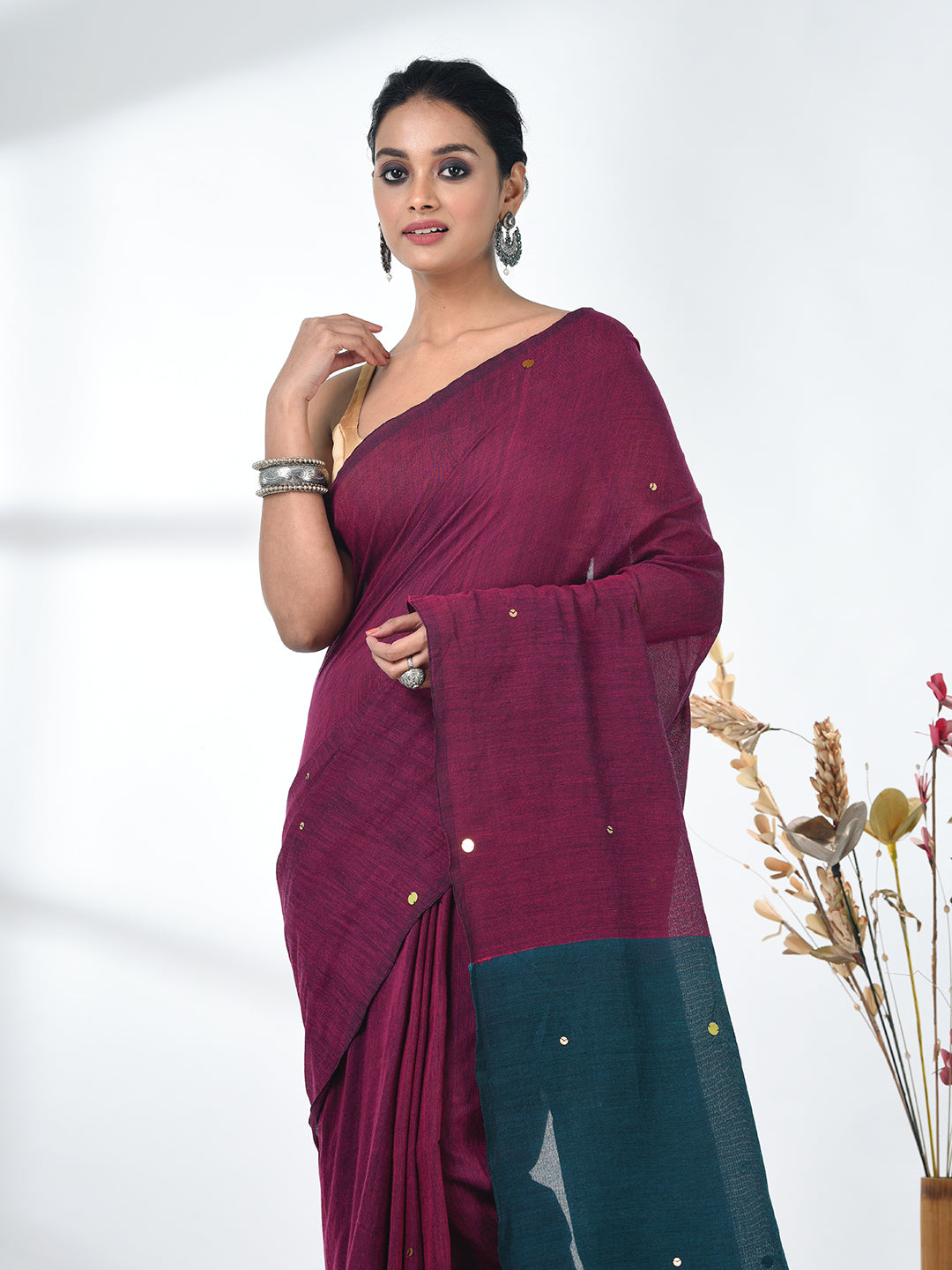 Magenta Sequin-Detail Plain Saree with Teal Pallu