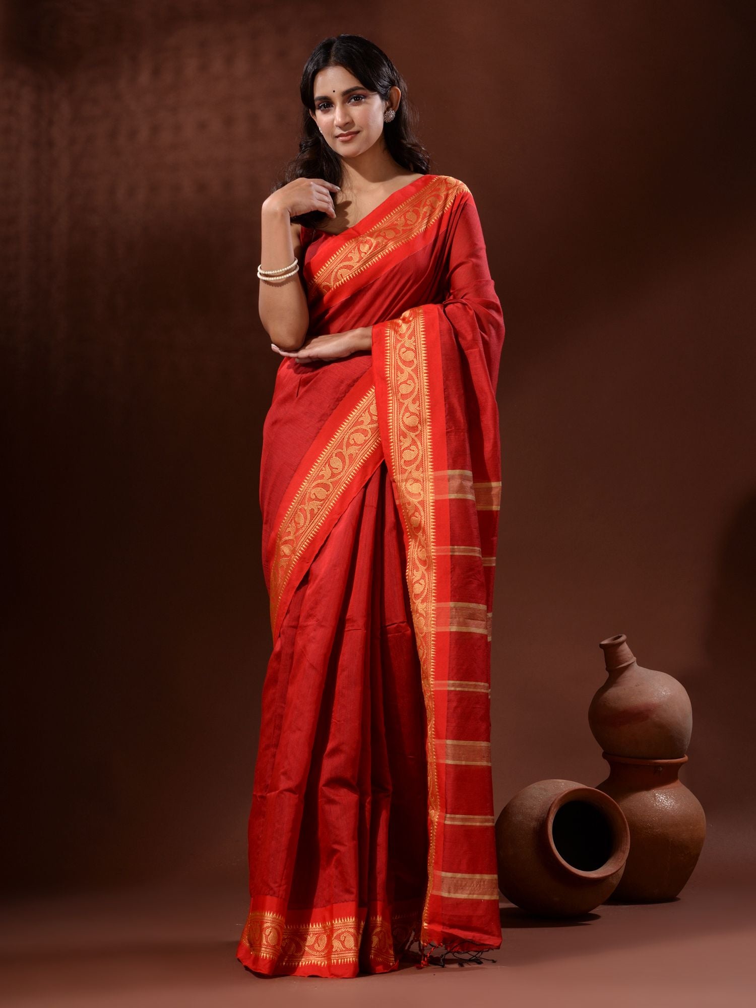 Red Cotton Silk Handwoven Saree With Nakshi Borders