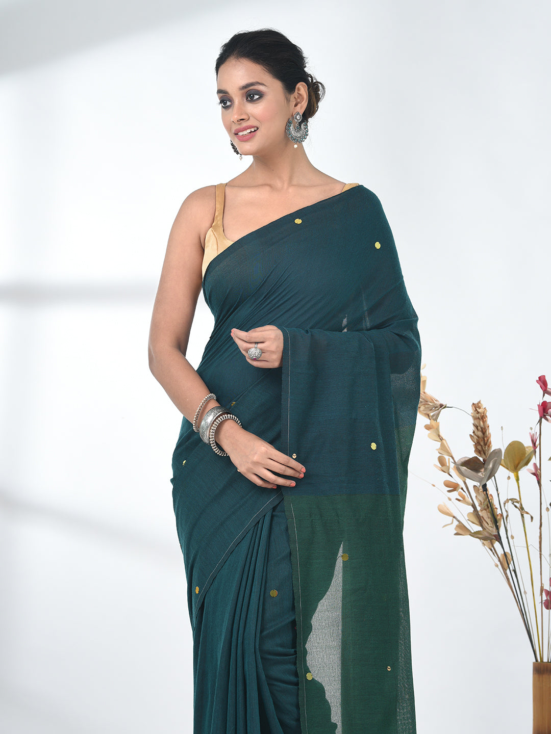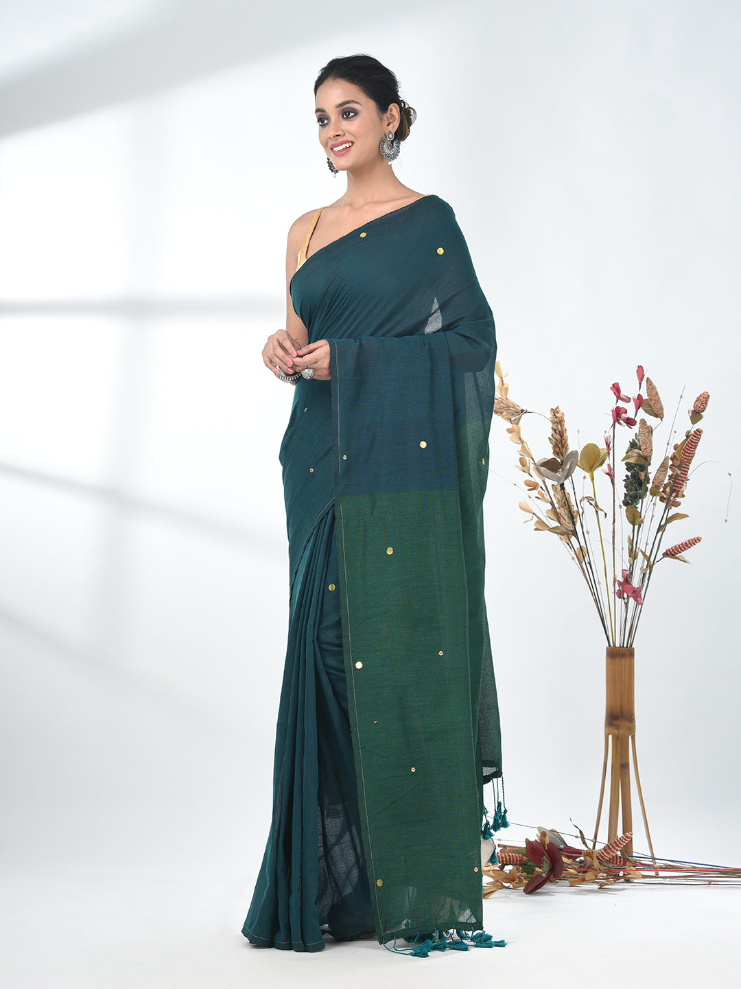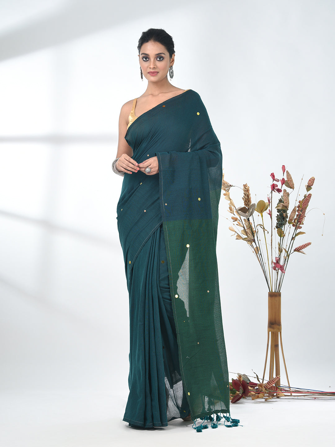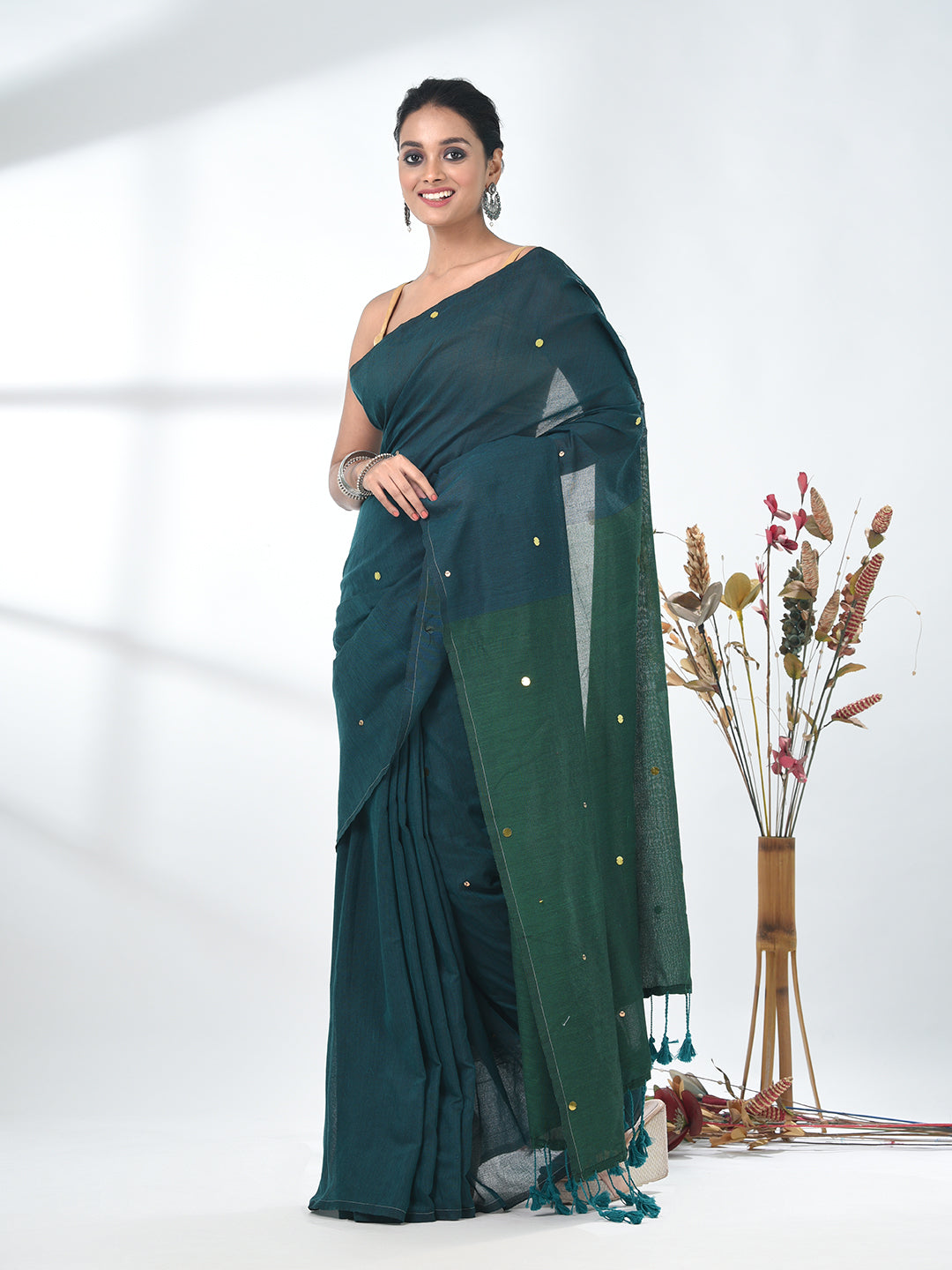 Elevate your style quotient with this stunning teal saree, featuring delicate sequin detailing that adds a touch of sparkle to the simplicity of the plain body. The saree comes with a green pallu, enhancing its overall charm and contrast. Crafted to perfection, this versatile saree is ideal for both festive occasions and formal gatherings. Pair it with your favorite accessories for a sophisticated and contemporary look.