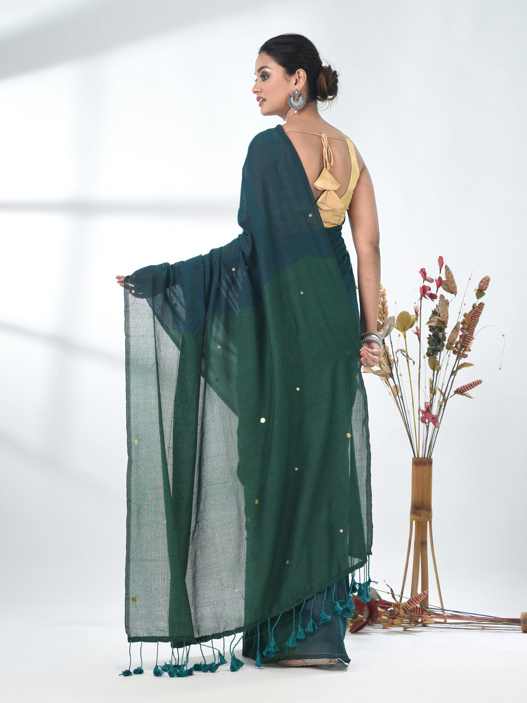 Teal Sequin-Detail Plain Saree with Green Pallu