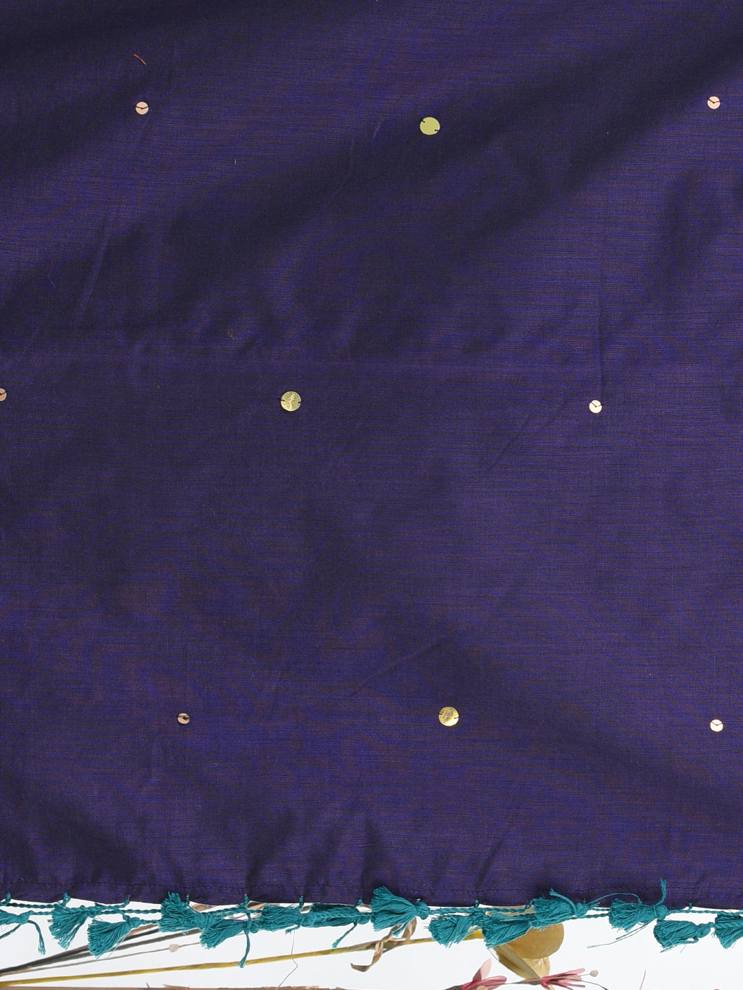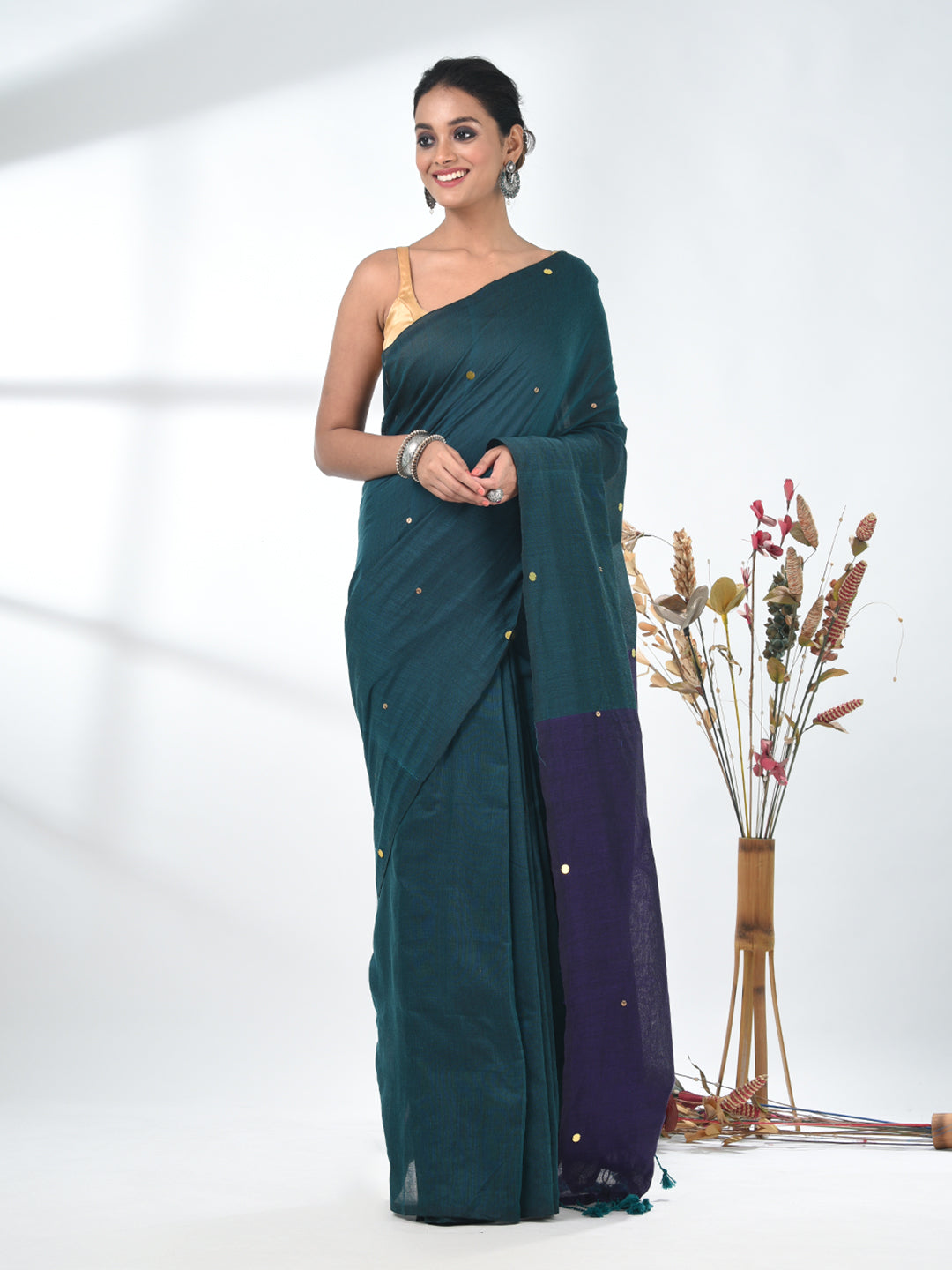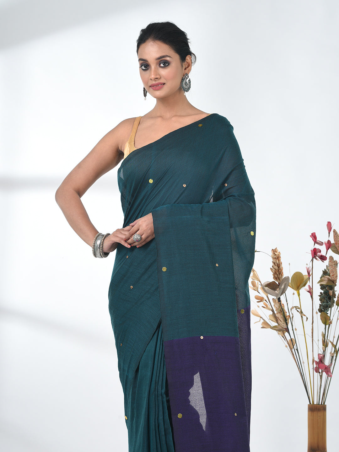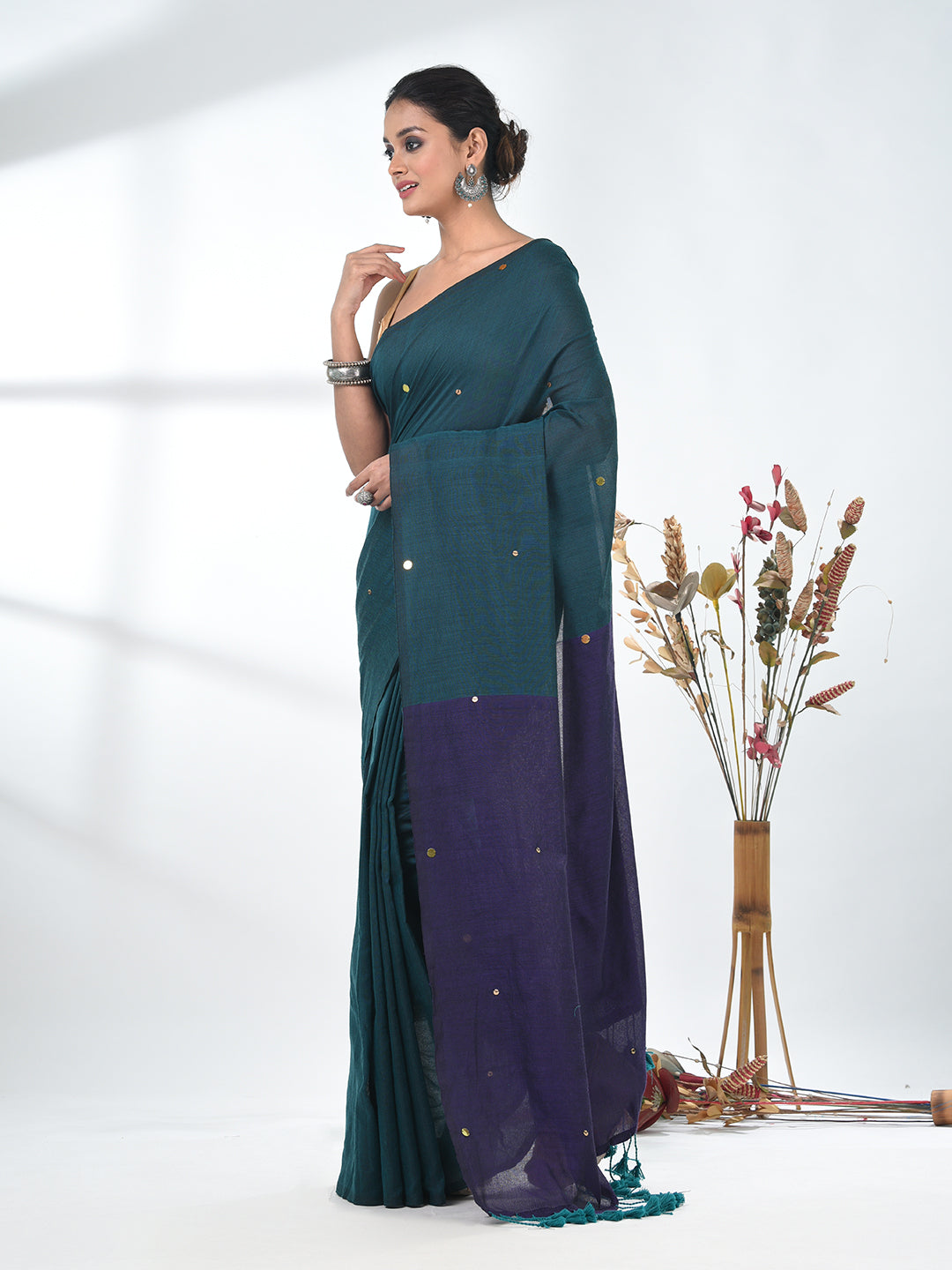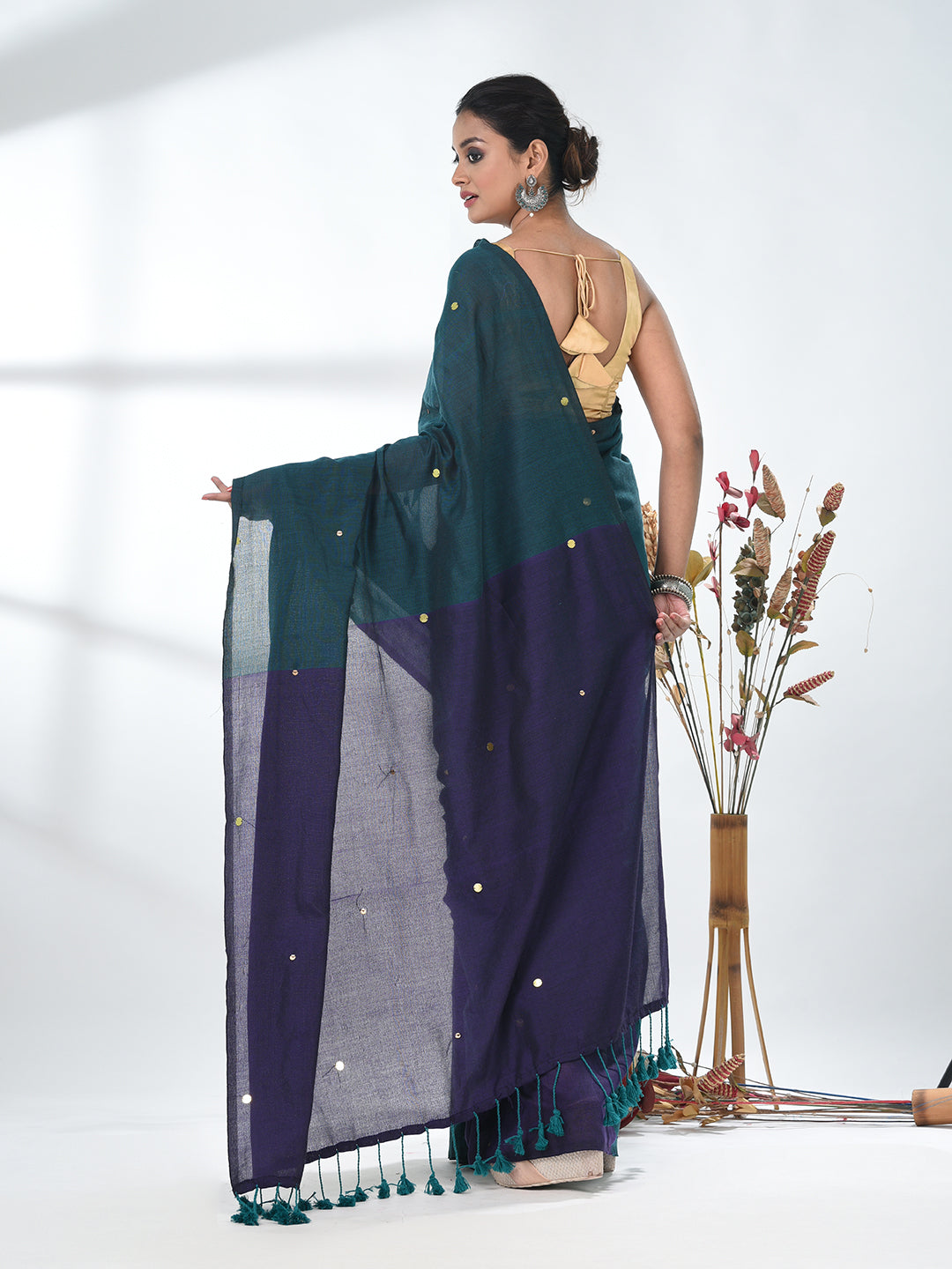 Teal Sequin-Detail Plain Saree with Purple Pallu