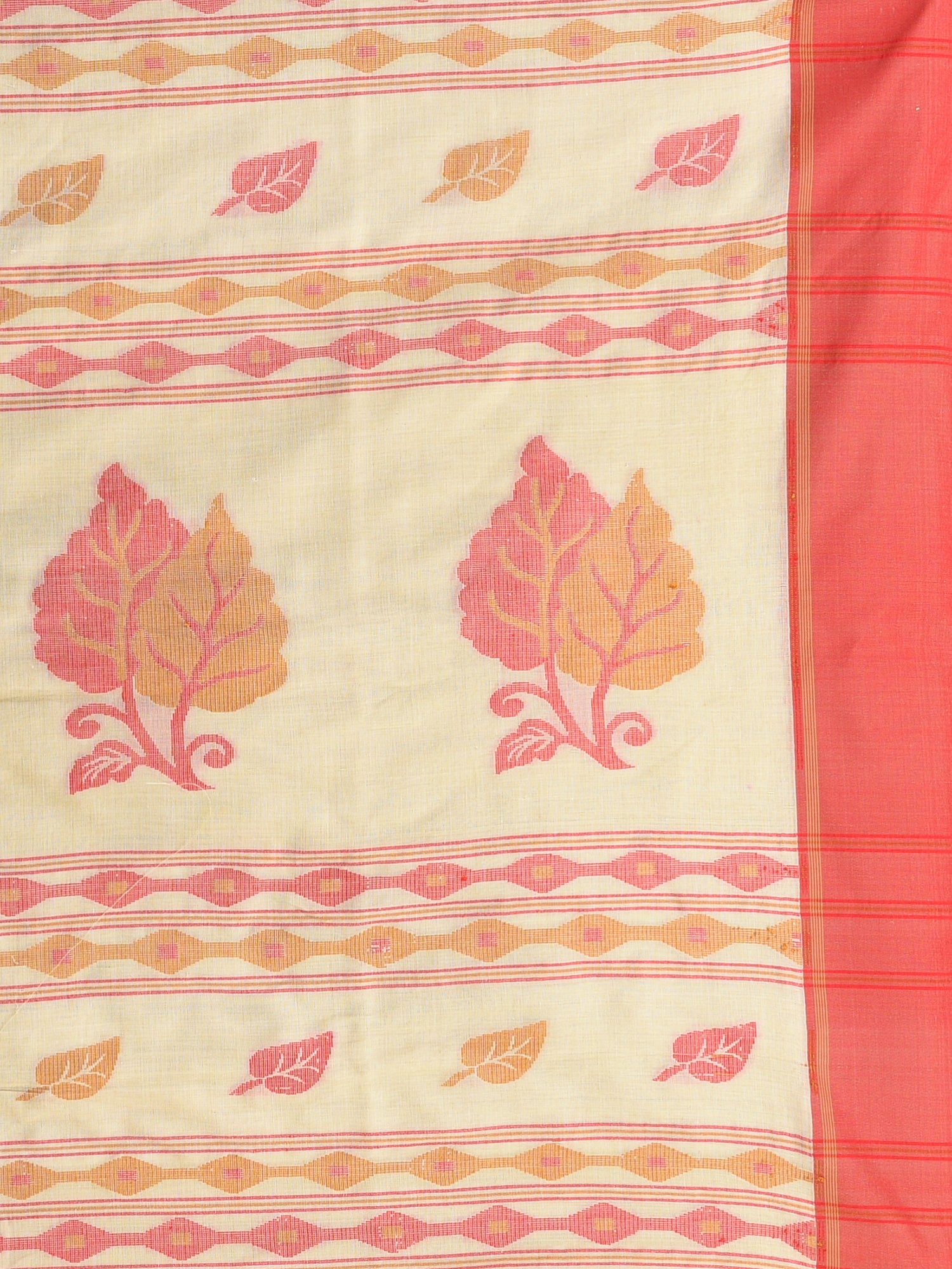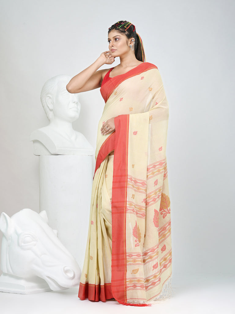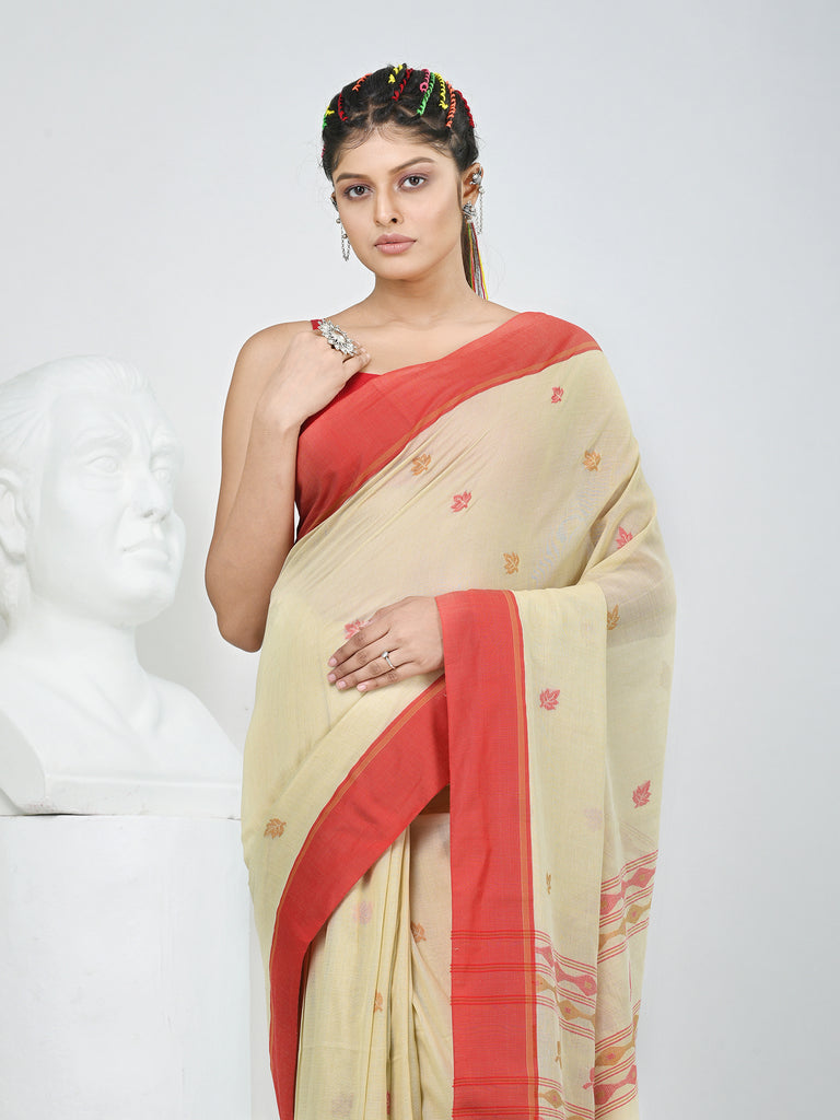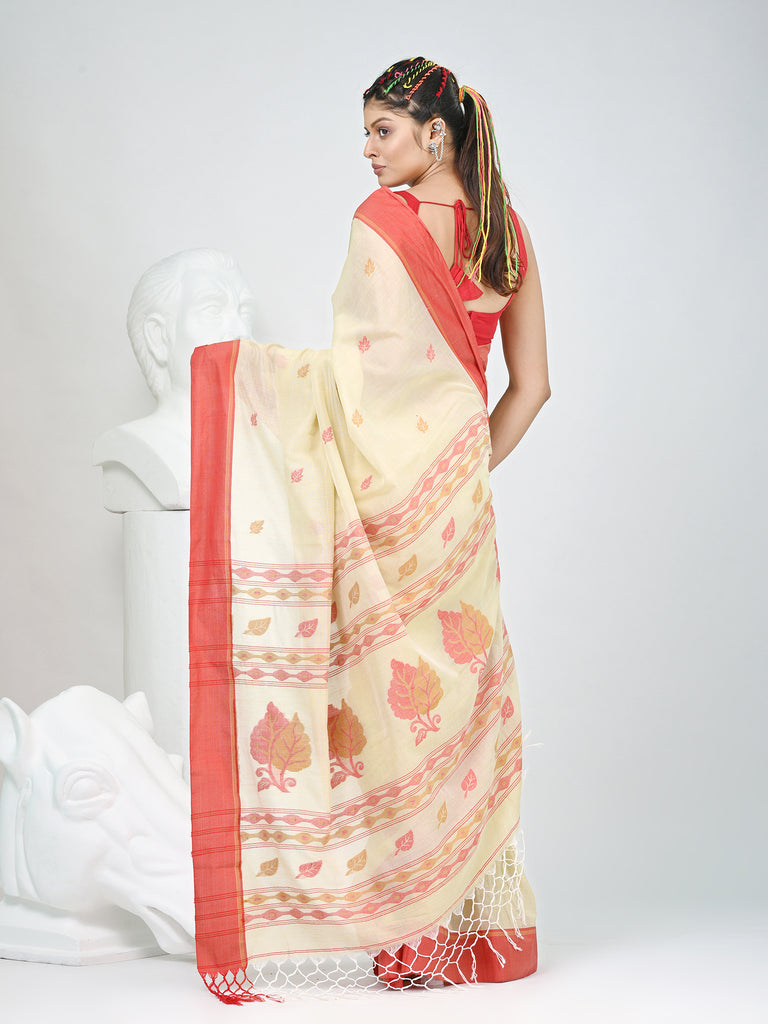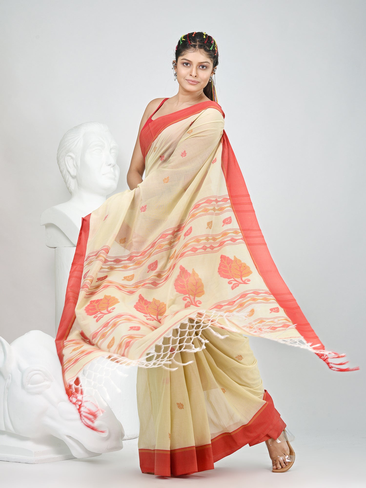 Beige Cotton Saree with Red Border & Woven Leaf Motifs