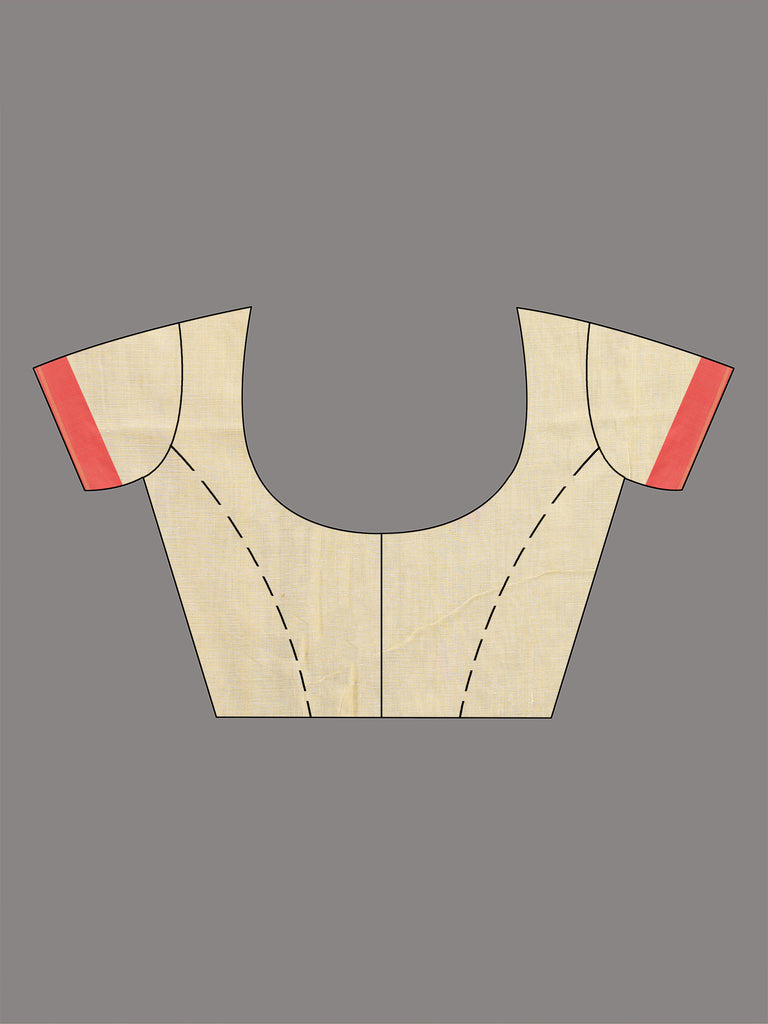 Embrace timeless elegance with this beige cotton saree, beautifully accentuated with a vibrant red border. The saree features delicate woven leaf motifs and traditional patterned detailing on the pallu, giving it a graceful and sophisticated look. Crafted from lightweight, breathable cotton, it ensures comfort along with an elegant drape. Perfect for festive occasions, office wear, and cultural gatherings, this saree is a versatile choice that blends tradition with modern charm.