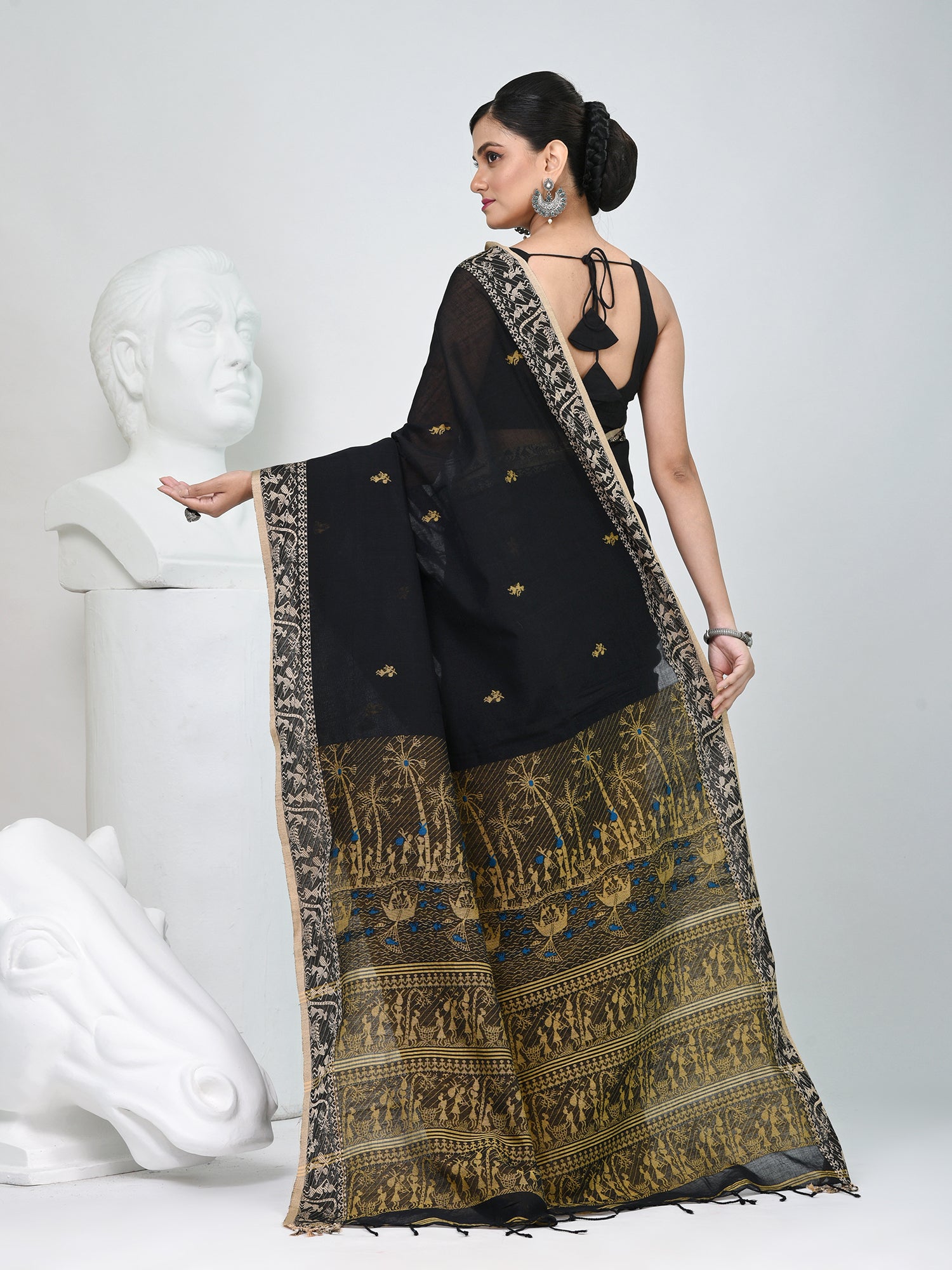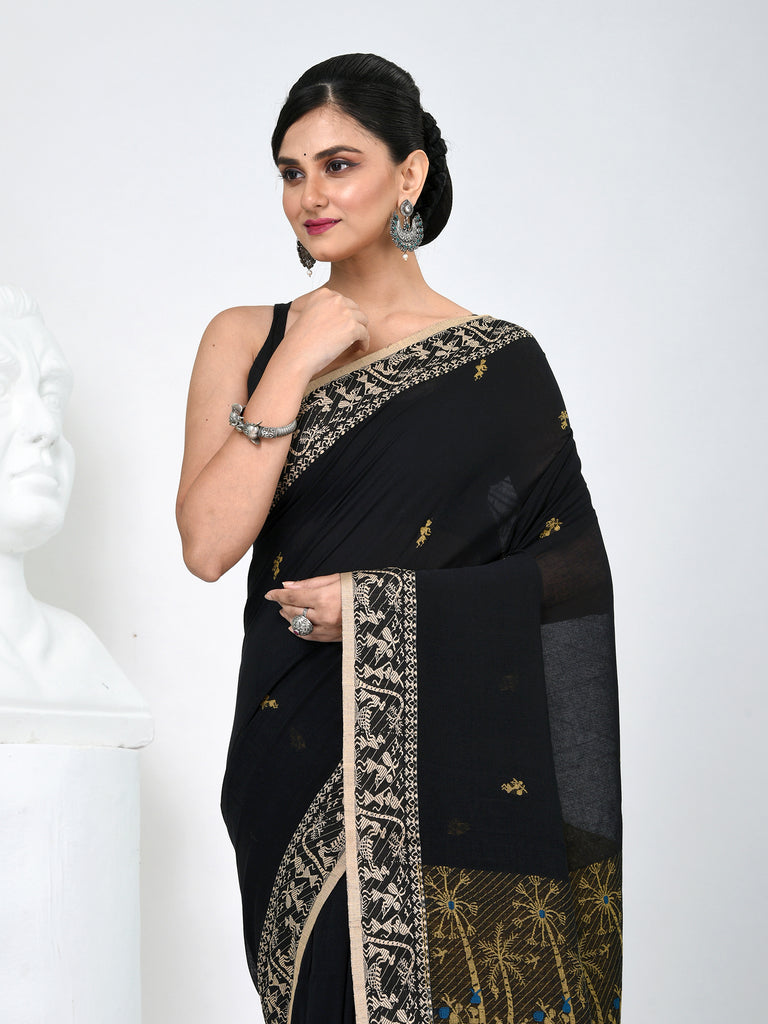 Black Cotton Saree with Beige Border And Traditional Woven Pallu