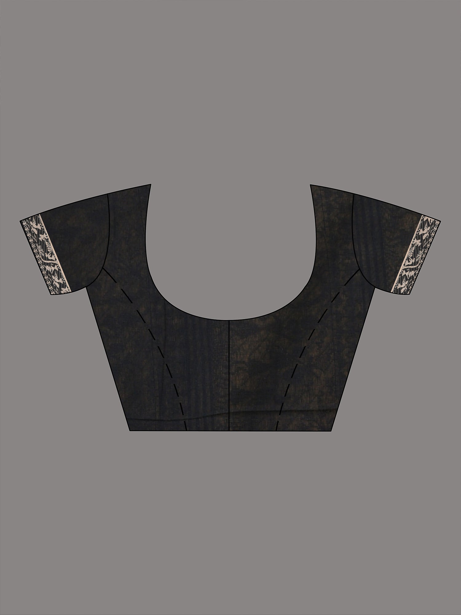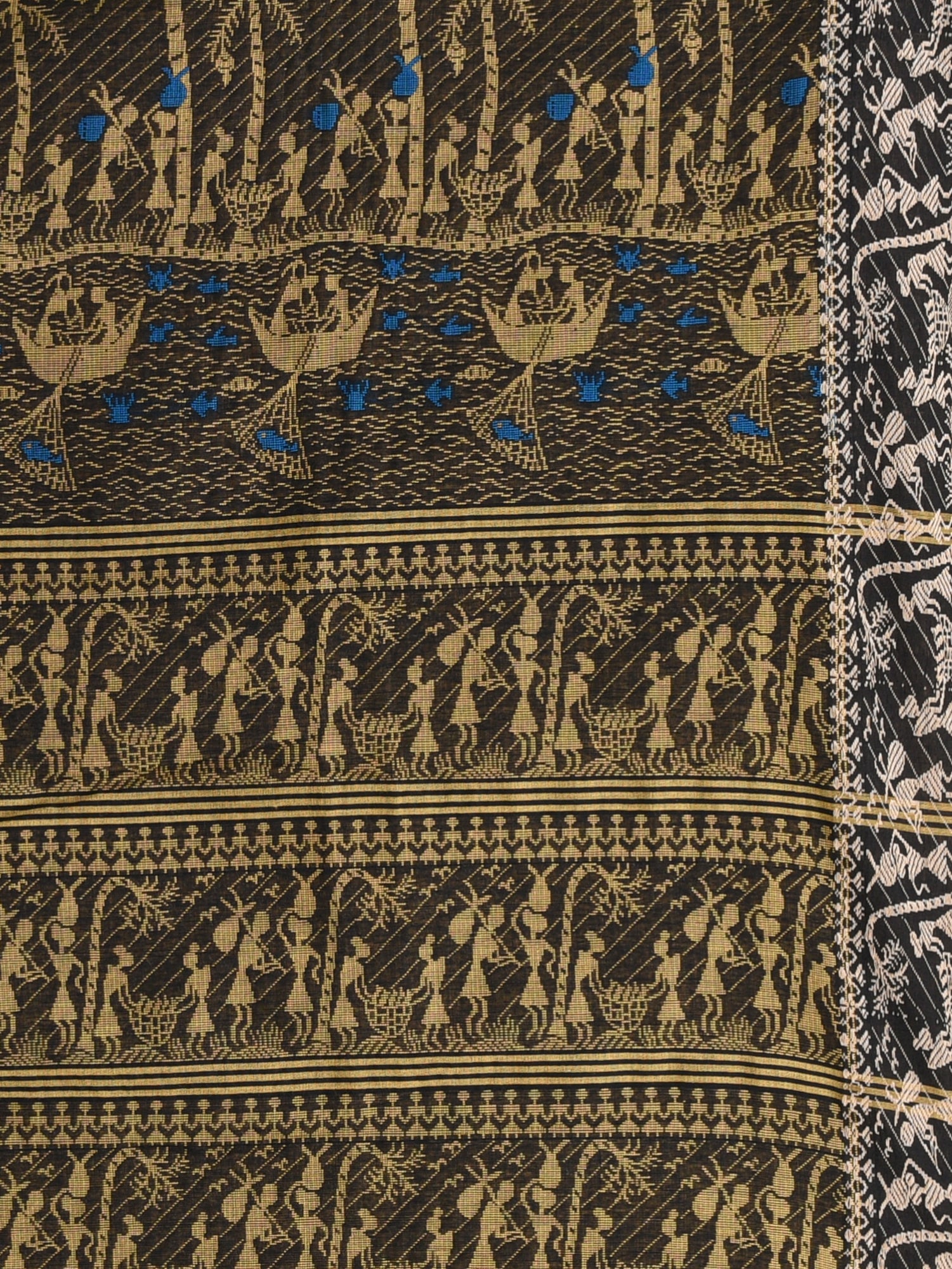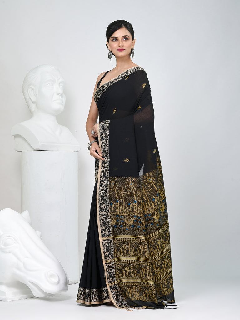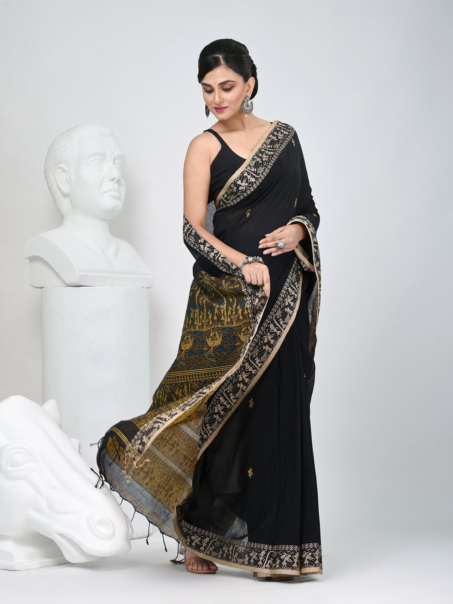 Drape yourself in heritage elegance with this black cotton saree, beautifully complemented by a beige woven border. The saree features intricate traditional patterns on the pallu, depicting artistic motifs and storytelling weaves that highlight rich craftsmanship. Made from soft, breathable cotton, it ensures all-day comfort while maintaining a sophisticated drape. Perfect for festive occasions, cultural events, and traditional gatherings, this saree adds timeless grace to your ethnic wardrobe.