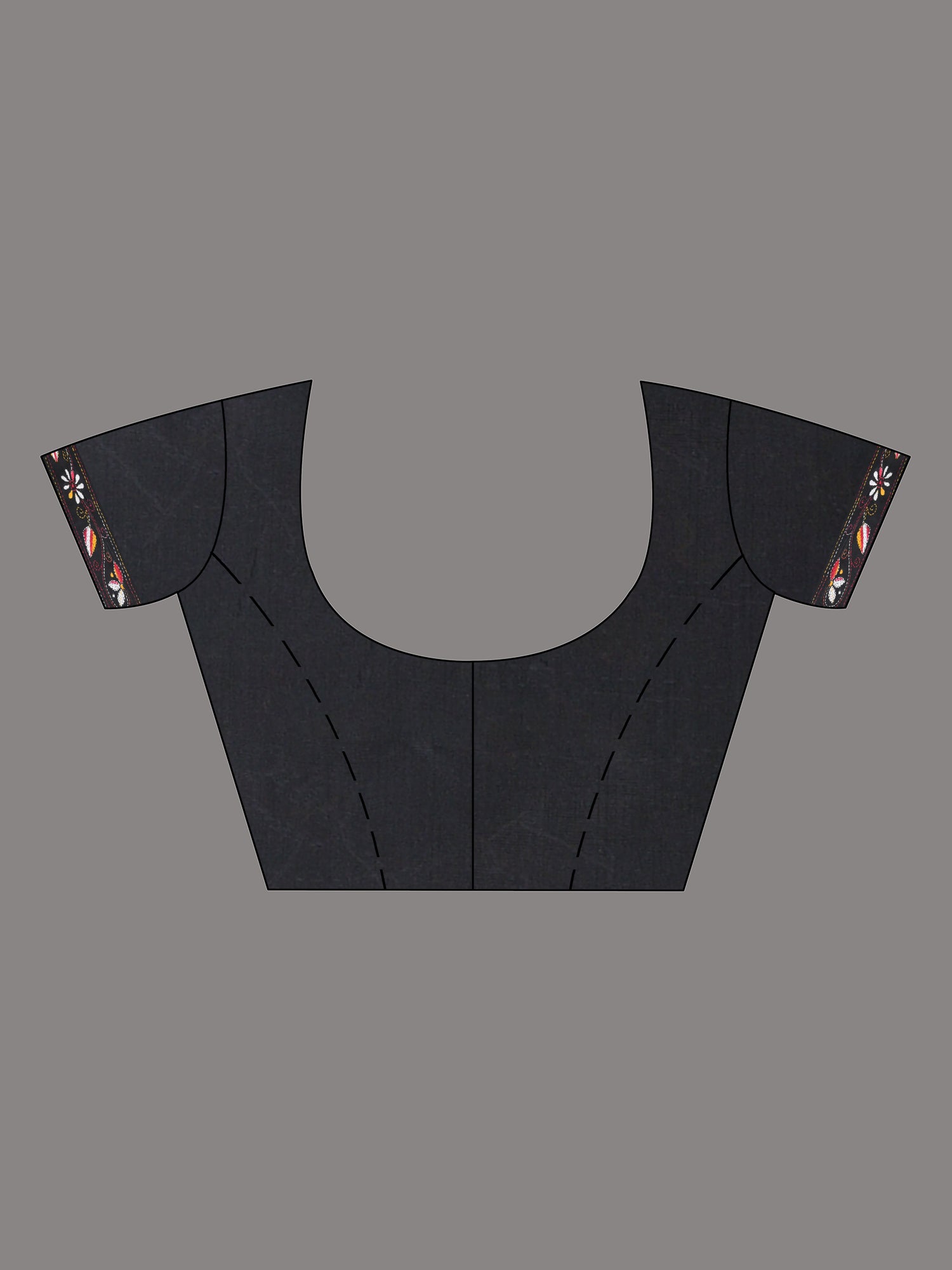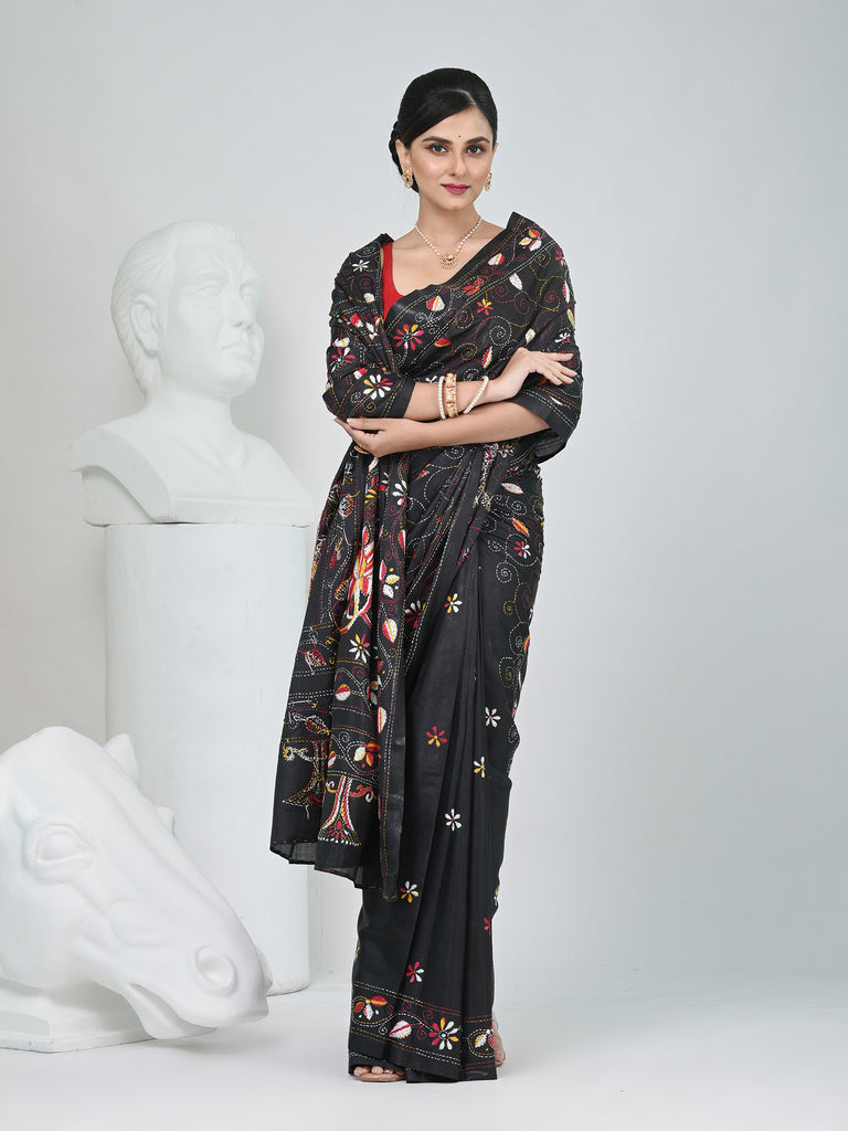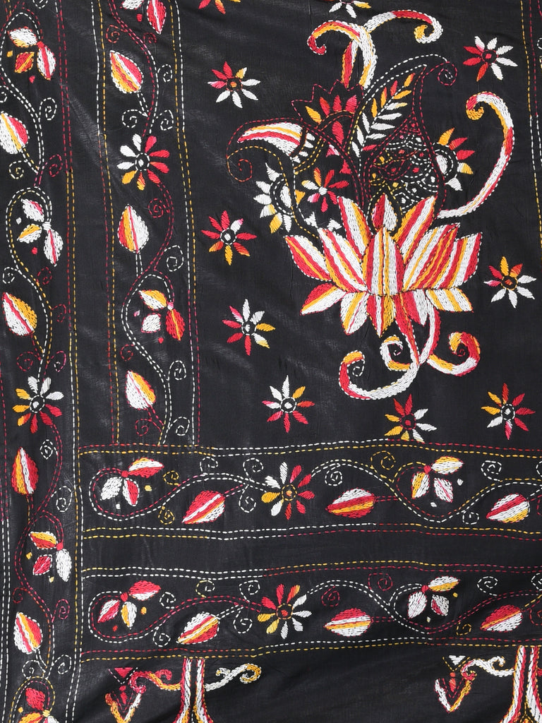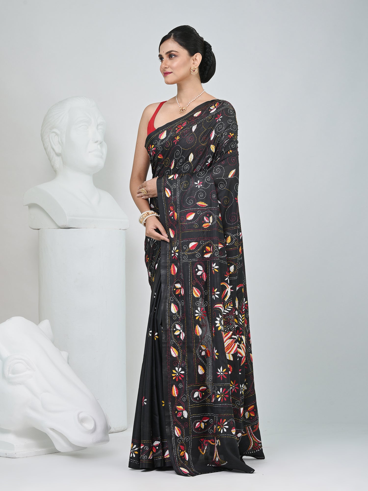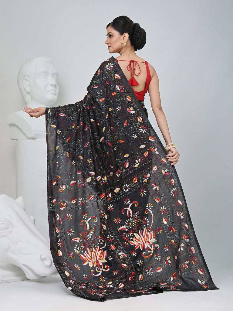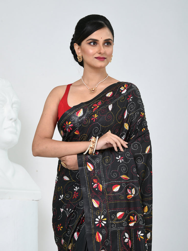 Black Silk Kantha Stitch Saree with Multicolor Thread Work