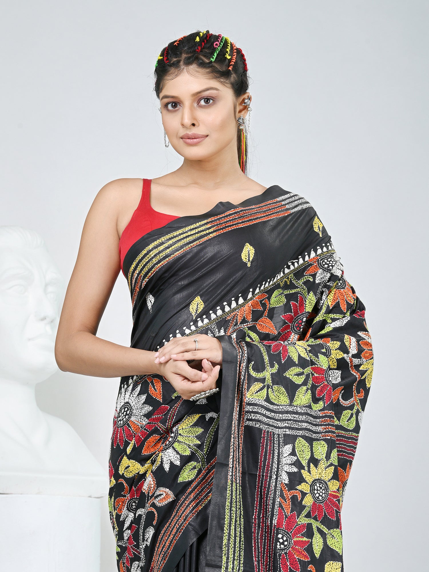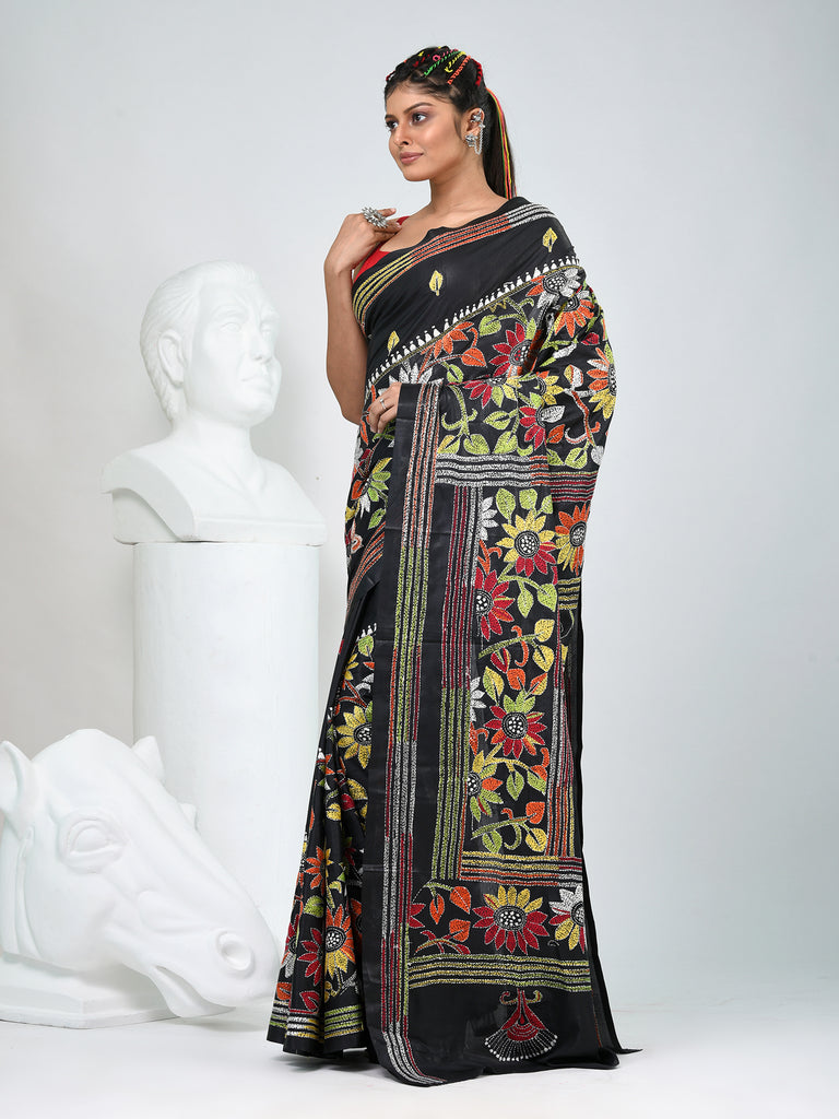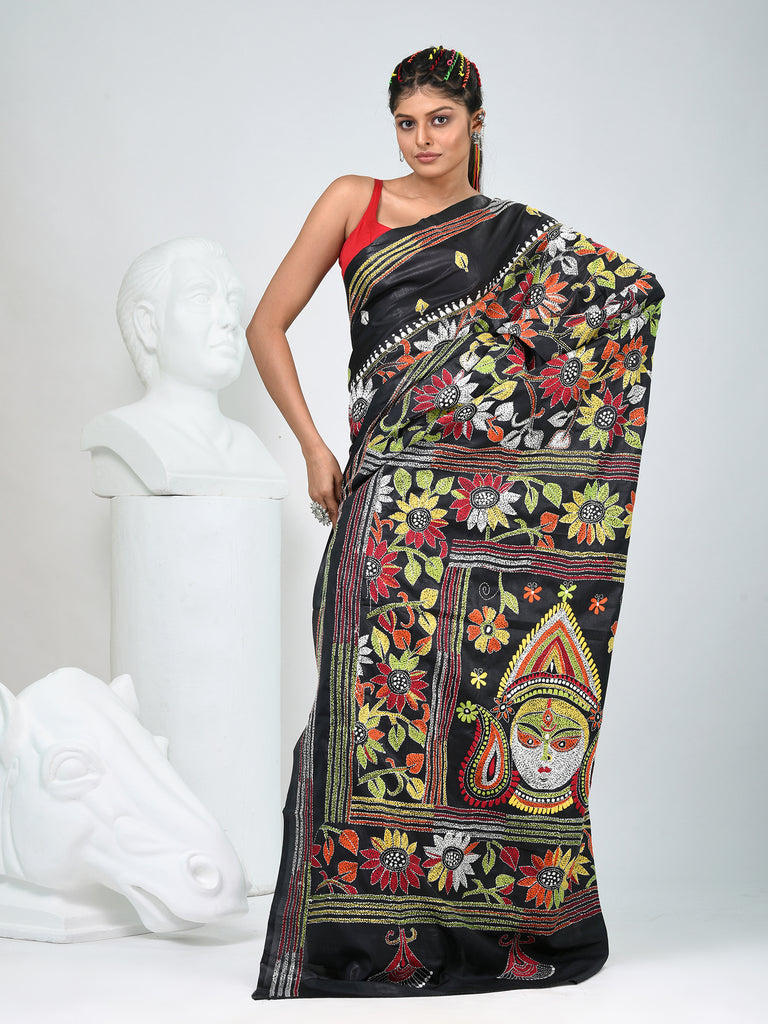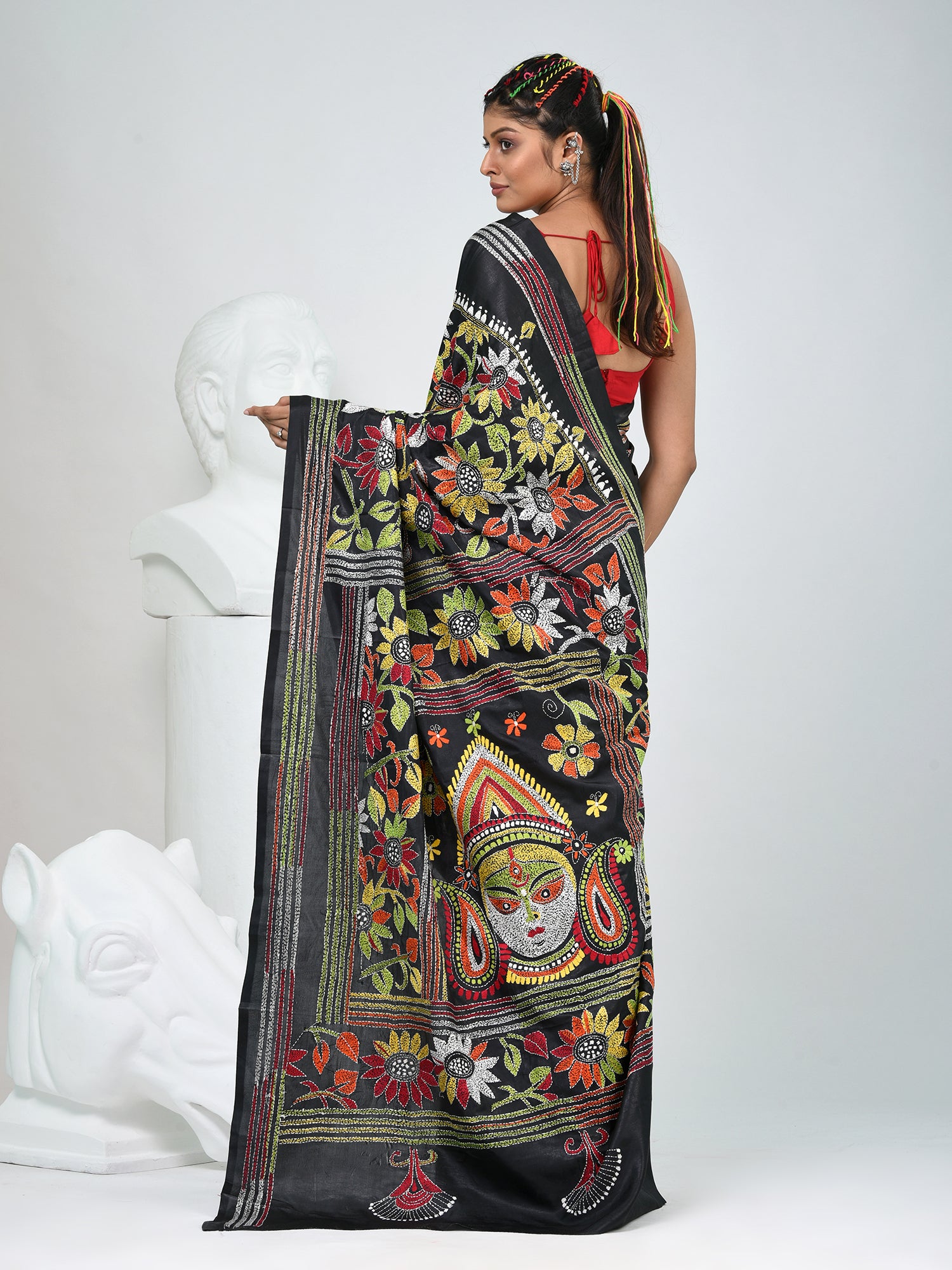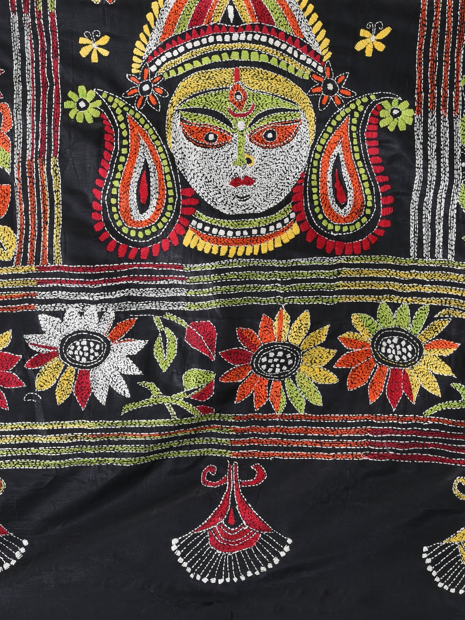 Black Silk Kantha Work Saree with Durga Motif and Floral Thread Work