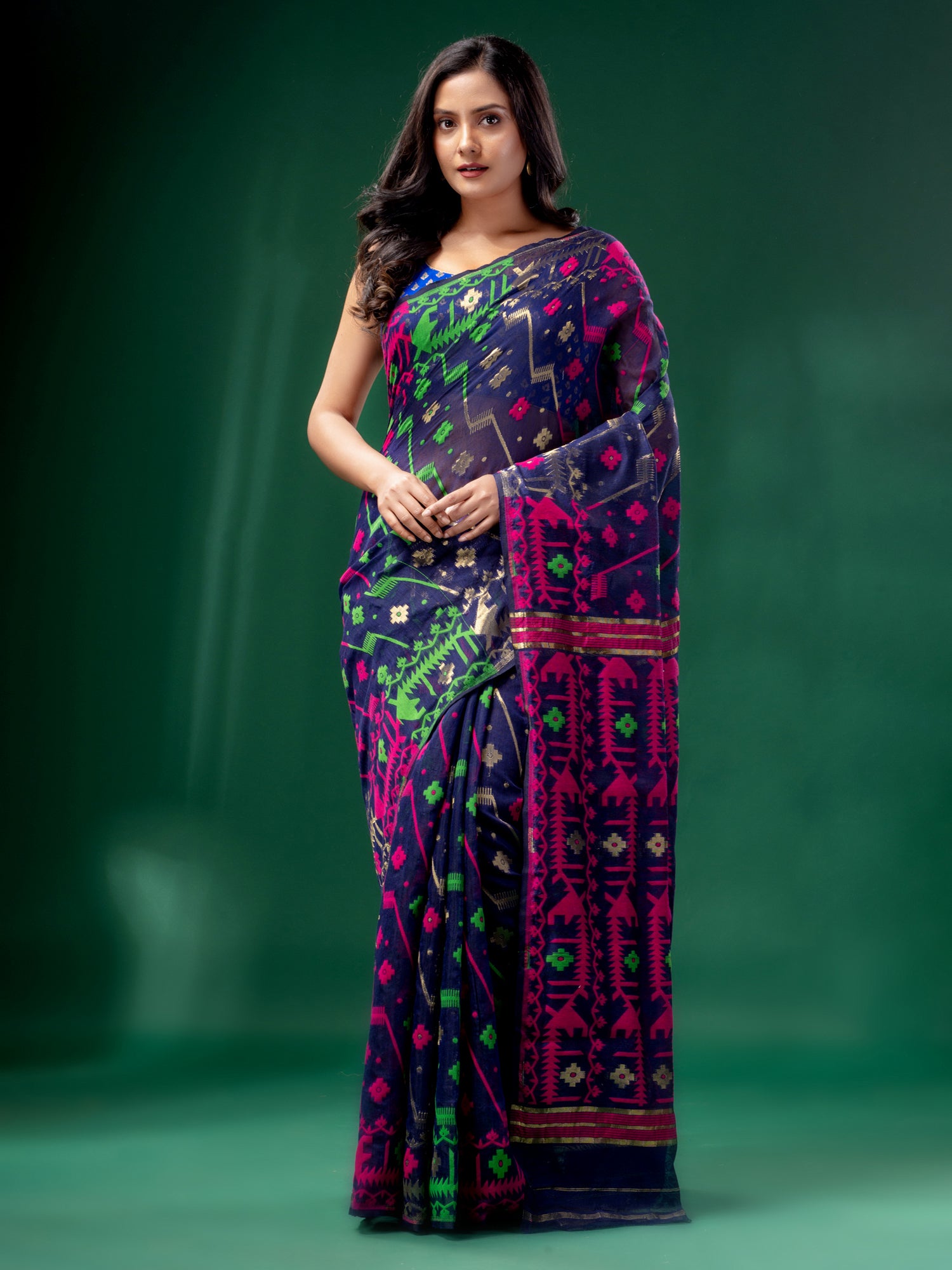 Get ready for your parties in this blue cotton silk jamdani saree. It has beautiful patterns woven with thread all over including the pallu. It accompanies woven border that bring the whole look together.