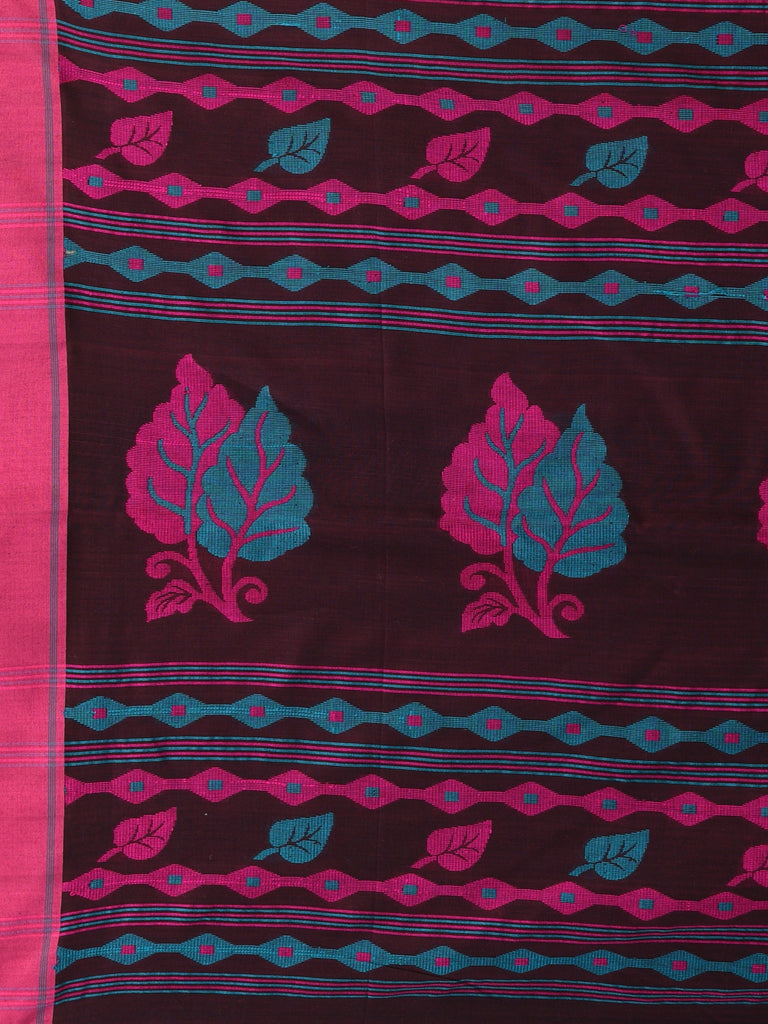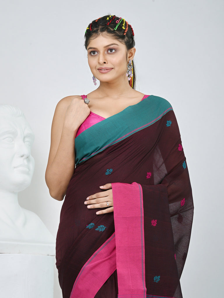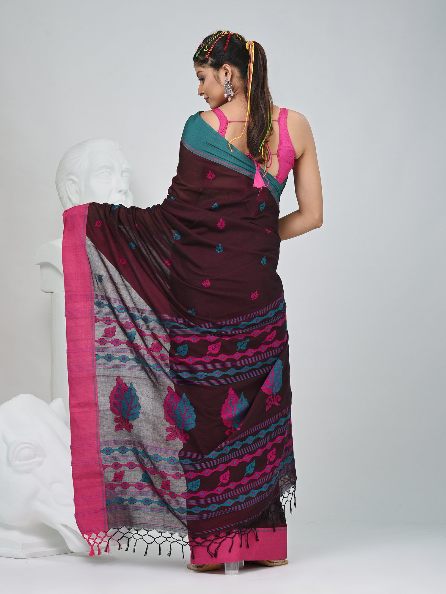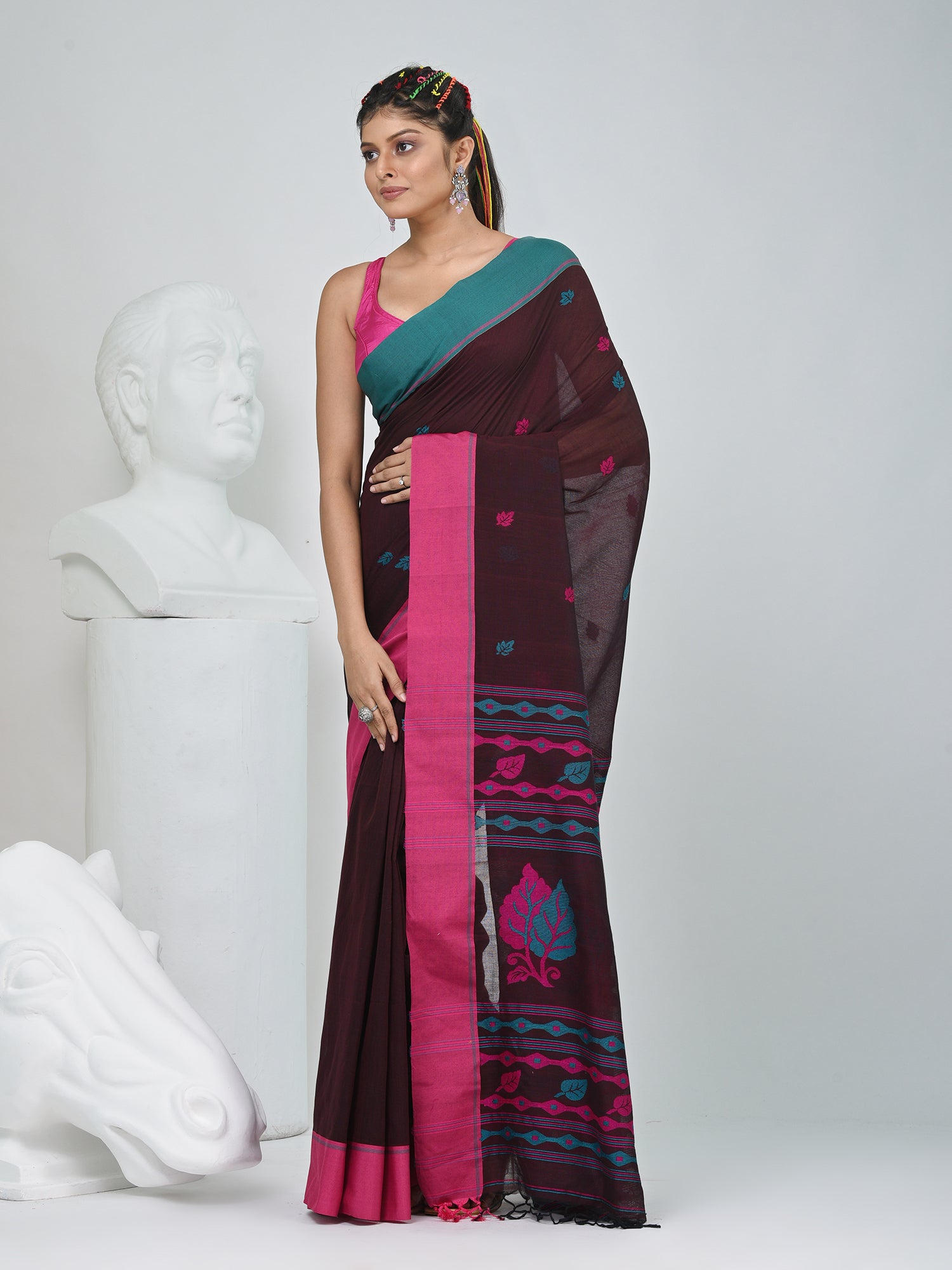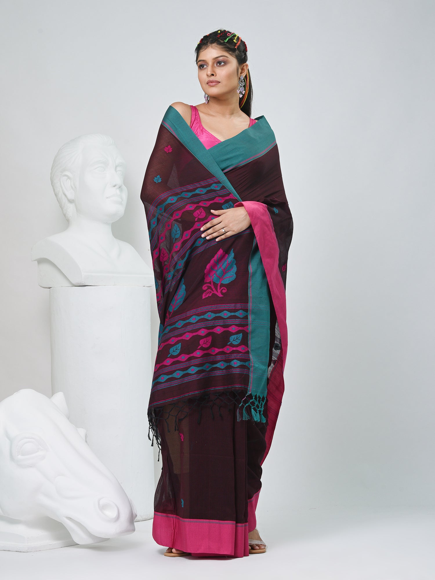 Brown Cotton Saree with Pink And Teal Border & Leaf Design