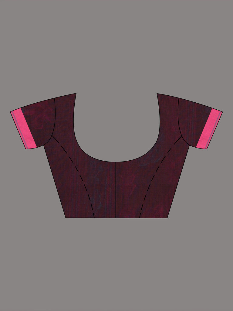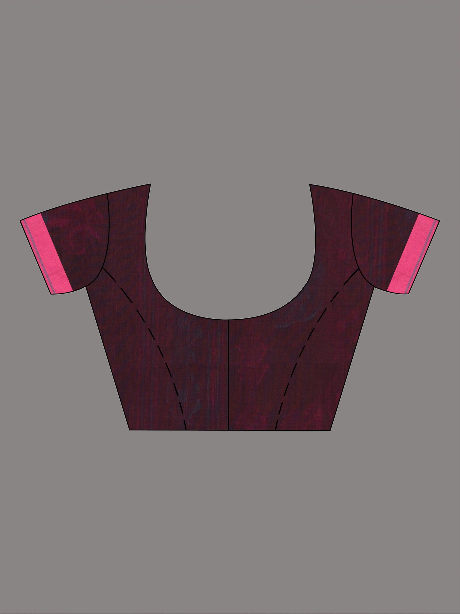Add a vibrant touch to your ethnic collection with this elegant brown cotton saree, beautifully contrasted with a pink and teal border. The saree features woven leaf motifs and patterned detailing on the pallu, giving it a perfect blend of tradition and contemporary style. Made from soft, breathable cotton, it drapes comfortably and is ideal for festive occasions, office wear, or casual gatherings. The touch of teal-green accent on the pallu further enhances its charm, making it a versatile addition to your wardrobe.